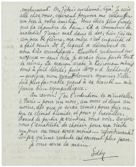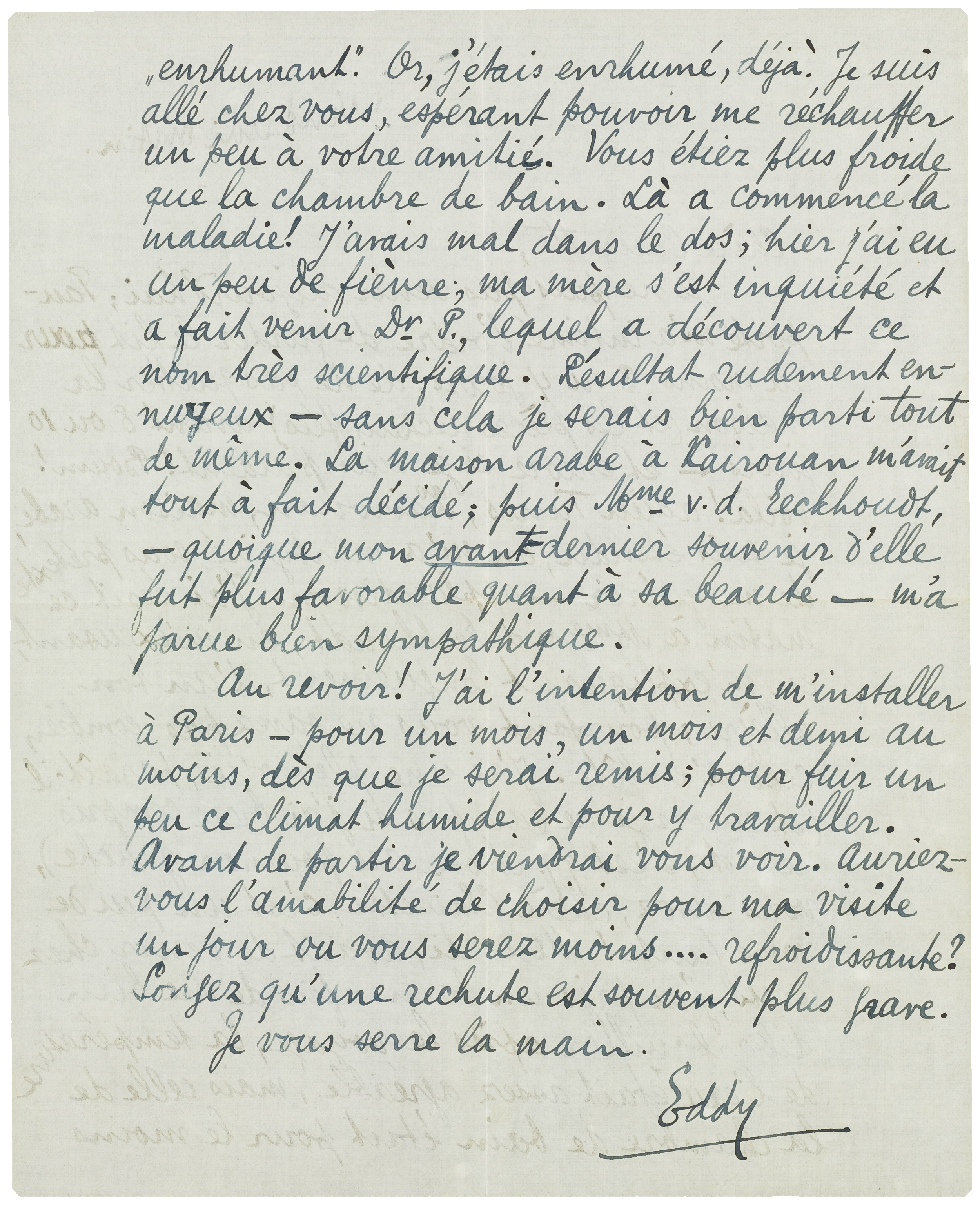 Au revoir! J'ai l'intention de m'installer à Paris - pour un mois, un mois et demi au moins, dès que je serai remis; pour fuir un peu ce climat humide et pour y travailler. Avant de partir je viendrai vous voir. Auriez-vous l'amabilité de choisir pour ma visite un jour ou vous serez moins.... refroidissante? Songez qu'une rechute est souvent plus grave.