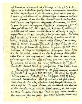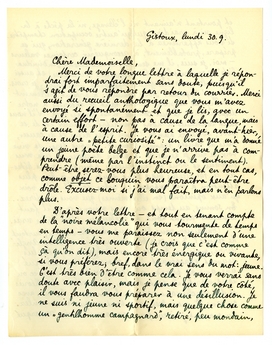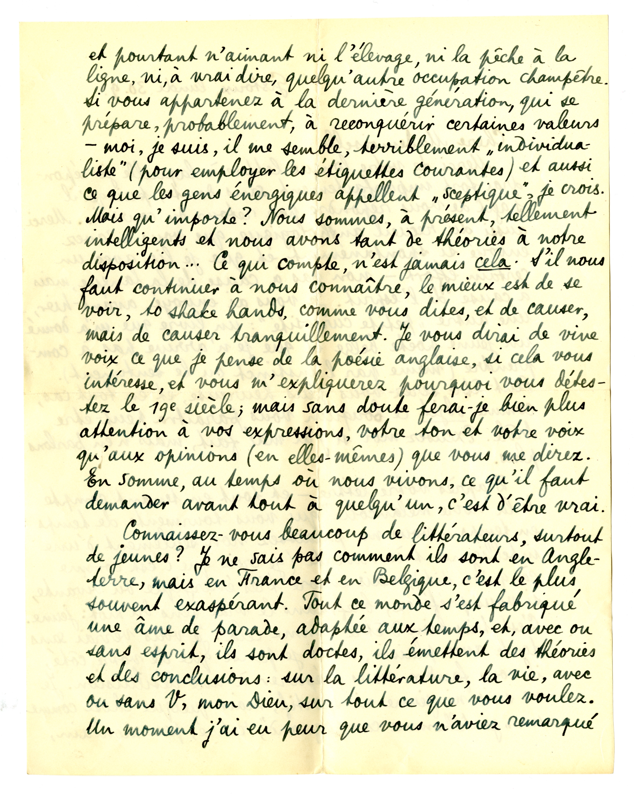 D'après votre lettre - et tout en tenant compte de la ‘noire mélancolie’ qui vous tourmente de temps en temps - vous me paraissez non seulement d'une intelligence très ouvert (je crois que c'est comme çà qu'on dit), mais encore très énergique ou vivante, si vous préférez; bref, dans le vrai sens du mot: jeune. C'est très bien d'être comme cela. Je vous verrai sans doute avec plaisir, mais je pense que de votre côté, il vous faudra préparer à une désillusion. Je ne suis ni jeune ni sportif, mais quelque chose comme un ‘gentilhomme campagnard’, retiré, peu mondain, et pourtant n'aimant ni l'élevage, ni la pêche à la ligne, ni, à vrai dire, quelqu'autre occupation champêtre. Si vous appartenez à la dernière génération, qui se prépare, probablement, à reconquérir certaines valeurs - moi, je suis, il me semble, terriblement ‘individualiste’ (pour employer les étiquettes courantes) et aussi ce que les gens énergiques appellent ‘sceptique’, je crois. Mais qu'importe? Nous sommes, à présent, tellement intelligents et nous avons tant de théories à notre disposition... Ce qui compte, n'est jamais cela. S'il nous faut continuer à nous connaître, le mieux est de se voir, to shake hands, comme vous dites, et de causer, mais de causer tranquillement. Je vous dirai de vive voix ce que je pense de la poésie anglaise, si cela vous intéresse, et vous m'expliquerez pourquoi vous détestez le 19e siècle; mais sans doute ferai-je bien plus attention à vos expressions, votre ton et votre voix qu'aux opinions (en elles-mêmes) que vous me direz. En somme, au temps où nous vivons, ce qu'il faut demander avant tout à quelqu'un, c'est d'être vrai.