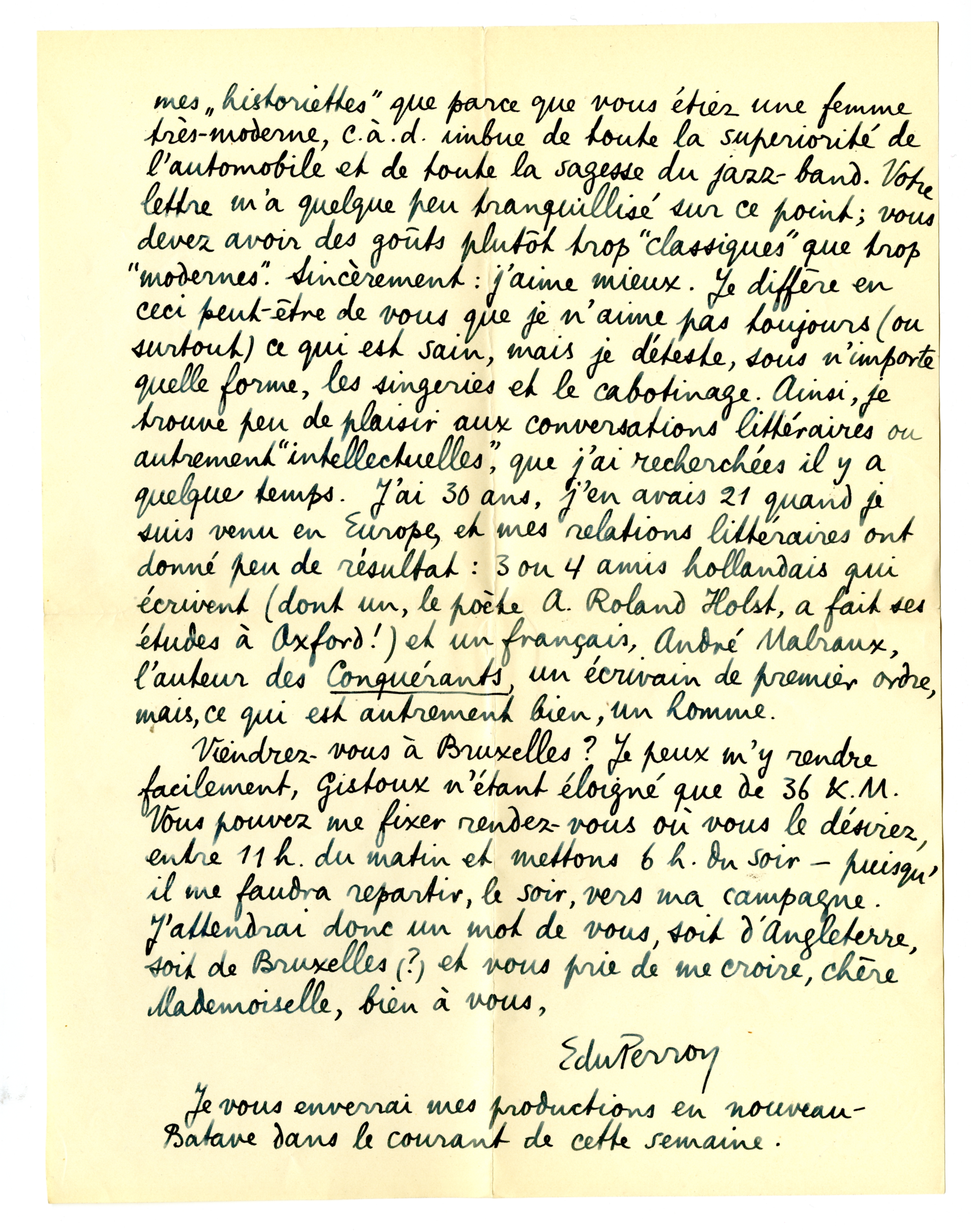 Connaissez-vous beaucoup de littérateurs, surtout de jeunes? Je ne sais pas comment ils sont en Angleterre, mais en France et en Belgique, c'est le plus souvent exaspérant. Tout ce monde s'est fabriqué une âme de parade, adaptée aux temps, et, avec ou sans esprit, ils sont doctes, ils émettent des théories et des conclusions: sur la littérature, la vie, avec ou sans V, mon Dieu, sur tout ce que vous voulez. Un moment j'ai eu peur que vous n'aviez remarqué mes ‘historiettes’ que parce que vous étiez une femme très moderne, c.à.d. imbue de toute la superiorité de l'automobile et de toute la sagesse du jazz-band. Votre lettre m'a quelque peu tranquillisé sur ce point; vous devez avoir des goûts plutôt trop ‘classiques’ que trop ‘modernes’. Sincèrement: j'aime mieux. Je diffère en ceci peut-être de vous que je n'aime pas toujours (ou surtout) ce qui est sain, mais je déteste, sous n'importe quelle forme, les singeries et le cabotinage. Ainsi, je trouve peu de plaisir aux conversations littéraires ou autrement ‘intellectuelles’, que j'ai recherchées il y a quelque temps. J'ai 30 ans, j'en avais 21 quand je suis venu en Europe, et mes relations littéraires ont donné peu de résultat: 3 ou 4 amis hollandais qui écrivent (dont un, le poète A. Roland Holst, a fait ses études à Oxford!) et un français, André Malraux, l'auteur des Conquérants, un écrivain de premier ordre, mais, ce qui est autrement bien, un homme.