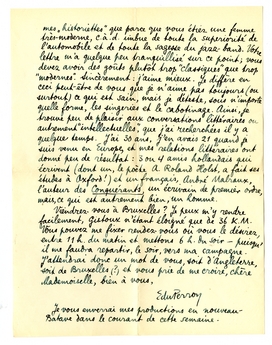 Viendrez-vous à Bruxelles? Je peux m'y rendre facilement, Gistoux n'étant éloigné que de 36 K.M. Vous pouvez me fixer rendez-vous où vous le désiriez, entre 11 h. du matin et mettons 6 h. du soir - puisqu'il me faudra repartir, le soir, vers ma campagne. J'attendrai donc un mot de vous, soit de l'Angleterre, soit de Bruxelles (?) et vous prie de me croire, chère Mademoiselle, bien à vous,
