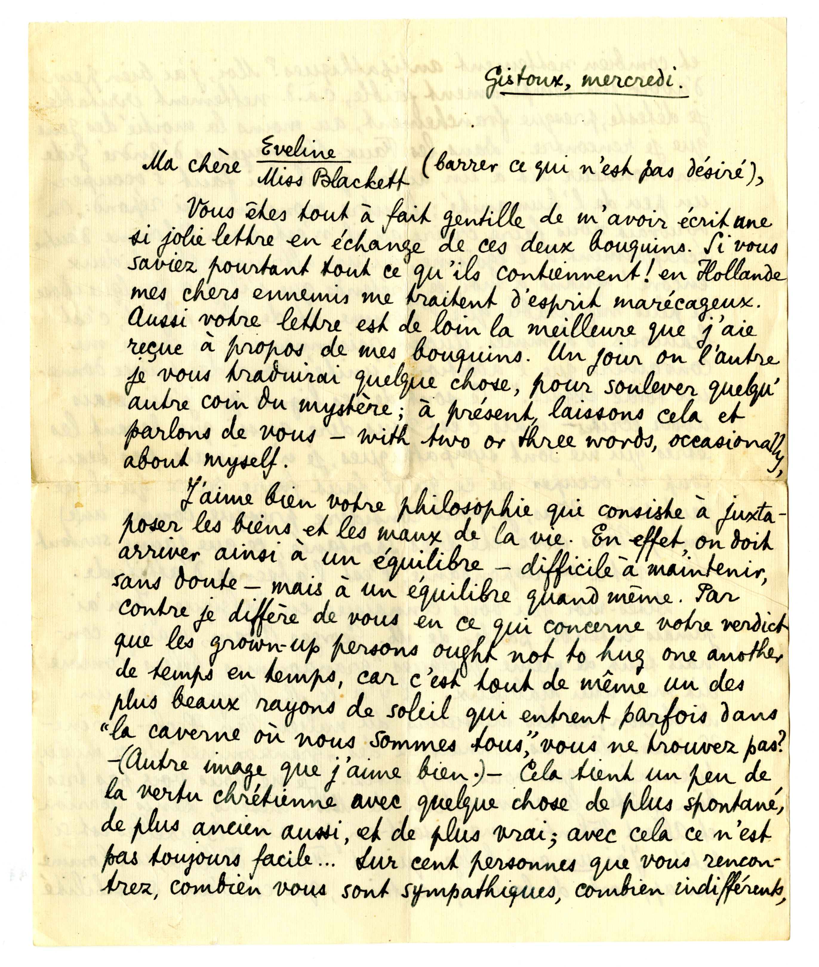 J'aime bien votre philosophie qui consiste à juxtaposer les biens et les maux de la vie. En effet, on doit arriver ainsi à un équilibre - difficile à maintenir, sans doute - mais à un équilibre quand même. Par contre je diffère de vous en ce qui concerne votre verdict que les grown-up persons ought not to hug one another de temps en temps, car c'est tout de même un des plus beaux rayons de soleil qui entrent parfois dans ‘la caverne où nous sommes tous’, vous ne trouvez pas? - (Autre image que j'aime bien.) - Cela tient un peu de la vertu chrétienne avec quelque chose de plus spontané, de plus ancien aussi, et de plus vrai; avec cela ce n'est pas toujours facile... Sur cent personnes que vous rencontrez, combien vous sont sympathiques, combien indifférents, et combien nettement antipathiques? Moi, j'ai bien peur d'avoir un tempérament faible, c.à.d. nettement irritable; je déteste, presque franchement, au moins la moitié des gens que je rencontre. Dans les Faux-Monnayeurs d'André Gide un monsieur dit à un autre qu'il lui faut s'occuper un peu de l'humanité; l'autre monsieur lui répond: ‘On voudrait nous faire croire qu'il n'est pour l'homme d'autre échappement à l'égoisme, qu'un altruisme plus hideux encore! Quant à moi, je prétends que s'il y a quelque chose de plus méprisable que l'homme, et de plus abject, c'est beaucoup d'hommes. Aucun raisonnement ne saura me convaincre que l'addition d'unités sordides puisse donner un total exquis.’ Ce sont de ces lignes que j'aimerais avoir écrites - mais c'est vous dire aussi que devant les êtres qui me sont sympathiques, je n'aimerais pas beaucoup m'occuper de ce qu'il faut faire ou ce qu'il ne faut pas. Vous, je vous considère presque comme un(e) ami(e). Vous avez été très spontanée; ce que je j'aime surtout dans votre correspondance, c'est l'absence d'attitude.