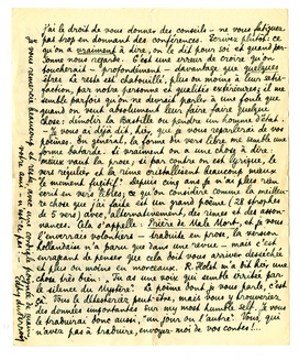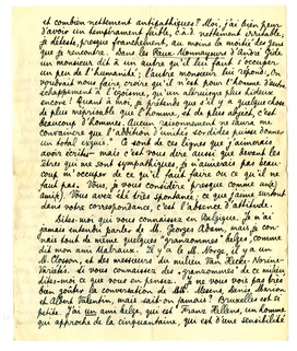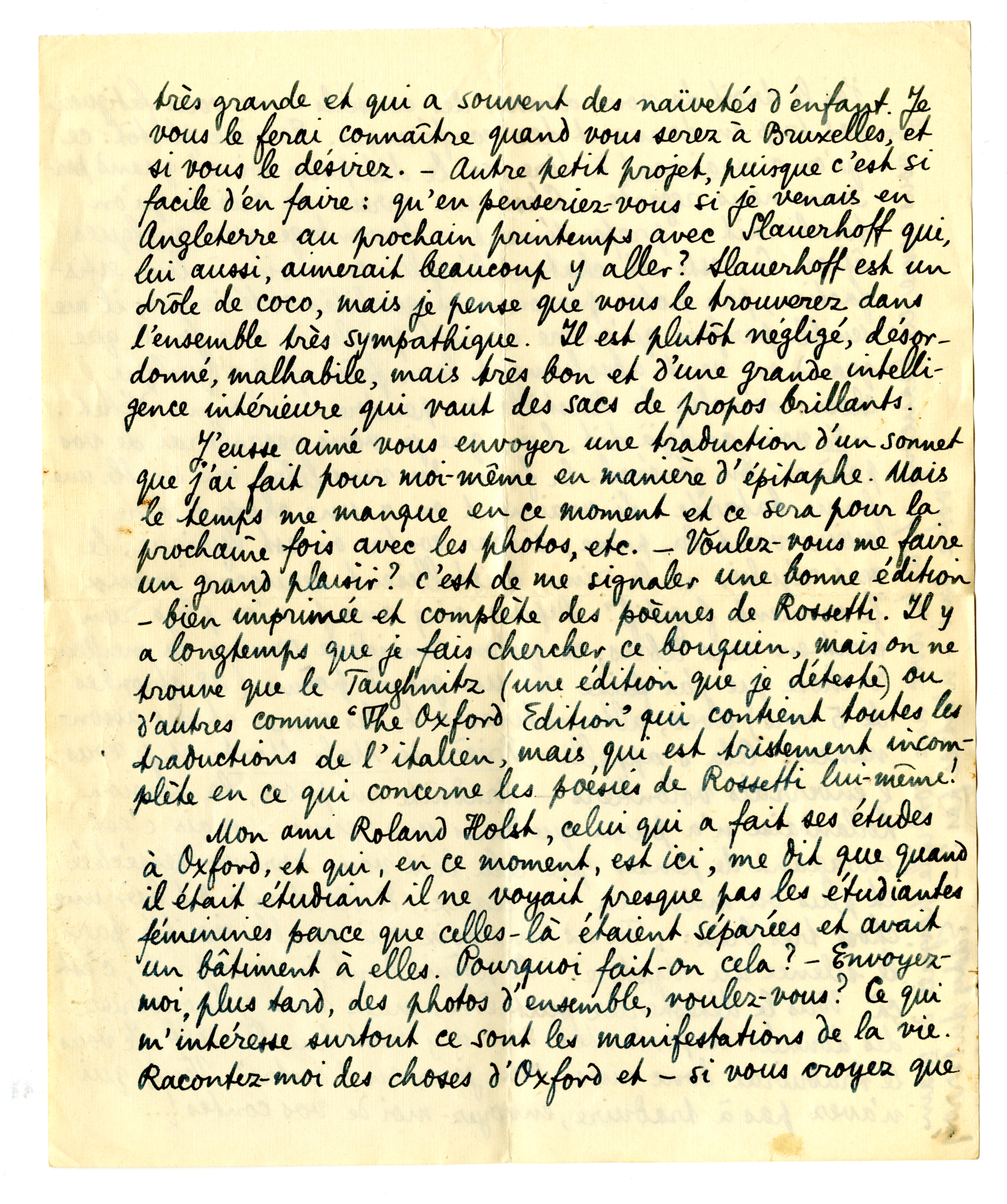 J'eusse aimé vous envoyer une traduction d'un sonnet que j'ai fait pour moi-même en manière d'epitaphe. Mais le temps me manque en ce moment et ce sera pour la prochaine fois avec les· photos, etc. - Voulez-vous me faire un grand plaisir? c'est de me signaler une bonne édition - bien imprimée et complète de poèmes de Rossetti. Il y a longtemps que je fais chercher ce bouquin, mais on ne trouve que le Tauchnitz (une édition que je déteste) ou d'autres comme ‘The Oxford Edition’ qui contient toutes les traductions de l'italien, mais qui est tristement incomplète en ce qui concerne les poésies de Rossetti lui-même!
