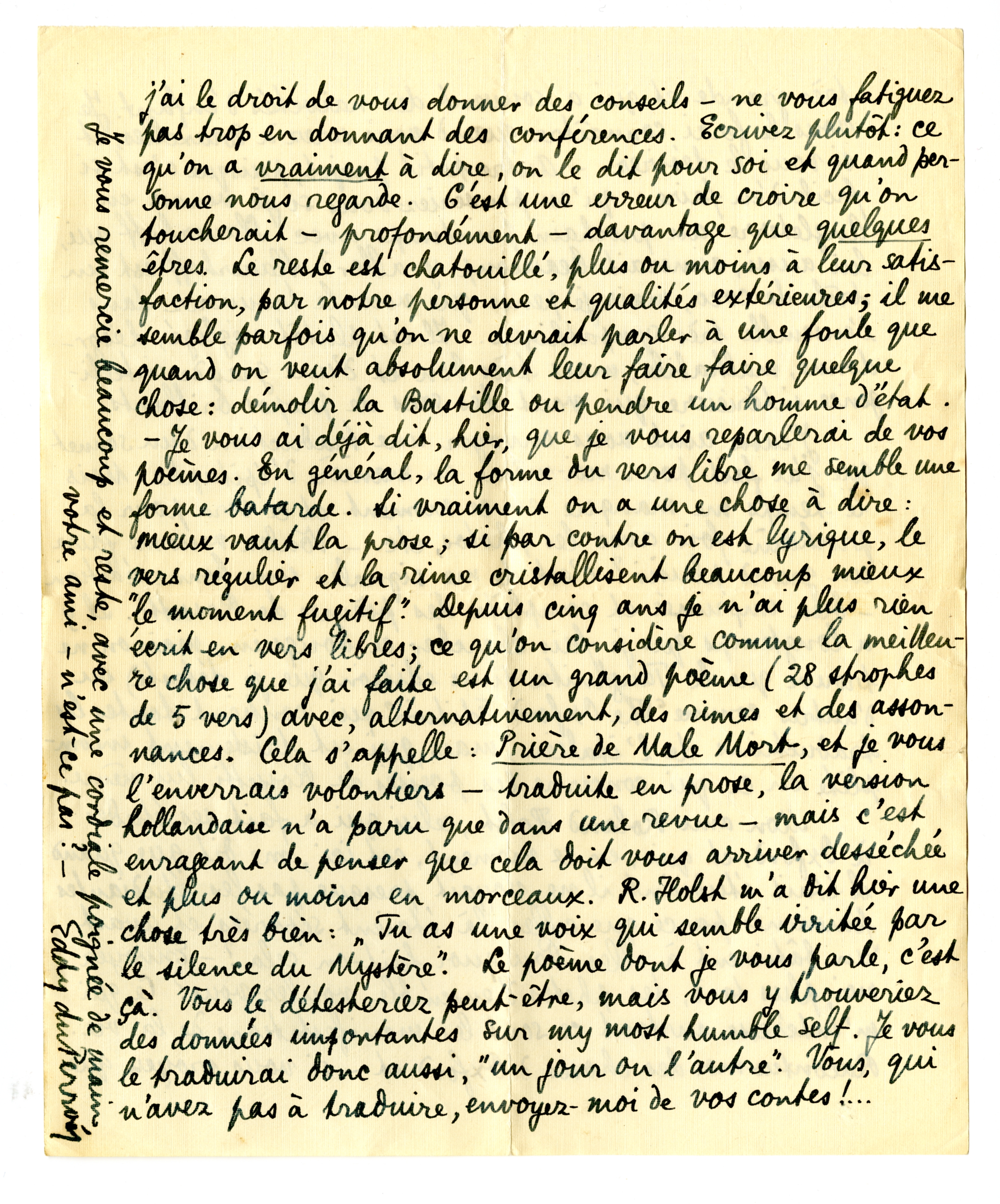- Je vous ai déjà dit, hier, que je vous reparlerai de vos poèmes. En général, la forme du vers libre me semble un forme bâtarde. Si vraiment on a une chose à dire: mieux vaut la prose; si par contre on est lyrique, le vers régulier et la rime cristallisent beaucoup mieux ‘le moment fugitif’. Depuis cinq ans je n'ai plus écrit rien en vers libres; ce qu'on considère comme la meilleure chose que j'ai faite est un grand poème (28 strophes de 5 vers) avec, alternativement, des rimes et des assonances. Cela s'appelle; Prière de Male Mort, et je vous l'enverrais volontiers - traduite en prose, la version hollandaise n'a paru que dans une revue - mais c'est enrageant de premier que cela doit vous arriver desséchée et plus ou moins en morceaux. R. Holst m'a dit hier un chose très bien: Tu as une voix qui semble irritée par le silence du Mystère'. Le poème dont je vous parle, c'est ça. Vous le détesteriez peut-être, mais vous y trouveriez des données importantes sur my most humble self. Je vous le traduirai donc aussi, ‘un jour ou l'autre’. Vous, qui n'avez pas à traduire, envoyez ma de vos contes!...