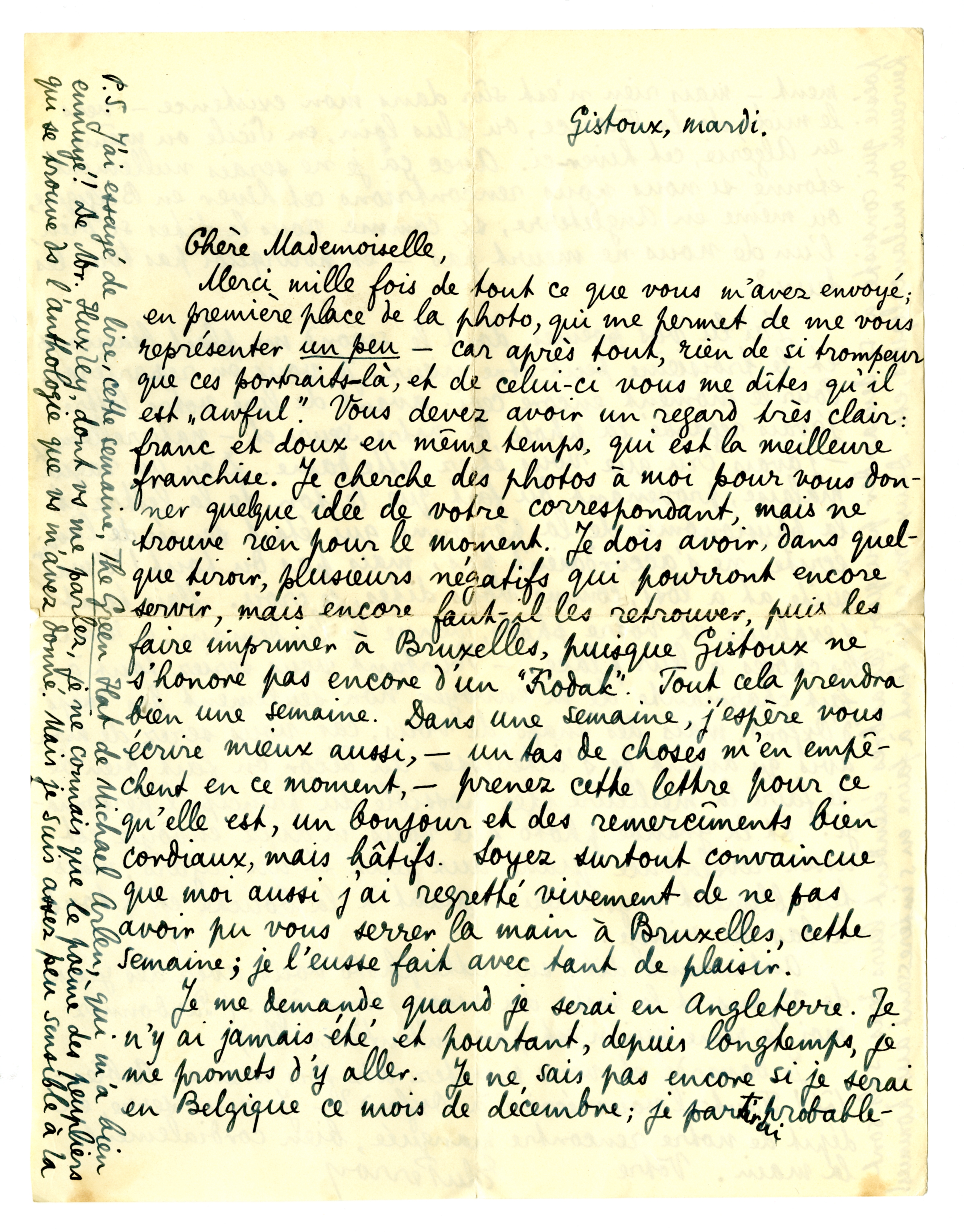 Merci mille fois de tout ce que vous m'avez envoyé; en première place de la photo qui me permet de me vous représenter un peu - car après tout, rien de si trompeur que ces portraits-là, et de celui-ci vous me dîtes qu'il est ‘awful’. Vous devez avoir un regard très clair: franc et doux en même temps, qui est la meilleure franchise. Je cherche des photos à moi pour vous donner quelque idée de votre correspondant, mais ne trouve rien pour le moment. Je dois avoir, dans quelque tiroir, plusieurs négatifs qui pourront encore servir, mais encore faut-il les retrouver, puis les faire imprimer à Bruxelles, puisque Gistoux ne s'honore pas encore d'un ‘Kodak’. Tout cela prendra bien une semaine. Dans une semaine, j'espère vous écrire mieux aussi, - un tas de choses m'empêchent en ce moment, - prenez cette lettre pour ce qu'elle est, un bonjour et des remerciements bien cordiaux, mais hâtifs. Soyez surtout convaincue que moi aussi j'ai regretté vivement de ne pas avoir pu vous serrer la main à Bruxelles, cette semaine; je l'eusse fait avec tant de plaisir.