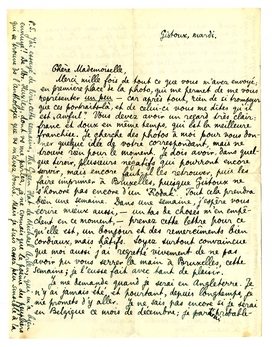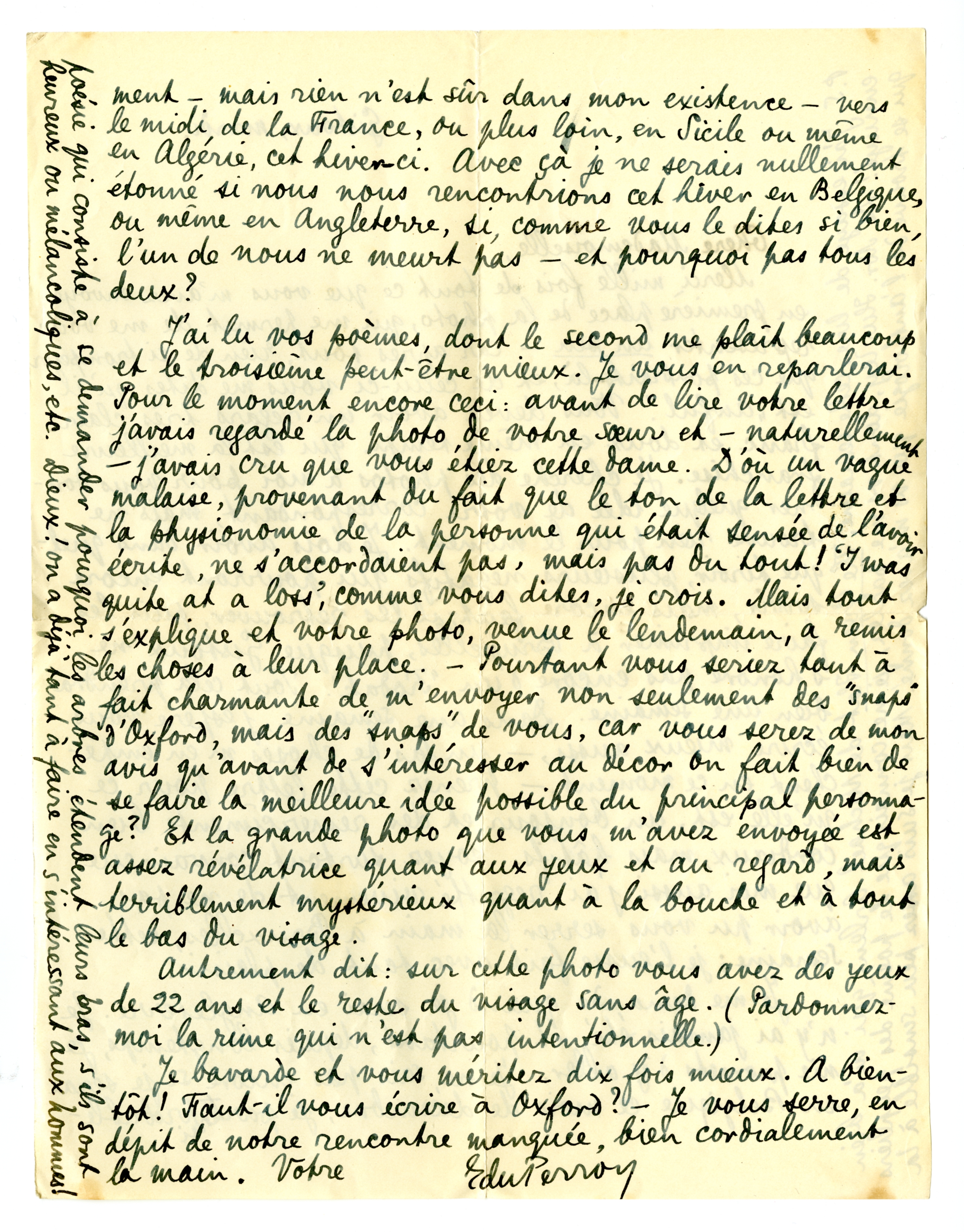 J'ai lu vos poèmes, dont le second me plaît beaucoup et le troisième peut-être mieux. Je vous en reparlerai. Pour le moment encore ceci: avant de lire votre lettre j'avais regardé la photo de votre soeur et - naturellement - j'avais cru que vous étiez cette dame. D'où un vague malaise, provenant du fait que le ton de la lettre et la physionomie de la personne qui était sensée de l'avoir écrite, ne s'accordaient pas, mais pas du tout! ‘I was quite at loss’, comme vous dites, je crois. Mais tout s'explique et votre photo, venue le lendemain, a remis les choses à leur place. - Pourtant vous seriez tout à fait charmante de m'envoyer non seulement des ‘snaps’ d'Oxford, mais des ‘snaps’ de vous, car vous serez de mon avis qu'avant de s'intéresser au décor on fait bien de se faire la meilleure idée possible du principal personnage? Et la grande photo que vous m'avez envoyé est aussi révélatrice quant aux yeux et au regard, mais terriblement mystérieux quant à la bouche et à tout le bas du visage.