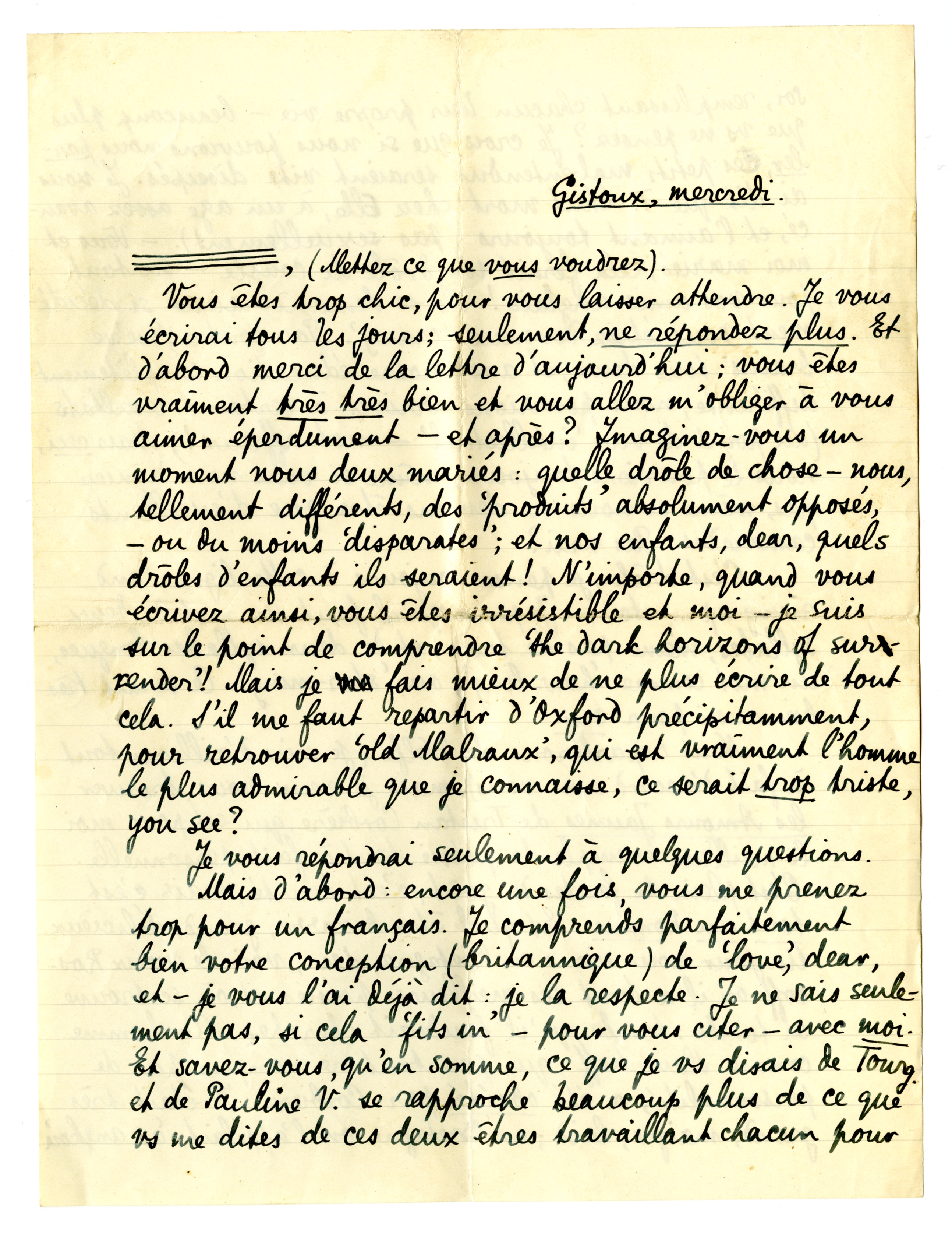 Vous êtes trop chic, pour vous laisser attendre. Je vous écrirai tous les jours; seulement, ne répondez plus. Et d'abord merci de la lettre d'aujourd'hui; vous êtes vraiment très, très bien et vous allez m'obliger à vous aimer éperdument - et après? Imaginez- vous un moment nous deux mariés: quelle drôle de chose - nous, tellement différents, des ‘produits’ absolument opposés, - ou du moins ‘disparates’; et nos enfants, dear, quels drôles d'enfants ils seraient! N'importe, quand vous écrivez ainsi, vous êtes irrésistible et moi - je suis sur le point de comprendre ‘the dark horizons of surrender’! Mais je fais mieux de ne plus écrire de tout cela. S'il me faut repartir d'Oxford précipitamment, pour retrouver ‘old Malraux’, qui est vraiment l'homme le plus admirable que je connaisse, ce serait trop triste, you see?