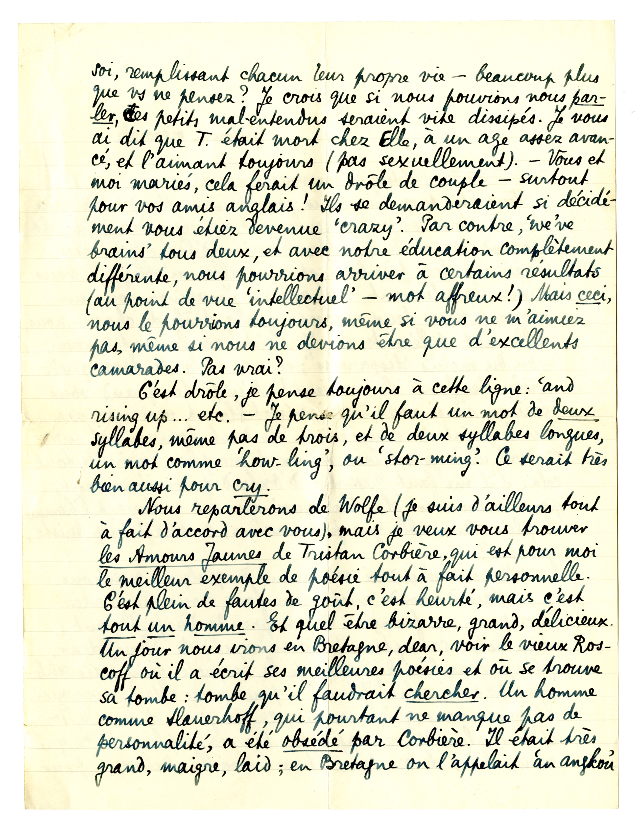 Mais d'abord: encore une fois, vous me prenez trop pour un français. Je comprends parfaitement bien votre conception (britannique) de ‘love’, dear, et - je vous l'ai déjà dit: je la respecte. Je ne sais seulement pas, si cela ‘fits in’ - pour vous citer - avec moi. Et savez-vous, qu'en somme, ce que je vs disais de Tourg. et de Pauline V. se rapproche beaucoup plus de ce qui vs me dites de ces deux êtres travaillant chacun pour soi, remplissant chacun leur propre vie - beaucoup plus que vs ne pensez? Je crois que si nous pouvions nous parler, ces petits mal-entendus seraient vite dissipés. Je vous ai dit que T. était mort chez Elle, à un age assez avancé, et l'aimant toujours (pas sexuellement). - Vous et moi mariés, cela ferait un drôle de couple - surtout pour vos amis anglais! Ils se demanderaient si décidément vous étiez devenue ‘crazy’. Par contre, ‘we 've brains’ tous deux, et avec notre éducation complètement différente, nous pourrions arriver à certains résultats (au point de vue ‘intellectuel’ - mot affreux!) Mais ceci, nous le pourrions toujours, même si vous ne m'aimiez pas, même si nous ne devions être que d'excellents camarades. Pas vrai?