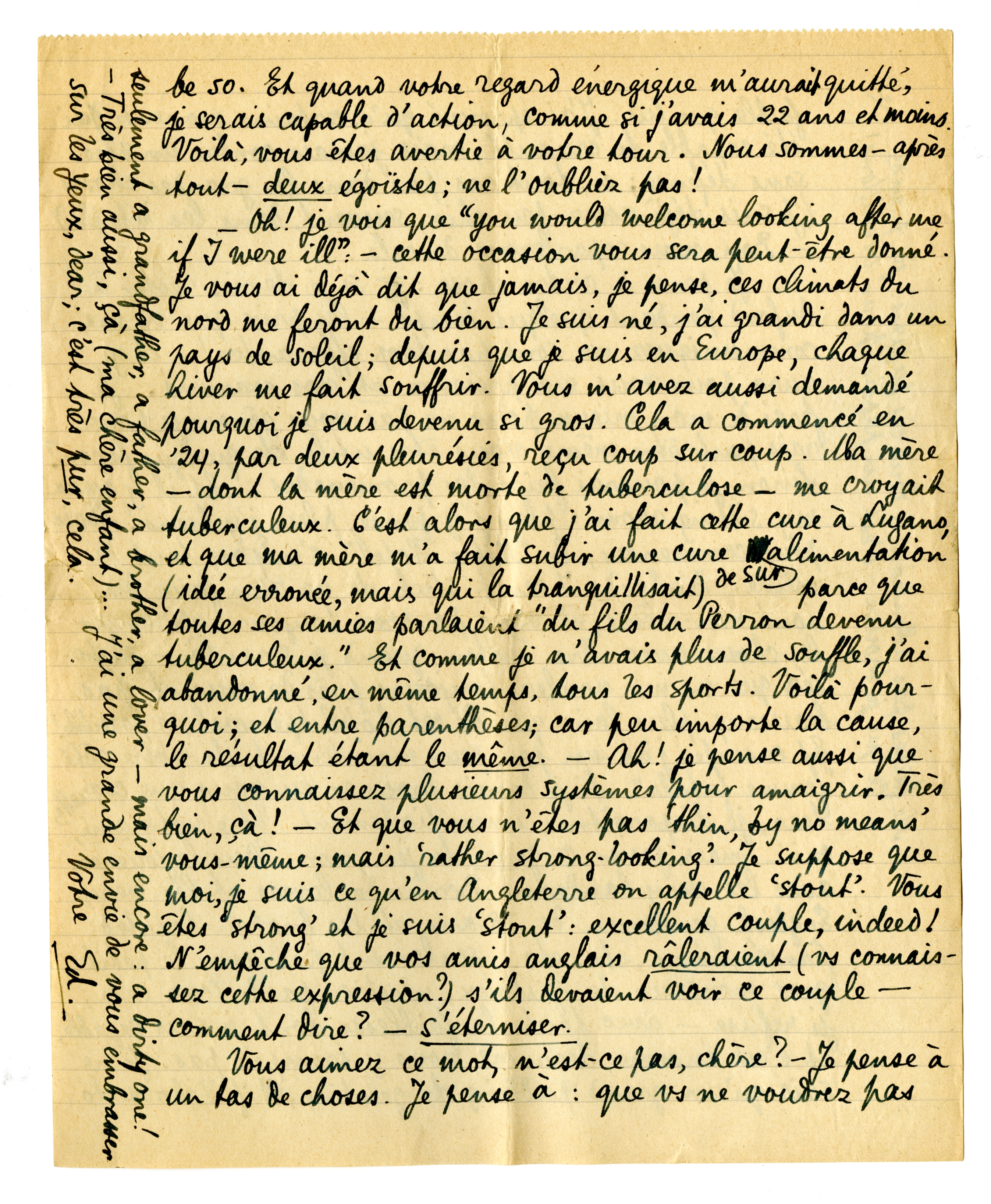 - Oh! je vois que ‘you would welcome looking after me if I were ill’: - cette occasion vous sera peut-être donné. Je vous ai déjà dit que jamais, je pense, ces climats du nord me feront du bien. Je suis né, j'ai grandi dans un pays de soleil; depuis que je suis en Europe, chaque hiver me fait souffrir. Vous m'avez aussi demandé pourquoi je suis devenu si gros. Cela a commencé en '24, par deux pleurésies, reçus coup sur coup. Ma mère - dont la mère est morte de tuberculose - me croyait tuberculeux. C'est alors que j'ai fait cette cure à Lugano, et que ma mère m'a fait subir une cure de suralimentation (idée erronée, mais qui la tranquillisait) parce que toutes ses amies parlaient ‘du fils du Perron devenu tuberculeux.’ Et comme je n'avais plus de souffle, j'ai abandonné, en même temps, tous les sports. Voilà pourquoi; et entre parenthèses; car peu importe la cause, le résultat étant le même. - Ah! je pense aussi que vous connaissez plusieurs systèmes pour amaigrir. Très bien çà! - Et que vous n'êtes pas thin ‘by no means’ vous-même, mais ‘rather strong-looking’. Je suppose que moi, je suis ce qu'en Angleterre on appelle ‘stout’. Vous êtes ‘strong’ et je suis ‘stout’: excellent couple, indeed! N'empêche que vos amis anglais râleraient (vs connaissez cette expression?) s'ils devaient voir ce couple - comment dire? - s'éterniser.