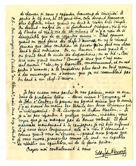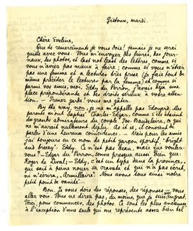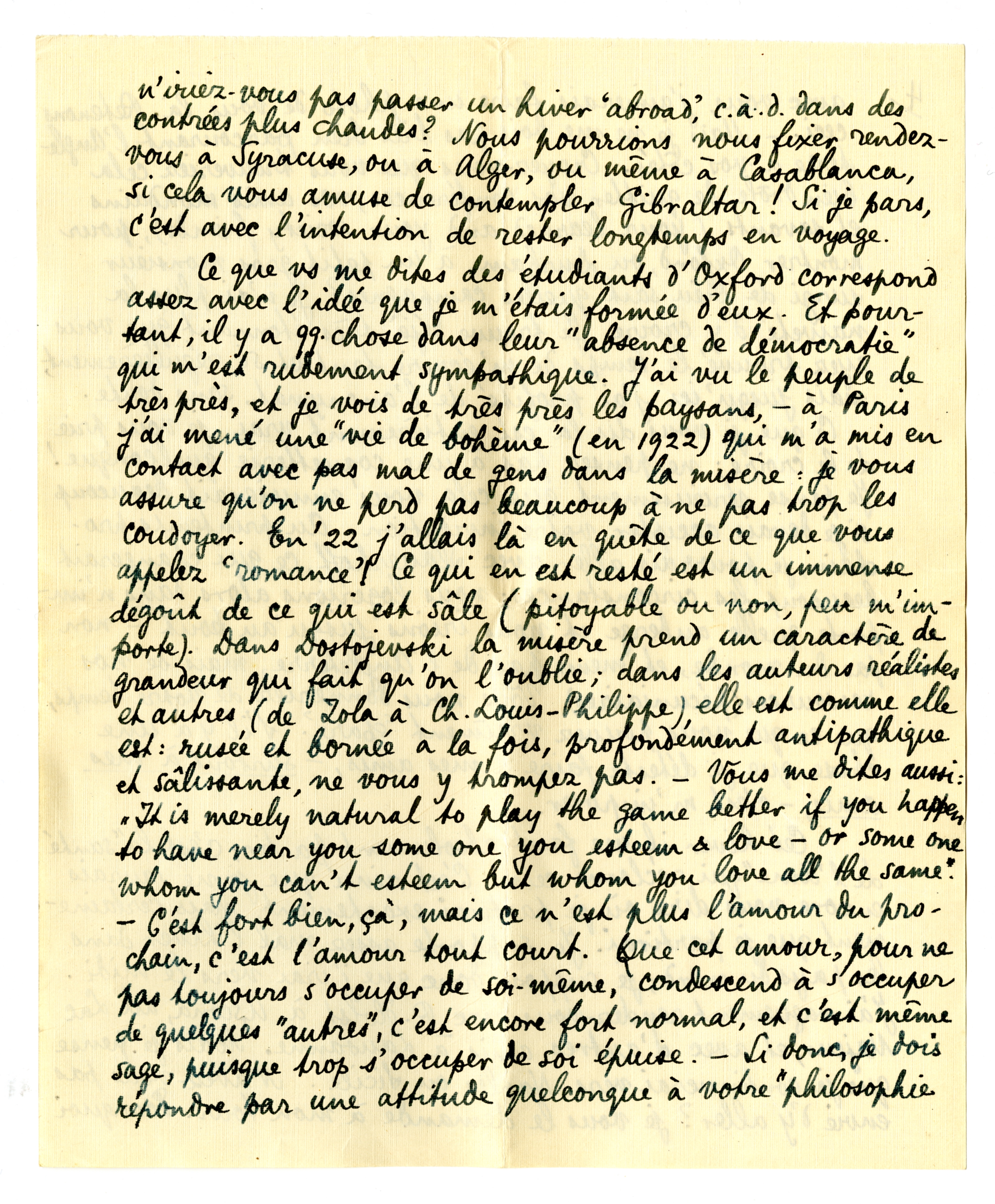 Ce que vs me dites des étudiants d'Oxford correspond assez avec l'idée que je m'étais formée d'eux. Et pourtant, il y a qq. chose dans leur ‘absence de démocratie’ qui m'est rudement sympathique. J'ai vu le peuple de très près, et je vois de très près les paysans, - à Paris j'ai mené une ‘vie de bohème’ (en 1922) qui m'a mis en contact avec pas mal de gens dans la misère: je vous assure qu'on ne perd pas beaucoup à ne pas trop les coudoyer. En '22 j'allais là en quête de ce que vous appelez ‘romance’! Ce qui en est resté est un immense dégoût de ce qui est sâle (pitoyable ou non, peu m'importe). Dans Dostojevski la misère prend un caractère de grandeur qui fait qu'on l'oublie; dans les auteurs réalistes et autres (de Zola à Ch.Louis-Philippe), elle est comme elle est: rusée et bornée à la fois, profondément antipathique et sâlissante, ne vous y trompez pas. - Vous me dites aussi: ‘It is merely natural to play the game better if you happen to have near you some one you esteem & love - or some one whom you can't esteem but whom you love all the same.’ - C'est fort bien, çà, mais ce n'est plus l'amour du prochain, c'est l'amour to court. Que cet amour, pour ne pas toujours s'occuper de soi-même, condescend à s'occuper de quelques ‘autres’, c'est encore fort normal, et c'est même sage, puisque trop s'occuper de soi épuise. - Si donc, je dois répondre par une attitude quelconque à votre ‘philosophie nouvelle’, je puis le faire en raisonnant ainsi: - Miss Blackett, qui n'est pas satisfaite par son pessimisme, a décidé d'agir et d'aider ‘les autres’ tant qu'elle peut - ou bien: - Eveline souhaite, malgré tout, de trouver quelqu'un qu'elle puisse aimer, ce qui est tout à fait de son âge, n'en déplaise à son intelligence. - Vous pensez que ‘l'individualiste’ que je suis, préfère de loin le second raisonnement. Si vous croyez à l'Amour, faites de votre mieux pour aimer quelqu'un. Si vous n'aimez pas Humphrey, vous aimerez un autre, mais à l'encontre de la ‘slim, white woman whom everybody loves’, vous serez aimée, je pense, par somebody, que vous pourriez aimer en retour? si ce n'est aujourd'hui, ce sera demain. Je doute fort que ce soit éternellement un seul; quoique c'est possible. Mais peu importe, et je suis d'accord avec vous que çà doit être un seul (à la fois). Si vous preniez ceci pour du cynisme, vous n'auriez pas raison. Vous n'auriez pas tort non plus. Je vous parle sincèrement et je vous dis ce que je pense; et aujourd'hui, à 30 ans, je suis bien loin de penser que l'Amour est souvent éternel; c'est tout.