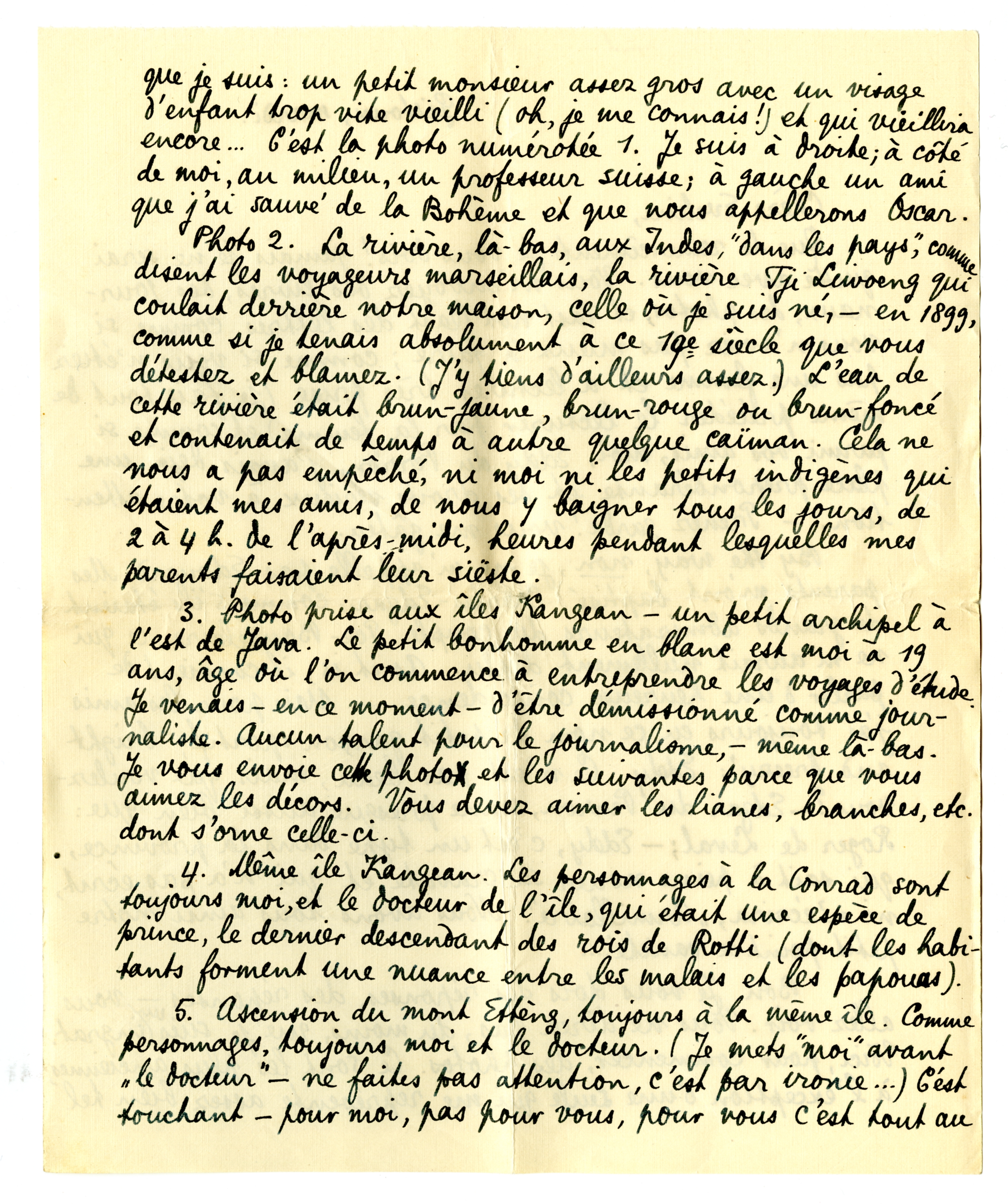 Photo 2. La rivière, là-bas, aux Indes, ‘dans les pays’, comme disent les voyageurs marseillais, la rivière Tji Liwoeng qui coulait derrière notre maison, celle où je suis né, - en 1899, comme si je tenais absolument à ce 19e siècle que vous détestez et blamez. (J'y tiens d'ailleurs assez.) L'eau de cette rivière était brun-jaune, brun-rouge ou brun-foncé et contenait de temps à autre quelque caïman. Cela nous a pas empêché, ni moi ni les petits indigènes qui étaient mes amis, de nous y baigner tous les jours, de 2 à 4 h. de l'après-midi, heures pendant lesquelles mes parents faisaient leur siëste.