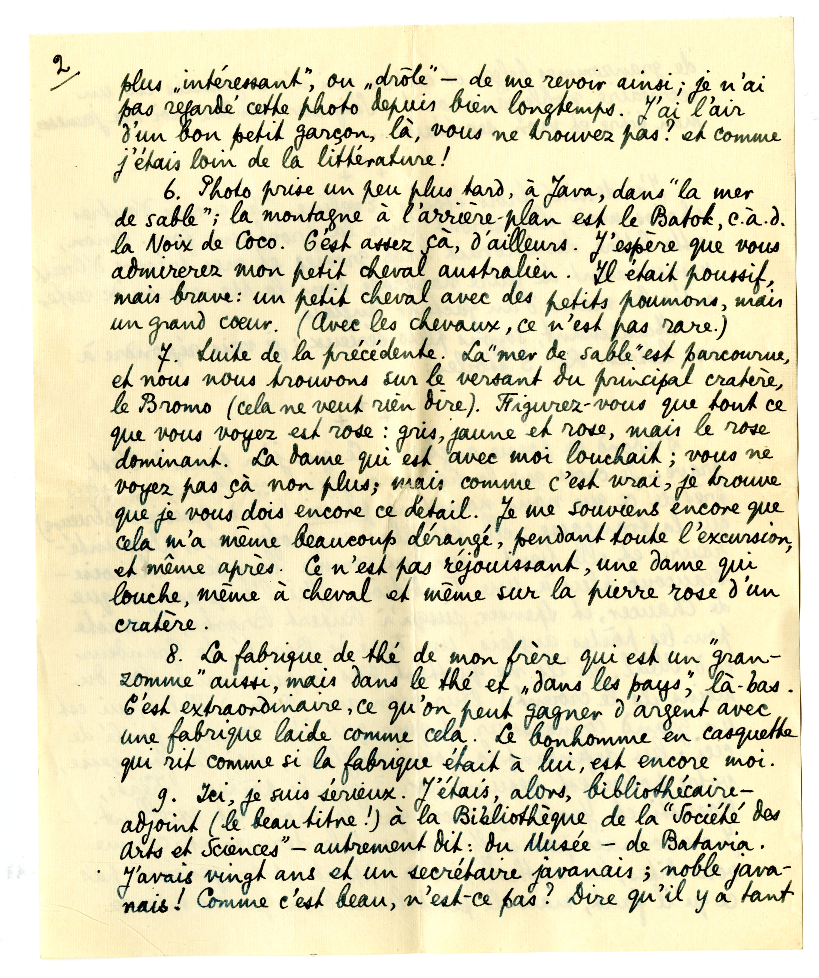 9. Ici, je suis sérieux. J'étais, alors, bibliothécaire‘adjoint (le beau titre!) à la Bibliothèque de la ‘Société des Arts et Sciences’ - autrement dit: du Musée - de Batavia. J'avais vingt ans et un secrétaire javanais; noble javanais! Comme s'est beau, n'est-ce pas? Dire qu'il y a tant de granzommes belges et autres qui n'ont jamais eu un secrétaire noble-javanais! - Seigneur, rendez-moi ma jeunesse, mon titre et mon secrétaire...