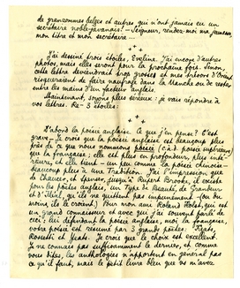 Je dois encore vous parler de vos poésies, mais ce sera dans la prochaine lettre. - Merci encore d'Everyman et de John o'London, le premier me parait mieux que le second, j'y ai trouvé au moins des détails sur deux écrivains qui m'intéressaient: D.H. Lawrence et Arthur Machen. - Si je n'ai pas répondu à quelque question, insistez; vous voyez que je ne manque pas de bonne volonté. Il fait maussade maintenant à la campagne; je vis très enfermé. Si je vous écris longuement, cela n'a rien d'étonnant - comme quand vous m'écrivez -; quant aux propos que je vous envoie, prenez-les comme ils sont: ni capables de rétablir un équilibre, ni de le faire perdre.