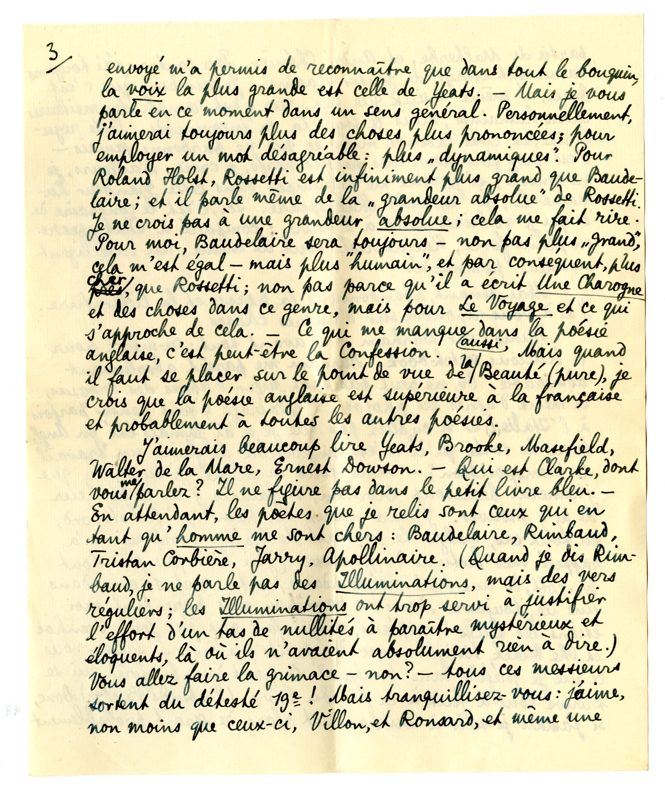 J'aimerais beaucoup lire Yeats, Brooke, Masefield, Walter de la Mare, Ernest Dowson. - Qui est Clarke, dont vous me parlez? Il ne figure pas dans le petit livre bleue. - En attendant, les poètes que je relis sont ceux qui en tant qu'homme me sont chers: Baudelaire, Rimbaud, Tristan Corbière, Jarry, Apollinaire. (Quand je dis Rimbaud, je ne parle pas des Illuminations, mais des vers réguliers; les Illuminations ont trop servi à justifier l'effort d'un tas de nullités à paraître mystérieux et éloquents, là où ils n'avaient absolument rien à dire.) Vous allez faire la grimace - non? ‘ tous ces messieurs sortent du détesté 19e! Mais tranquillisez-vous: j'aime, non moins que ceux-ci, Villon, et Ronsard, et même une partie de Malherbe, et André Chénier. Par contre, j'ai toujours vainement essayé de goûter Racine. Je sais bien que c'est beau, et même mieux que cela, que c'est rempli des meilleures choses humaines, mais ce style-là m'incommode. Cette régularité, et cette cadence mesurée qui ne pardonne jamais - c'est trop fort pour mes faibles nerfs, je crois. D'ailleurs, je me console; si je veux me retremper dans cette grandeur humaine-là, je reprends Shakespeare. Ici, c'est le contraire de ce que je vs disais tout à l'heure; comparé à Shakespeare en plein force, Racine reste tout de même: un intelligent monsieur pommadé.