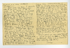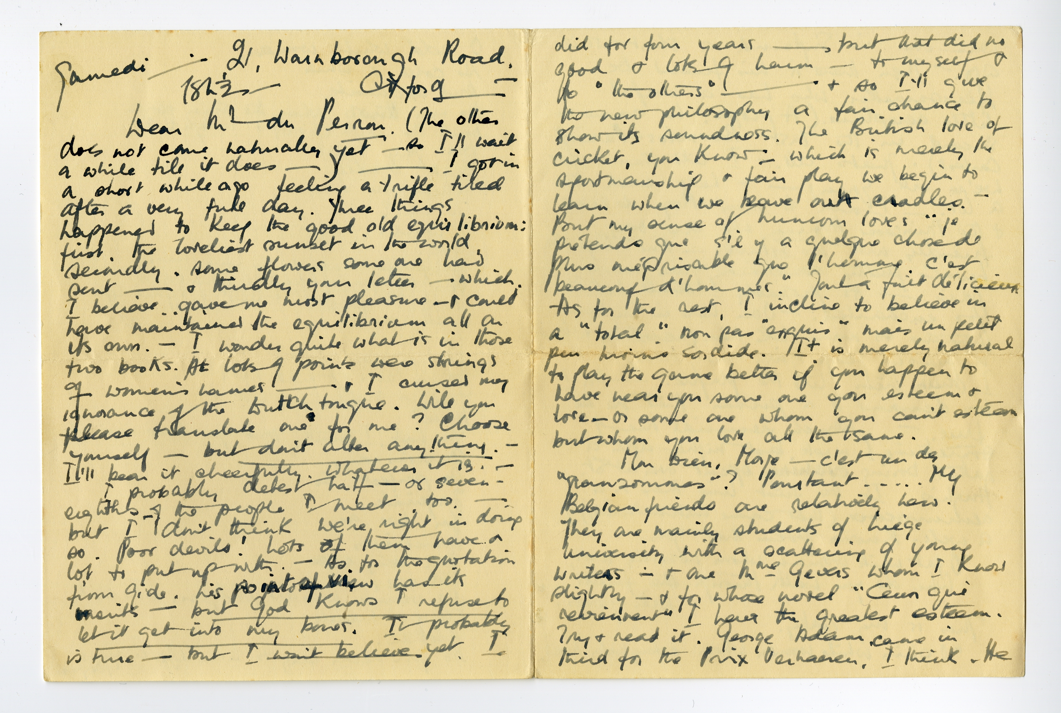 I probably detest half - or seven eighths - of the people I meet too. - but I don't think we're right in doing so. Poor devils! Lots of them have a lot to put up with. - As for the quotation from Gide, his point of view has its merits - but God knows I refuse to let it get into my bones. It probably is true - but I won't believe yet. I did for four years - but that did no good & lots of harm - to myself & to ‘the others’ - & so I'll give the new philosophy a fair chance to show its soundness. The British love of cricket, you know - which is merely the sportsmanship & fair play we begin to learn when we leave our cradles. - But my sense of humour loves ‘je prétends que s'il y a quelque chose de plus méprisable que l'homme, c'est beaucoup d'hommes.’ Tout à fait délicieux. As for the rest, I incline to believe in a ‘total’. Non pas ‘exquis’ mais un petit peu moins sordide. It is merely natural to play the game better if you happen to have near you some one you esteem & love - or some one whom you can't esteem but whom you love all the same.