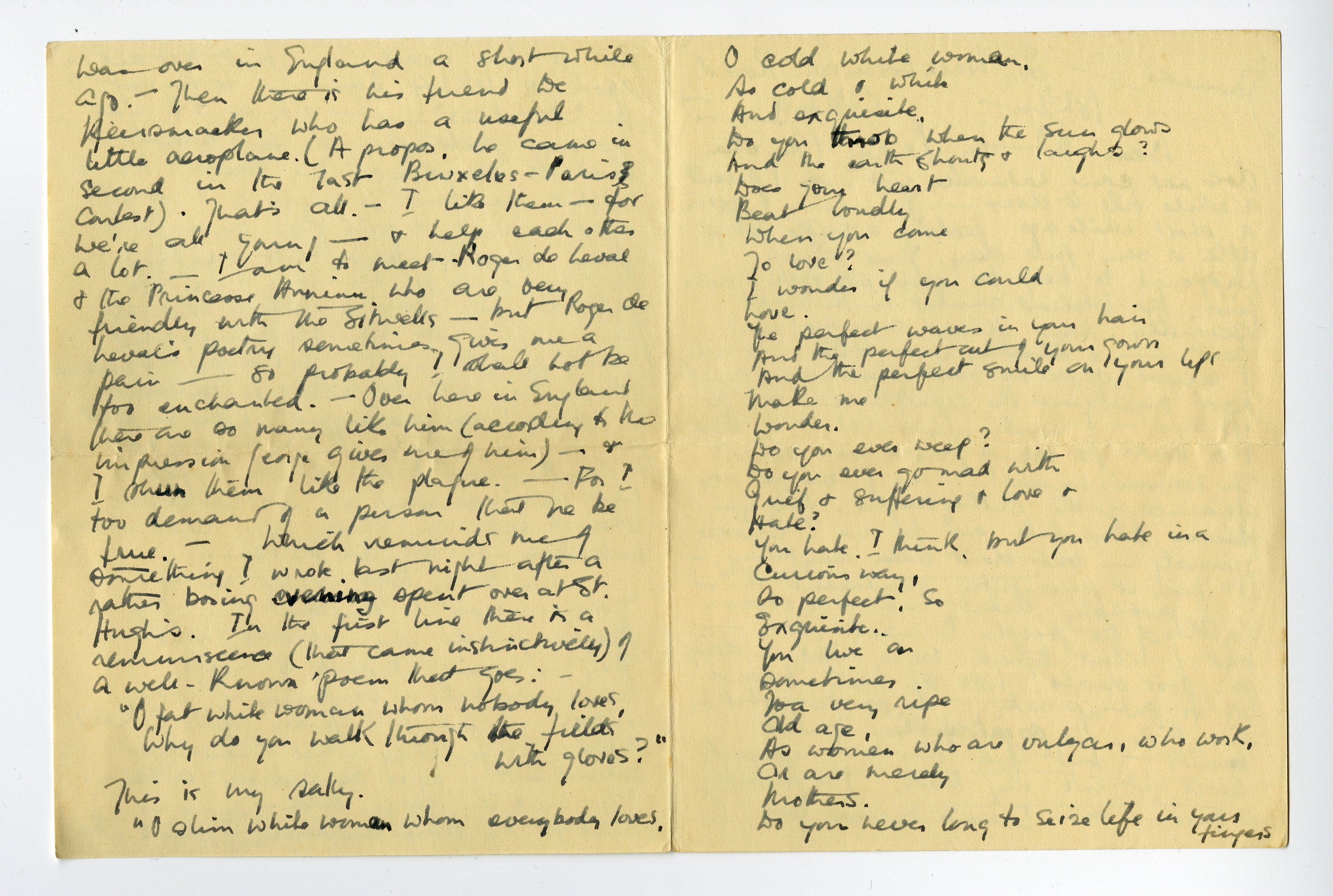 Mon Dieu, Norge, - c'est un des ‘granzommes’? Pourtant ..... my Belgian friends are relatively new. They are mainly students of Liège University with a scattering of young writers - & one Mme Gevers whom I know slightly - & for whose novel Ceux qui reviennent I have the greatest esteem. Try & read it. George Adam came in third for the Prix Verhaeren, I think. He was over in England a short while ago. - Then there is his friend De Keersmaeker who has a useful little aeroplane. (A propos, he came in second in the last Bruxelles - Paris contest). That's all. - I like them - for we're all young - & help each other a lot. - I am to meet Roger de Leval & the Princesse Arnimm who are very friendly with the Sitwells - but Roger de Leval's poetry sometimes gives me a pain - so probably I shall not be too enchanted. - Over here in England there are so many like him (according to the impression George gives me of him) - & I shun them like the plague. - For I too demand of a person that he be true. - Which reminds me of something I wrote last night after a rather boring evening spent over at St. Hugh's. In the first line there is a reminiscence (that came instinctively) of a well-known poem that goes: -