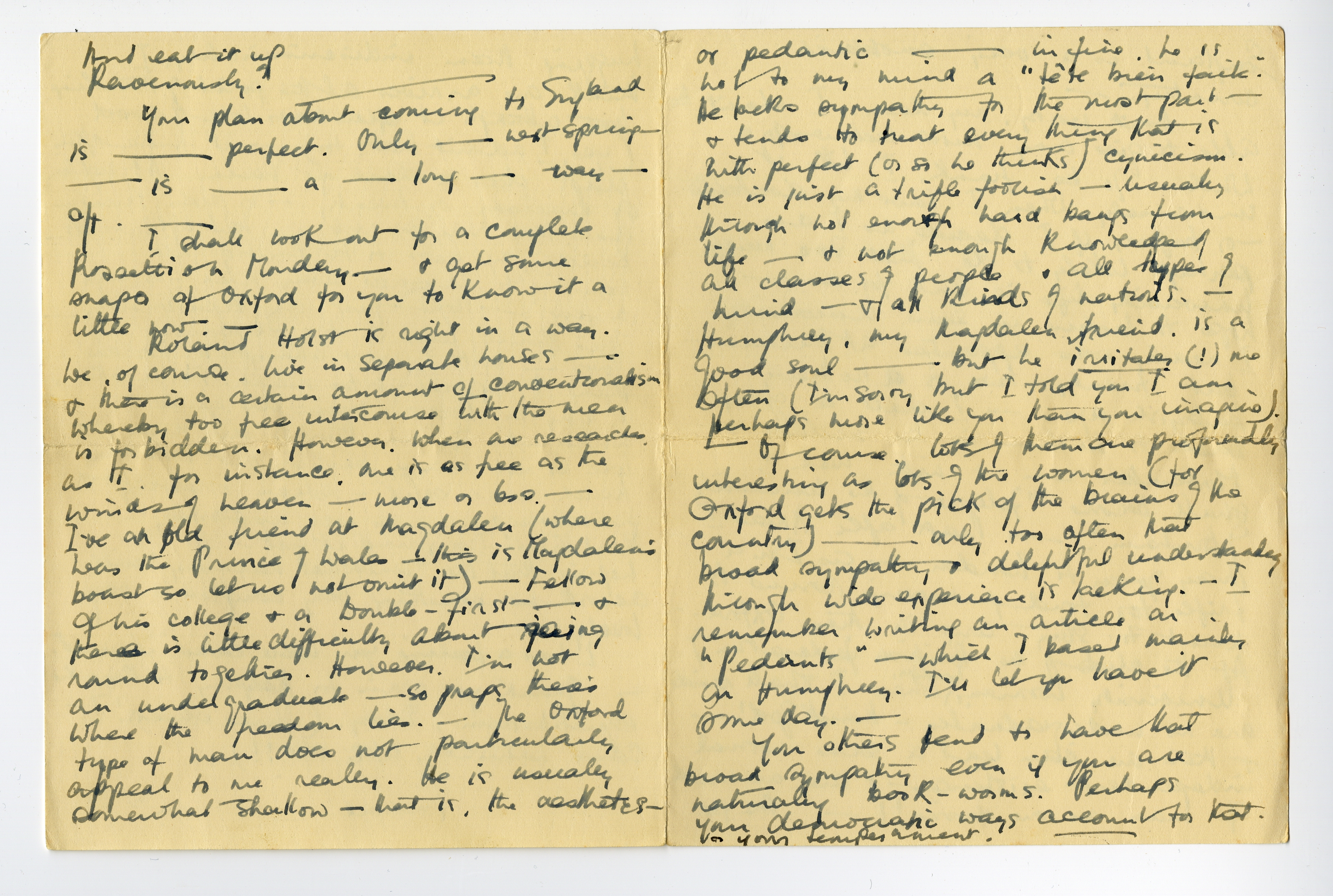 Of course, lots of them are profoundly interesting as lots of the women (for Oxford gets the pick of the brains of the country) - only too often that broad sympathy & delightful understanding through wide experience is lacking. - I remember writing an article on ‘Pedants’ - which I based mainly on Humphrey. I'll let you have it some day. -