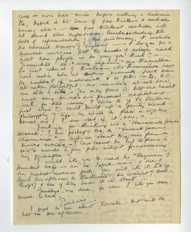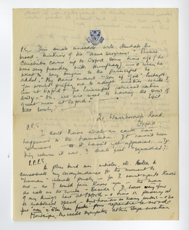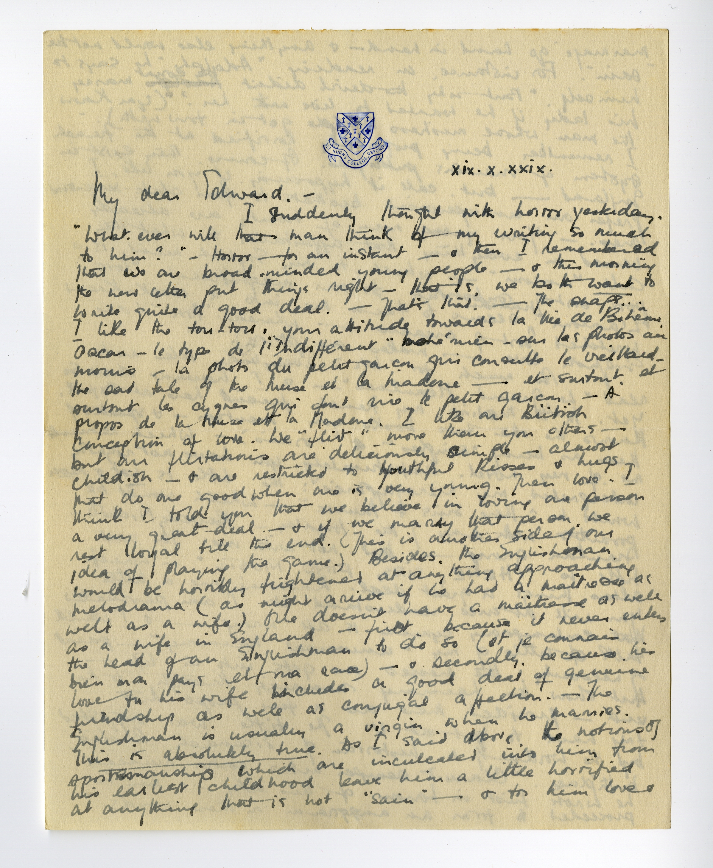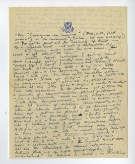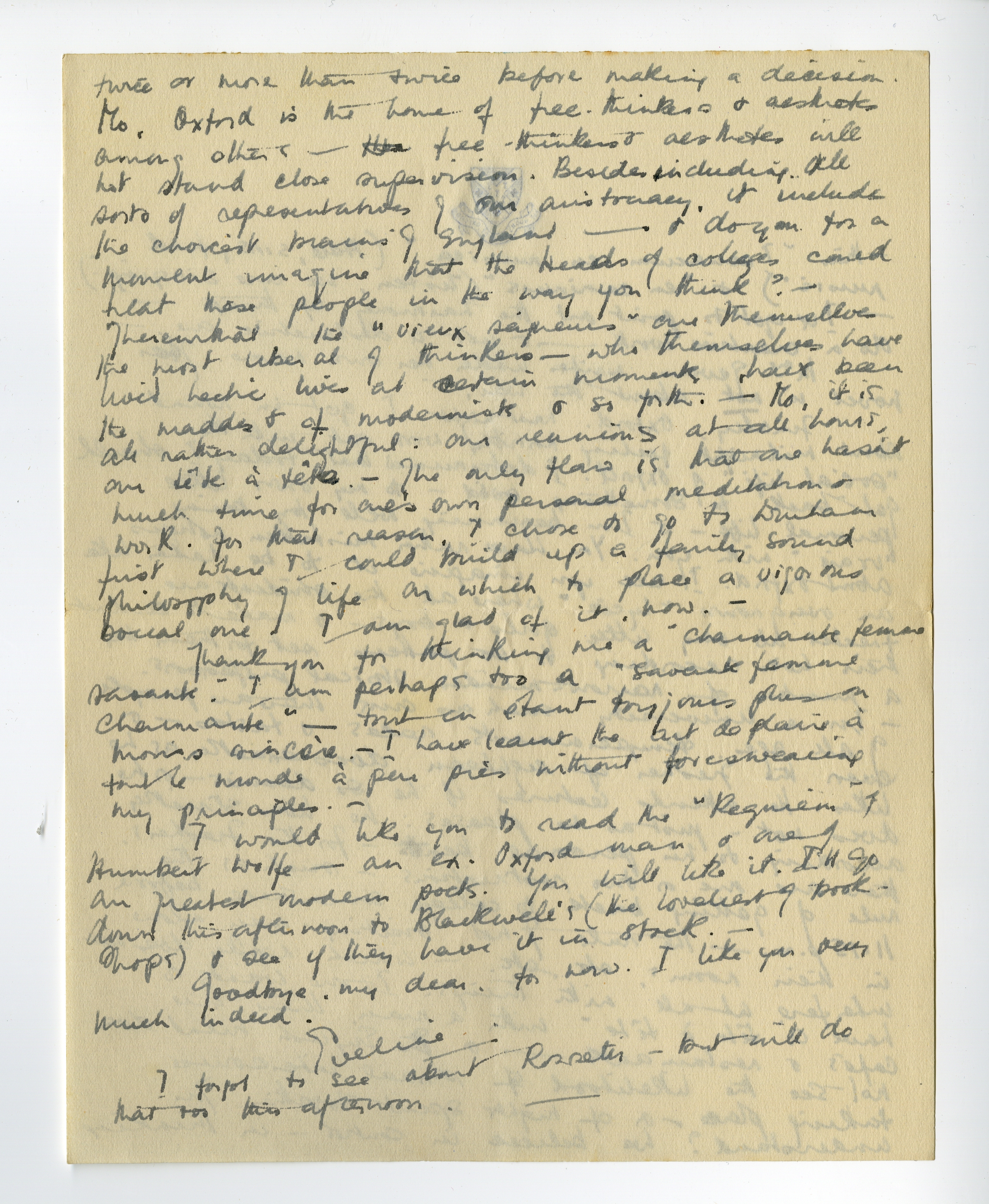 Finally, Oxford. Last night I got in round about midnight feeling horribly worn out with the ‘social life’ of Oxford. I determined that today I should get back something solid - to my own little personal life - & I'm beginning well by being ‘vraie’ with you. You have rather mistaken notions about Oxford. I see you imagine it to be rather like an overgrown ‘lycée’ where all the students are treated as very little girls & boys - & made to conduct their lives according to the pattern set for them by a number of narrow-minded stoical professors. - In a University such as ours, there are people of all ages, temperaments, races & tastes - & even the Fresher of eighteen does exactly as he likes. He attends lectures if he so desires - or he does not - just as he pleases: he lives strictly according to his personal bent - For the Freshers, there are one or two restrictions - such as the rule of getting back to college somewhere before 11.15 p.m. - the rule of not visiting men alone in their rooms, etc., etc. - which really does not interfere at all with things. If one wants to have a ‘tête à tête’ with a man, there are cafés & restaurants - & the English mind does not see the likelihood of sexual intercourse taking place - or of nights spent together. You understand? We believe in control - in thinking twice or more than twice before making a decision. No, Oxford is the home of free-thinkers & aesthetes among others - the free-thinkers & aesthetes will not stand close supervision. Besides including all sorts of representatives of our aristocracy, it includes the choicest brains of England - & do you for a moment imagine that the Heads of colleges could treat these people in the way you think? - Therewithal the ‘vieux seigneurs’ are themselves the most liberal of thinkers - who themselves have lived hectic lives at certain moments, have been the maddest of modernists & so forth. - No, it is all rather delightful: our reunions at all hours, our ‘tête à tête’. - The only flaw is that one hasn't much time for one's own personal meditation & work. For that reason, I chose to go to Durham first where I could build up a fairly sound philosophy of life on which to place a vigorous social one. I am glad of it, now. -