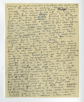 So much for ‘love’: Everybody tells me to read Le Grand Meaulnes - & I haven't done so yet. Melle Molino, my French friend here at Oxford, knows the other two books you mention - & speaks of them as being ‘simples’ & ‘vrais’. - Which reminds me of my novel. Unfortunately, you have not rightly interpreted my hieroglyphics: the title is not & never would be ‘Here, Sins & Music’ - which would be possible with any of the Huxley - Beverly Nichols - Frankau group - but not with me. The real title is ‘HERE, SIRS, FIND MUSIC’ - which alters things a great deal. Knowing me a little you will at once understand it. I am persuaded that contemporary cynicism is all wrong - & I would talk a little of my ‘universal harmony’ - pains of necessity, the messes one gets into in life - but show the harmony running through to the end - provided there are a few people that try hard to get at it. The title was suggested by the words of a historian of Eisenach, Bach's birthplace. ‘Claruit semper vitas nostra musica’, he wrote first in honour of his city - & then he proceeded to form an anagram on these words - thus ‘I senacum en musica’ (Here, sirs, find music’) & ‘en canimus’ (‘listen, we are singing’.) - I've got to point out the harmony of things - do a creative work - & not a destructive one. -