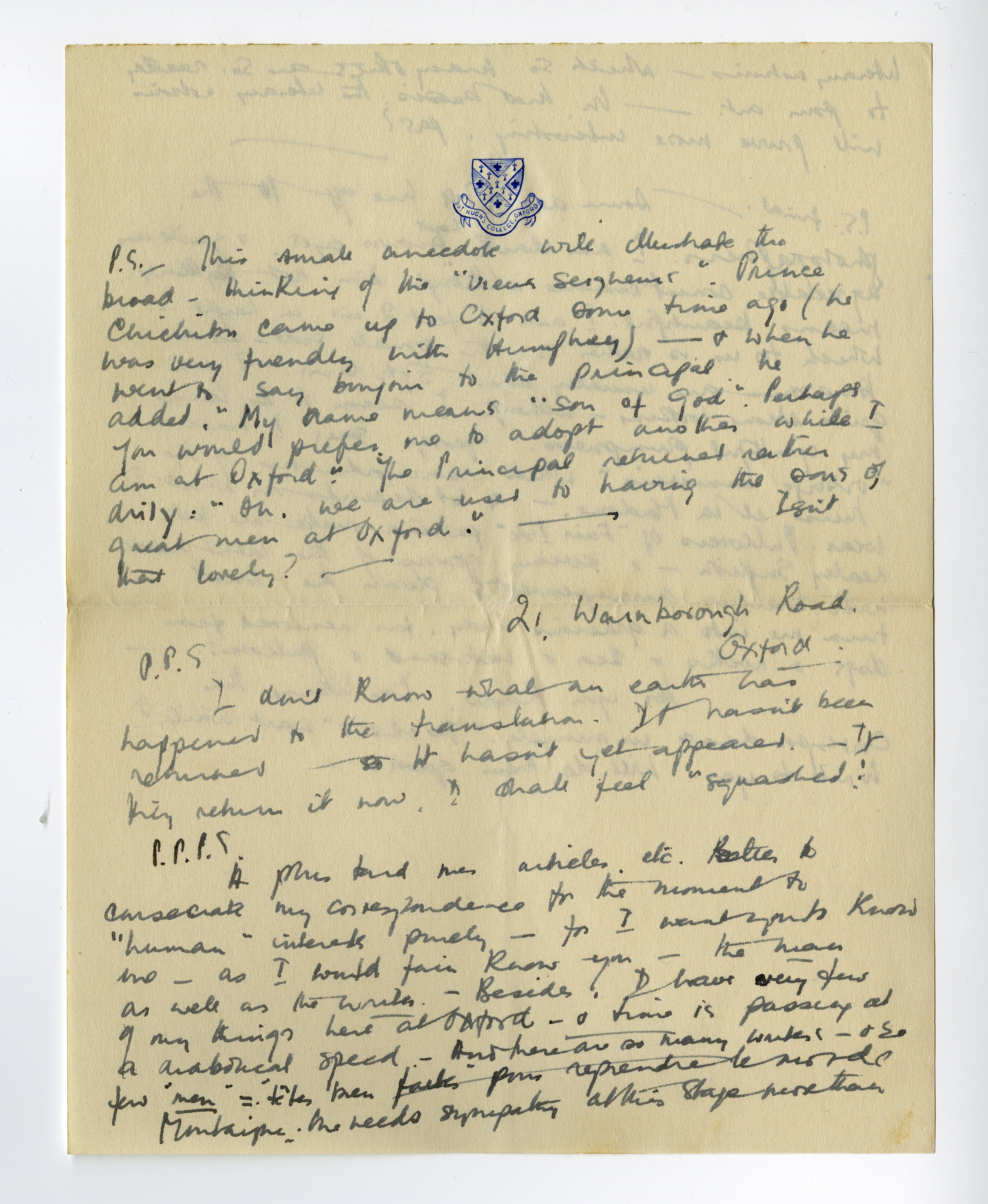 P.S. This small anecdote will illustrate the broad-thinking of the ‘vieux seigneurs’. Prince Chichibu came up to Oxford some time ago (he was very friendly with Humphrey) - & when he went to say bonjour to the principal, he added, ‘My name means “Son of God”. Perhaps you would prefer me to adopt another while I am at Oxford.’ The principal returned rather drily: ‘Oh, we are used to having the sons of great men at Oxford.’ - Isn't that lovely? -