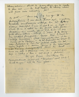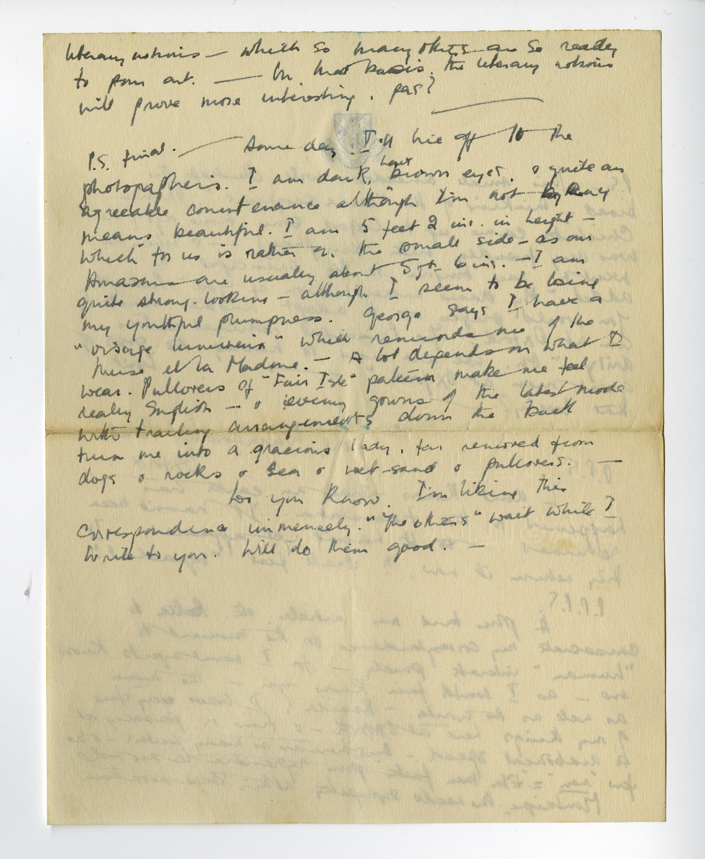 P.S. final. - Same day. I'll hie off to the photographer's. I am dark, have brown eyes, & quite an agreeable countenance although I'm not by any means beautiful. I am 5 feet 2 ins. in height - which for us is rather on the small side - as our Amazons are usually about 5 ft. 6 ins. - I am quite strong-looking - although I seem to be losing my youthful plumpness. George says I have a ‘visage lumineux’ which reminds me of the Muse et la Madone. - A lot depends on what I wear. Pullovers of ‘Fair Isle’ pattern make me feel really English - & evening gowns of the latest mode with trailing arrangements down the back turn me into a gracious lady, far removed from dogs & rocks & sea & wet-sand & pullovers. -