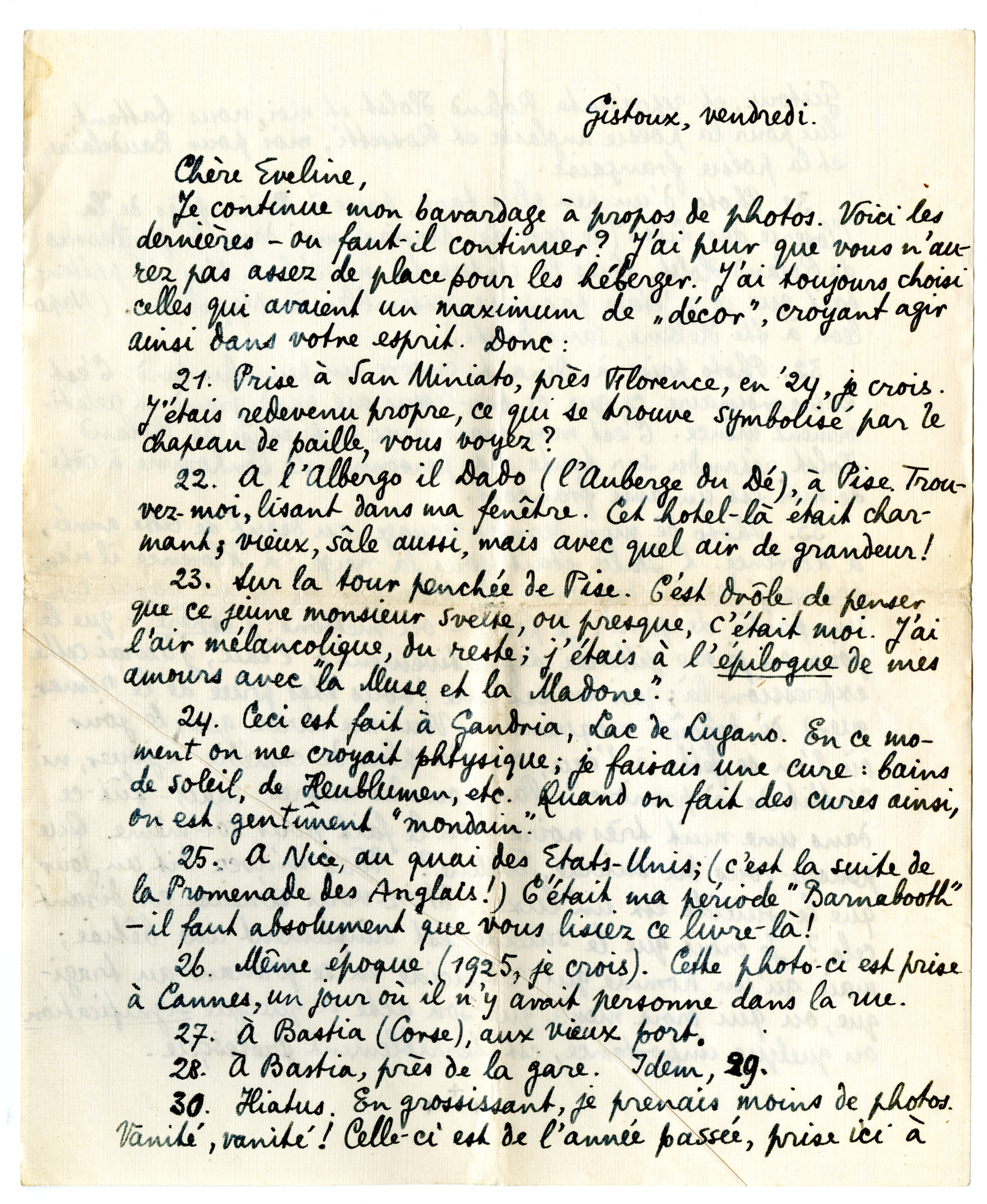 21. Prise à San Miniato, près Florence, en '24, je crois. J'étais redevenu propre, ce qui se trouve symbolisé par le chapeau de paille, vous voyez?