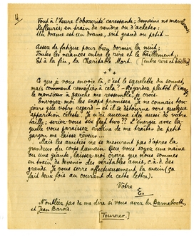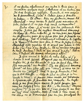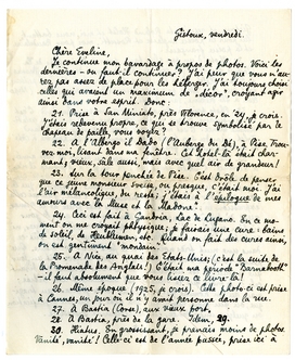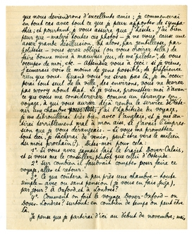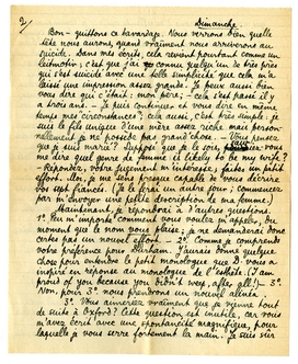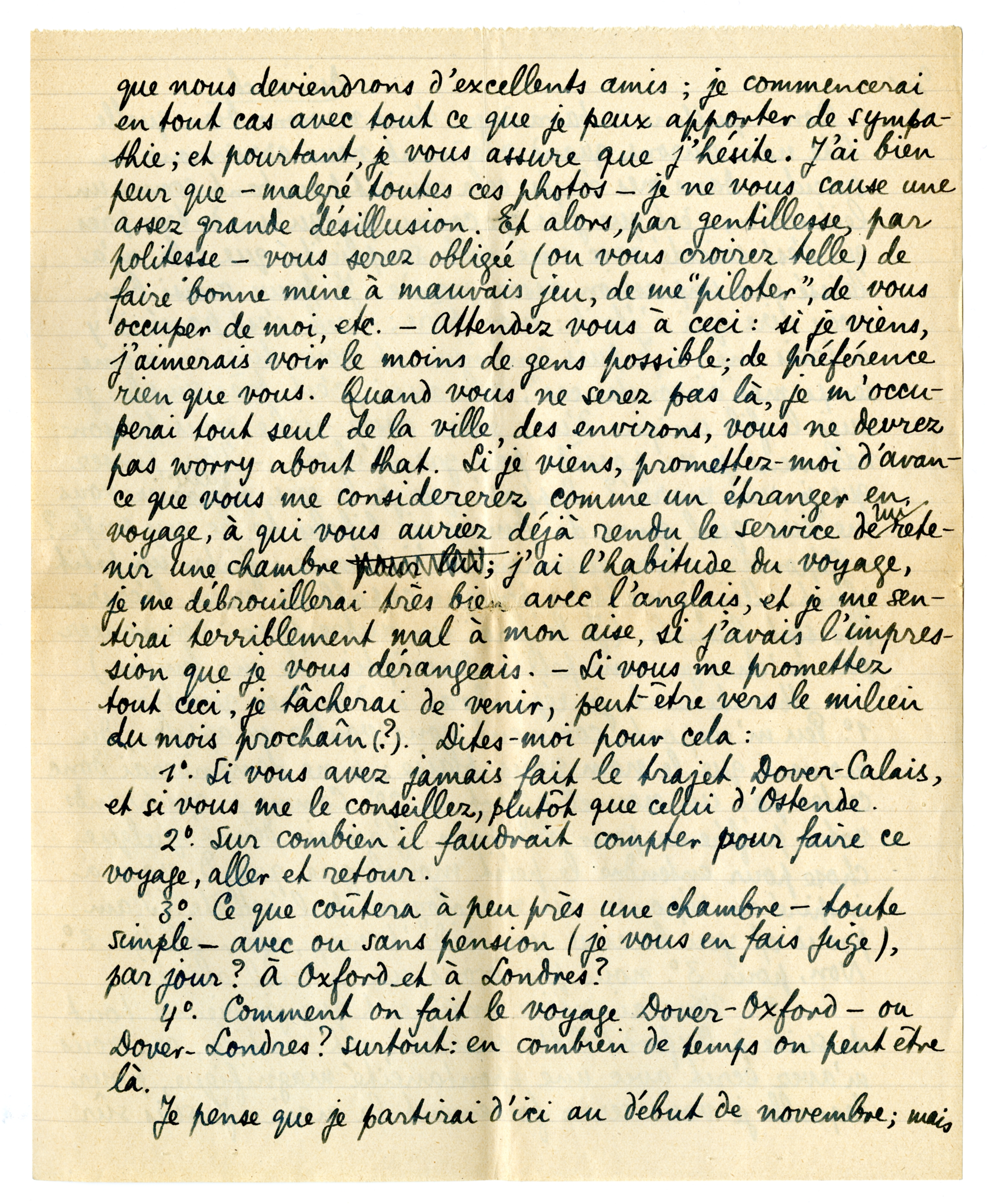 3o. Vous aimeriez vraiment que je vienne tout de suite à Oxford? Cette question est inutile, car vous m'avez écrit avec une spontanéité magnifique, pour laquelle je vous serre fortement la main. Je suis sûr que nous deviendrons d'excellents amis; je commencerai en tout cas avec tout ce que je peux apporter de sympathie; et pourtant, je vous assure que j'hésite. J'ai bien peur que - malgré toutes ces photos - je ne vous cause une assez grande désillusion. Et alors, par gentillesse, par politesse - vous serez obligée (ou vous croirez telle) de faire bonne mine à mauvais jeu, de me ‘piloter’, de vous occuper de moi, etc. - Attendez vous à ceci: si je viens, j'aimerais voir le moins de gens possible; de préférence rien que vous. Quand vous ne serez pas là, je m'occuperai tout seul de la ville, des environs, vous ne devrez pas worry about that. Si je viens, promettez-moi d'avance que que vous me considererez comme un étranger en voyage, à qui vous auriez déjà rendu le service de lui retenir une chambre; j'ai l'habitude du voyage, je me débrouillerai très bien avec l'anglais, et je me sentirai terriblement mal à mon aise, si j'avais l'impression que je vous dérangeais. - Si vous me promettez tout ceci, je tâcherai de venir, peut-être vers le milieu du mois prochain (?). Dites-moi pour cela: