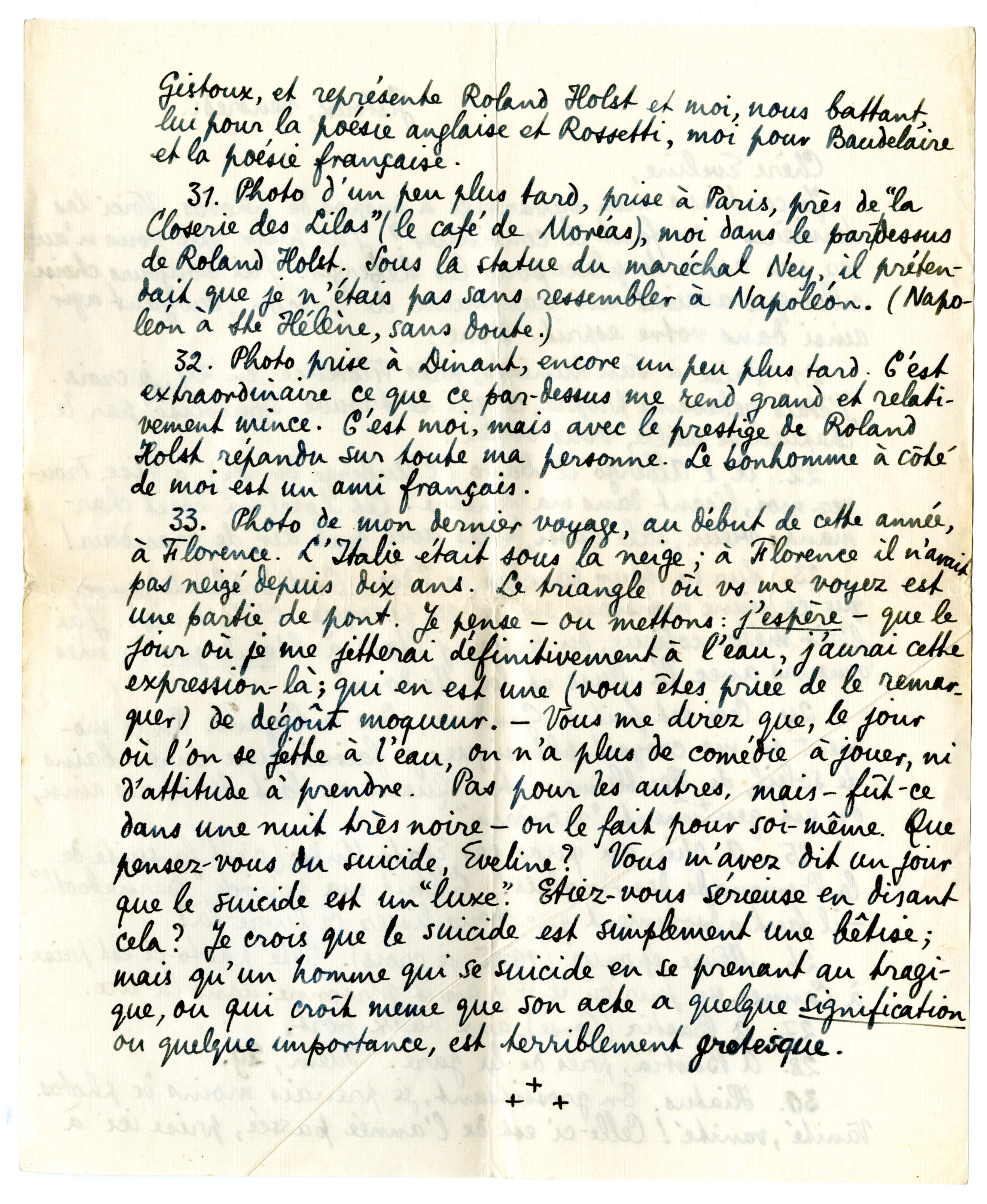 31. Photo d'un peu plus tard, prise à Paris, près de ‘la Closerie des Lilas’ (le café de Moréas), moi dans le par-dessus de Roland Holst. Sous la statue du maréchal Ney, il prétendait que je n'étais pas sans ressembler à Napoléon. (Napoleon à Ste Hélène, sans doute.)