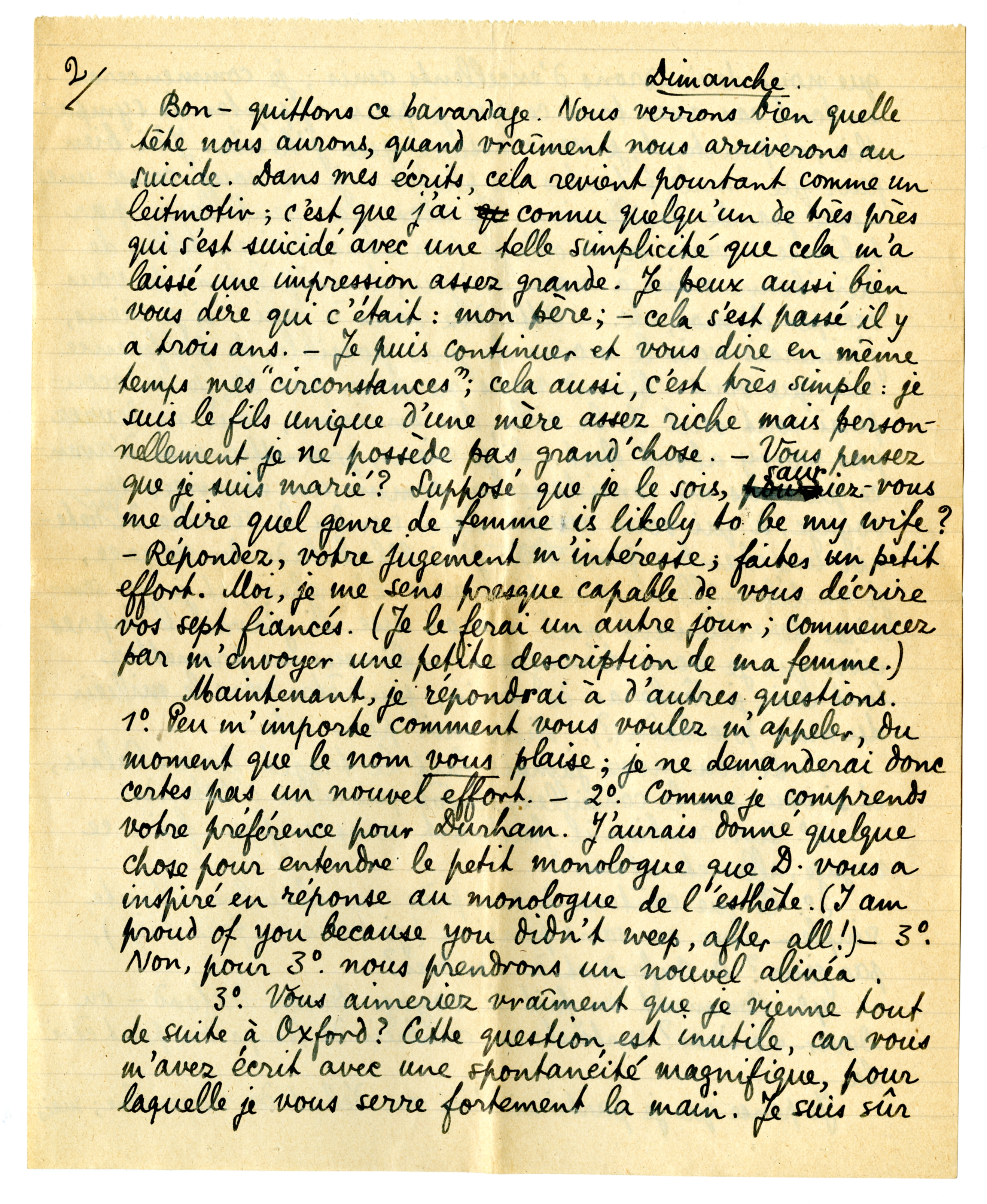 Maintenant, je répondrai à d'autres questions. 1o. Peu m'importe comment vous voulez m'appeler, du moment que le nom vous plaise; je ne demanderai donc certes pas un nouvel effort, - 2o Comme je comprends votre préférence pour Durham. J'aurais donné quelque chose pour entendre le petit monologue que D. vous a inspiré en réponse au monologue de l'esthète. (I am proud of you because you didn't weep, after all!) - 3o. Non, pour 3o. nous prendrons un nouvel alinéa.