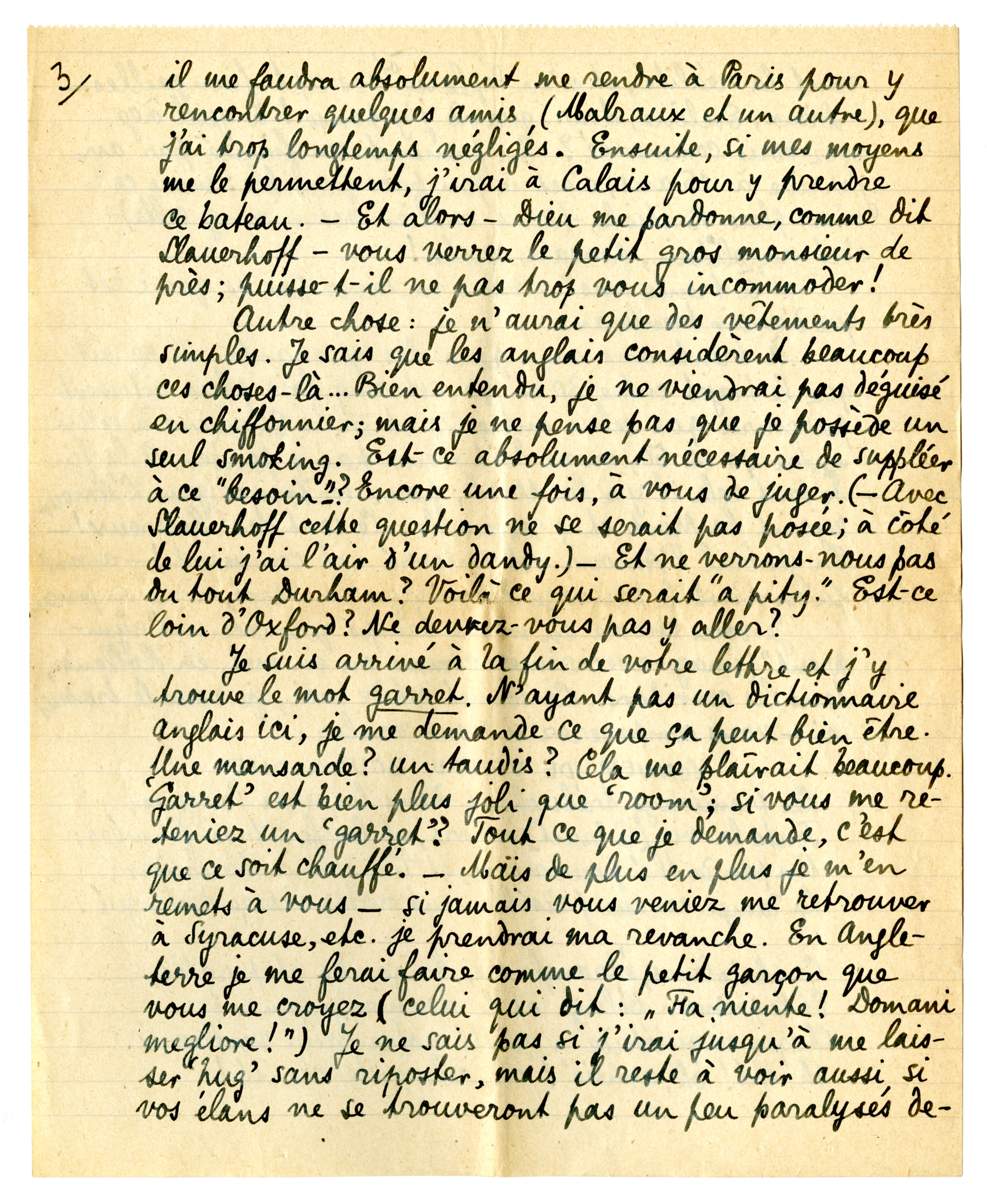 Je pense que je partirai d'ici au début de novembre; mais il me faudra absolument me rendre à Paris pour y rencentrer quelque amis (Malraux et un autre), que j'ai longtemps négligés. Ensuite, si mes moyens me le permettent, j'irai à Calais pour y prendre ce bateau. - Et alors - Dieu me pardonne, comme dit Slauerhoff - vous verrez le petit gros monsieur de prés; puisse-t-il ne pas trop vous incommoder!
