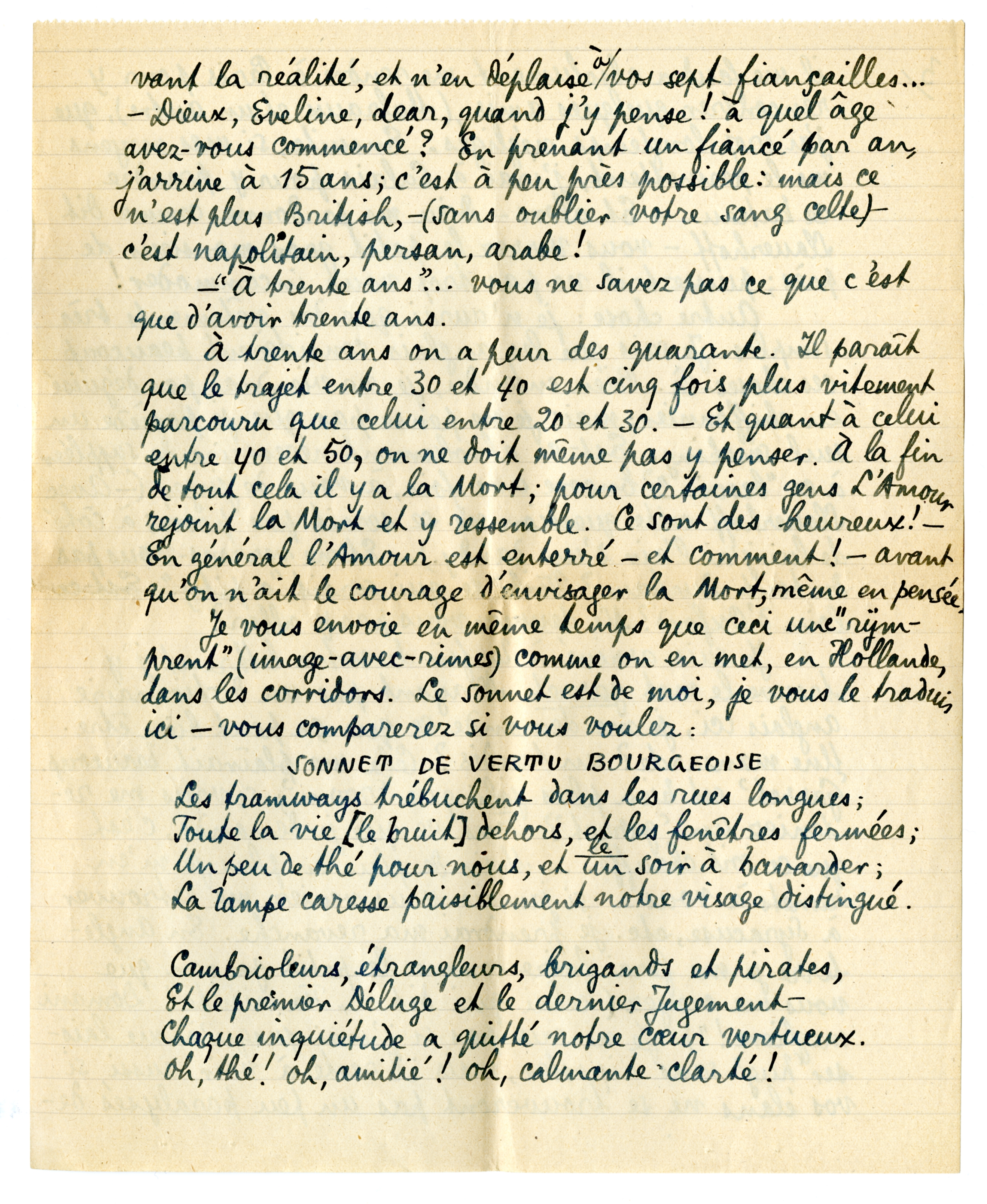 Je suis arrivé à la fin de votre lettre et j'y trouve le mot garret. N'ayant pas un dictionnaire anglais ici, je me demande ce que ça peut bien être. Une mansarde? un taudis? Cela me plaîrait beaucoup. ‘Garret’ est bien plus joli que ‘room’; si vous me reteniez un ‘garret’? Tout ce que je demande, c'est que se soit chauffé. - Mais de plus en plus je m'en remets à vous - si jamais vous veniez me retrouver à Syracuse, etc. je prendrai ma revanche. En Angleterre je me ferai faire comme le petit garçon que vous me croyez (celui qui dit: Fa niente! Domani megliore!’) Je ne sais pas si j'irai jusqu'à me laisser ‘hug’ sans riposter, mais il reste à voir aussi si vos élans ne se trouveront pas un peu paralysés devant la réalité, et n'en déplaise à vos sept fiançailles ... - Dieux, Eveline, dear, quand j'y pense! à quel âge avez-vous commençé? En prenant un fiancé par an, j'arrive à 15 ans; c'est à peu prés possible: mais ce n'est plus British, - (sans oublier votre sang celte) - c'est napolitain, persan, arabe!