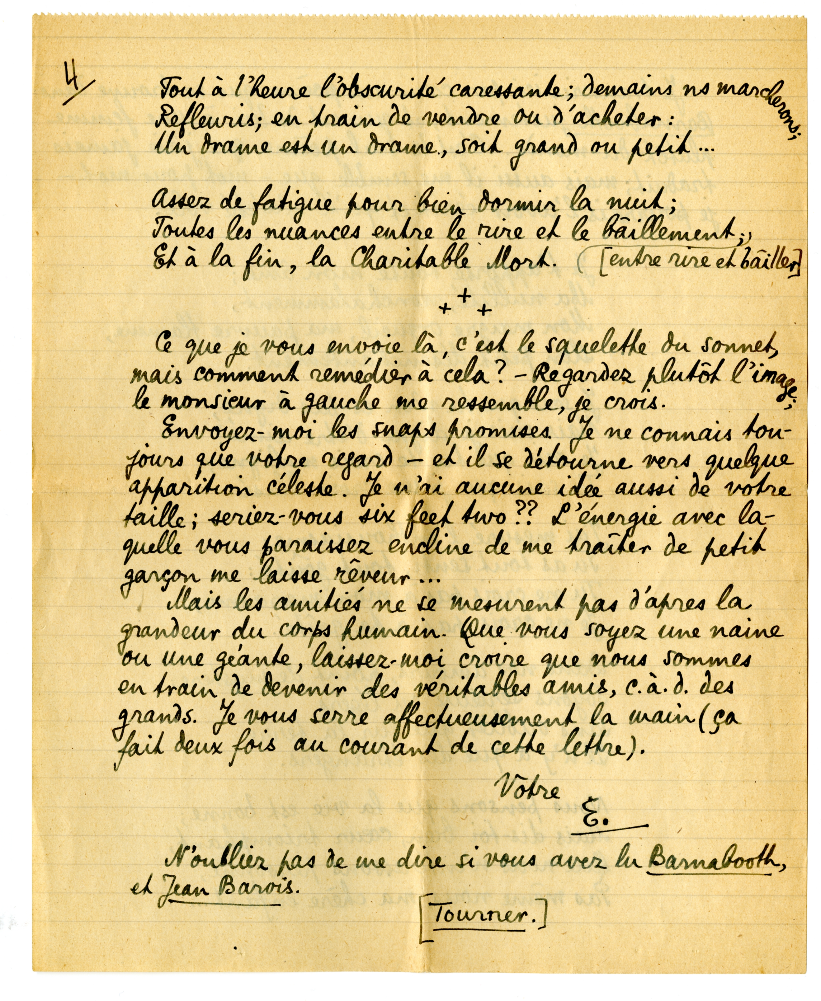 Mais les amitiés ne se mesurent pas d'après la grandeur du corps humain. Que vous soyez une naine ou une géante, laissez‘moi croire que nous sommes en train de devenir des véritables amis, c.à.d. des grands. Je vous serre affectueusement la main (ça fait deux fois au courant de cette lettre).