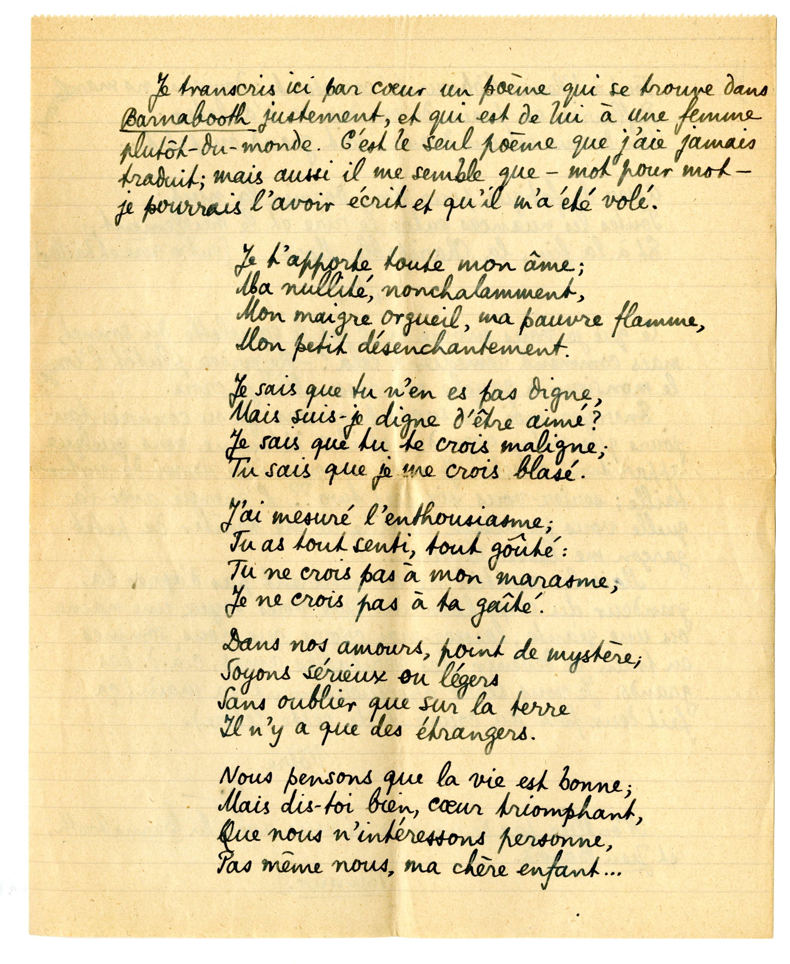 Je transcris ici par coeur un poème qui se trouve dans Barnabooth justement, et qui est de lui à une femme plutôt-du‘monde. C'est le seul poème que j'aie jamais traduit; mais aussi il me semble que - mot pour mot - je pourrai l'avoir écrit et qu'il m'a été volé.