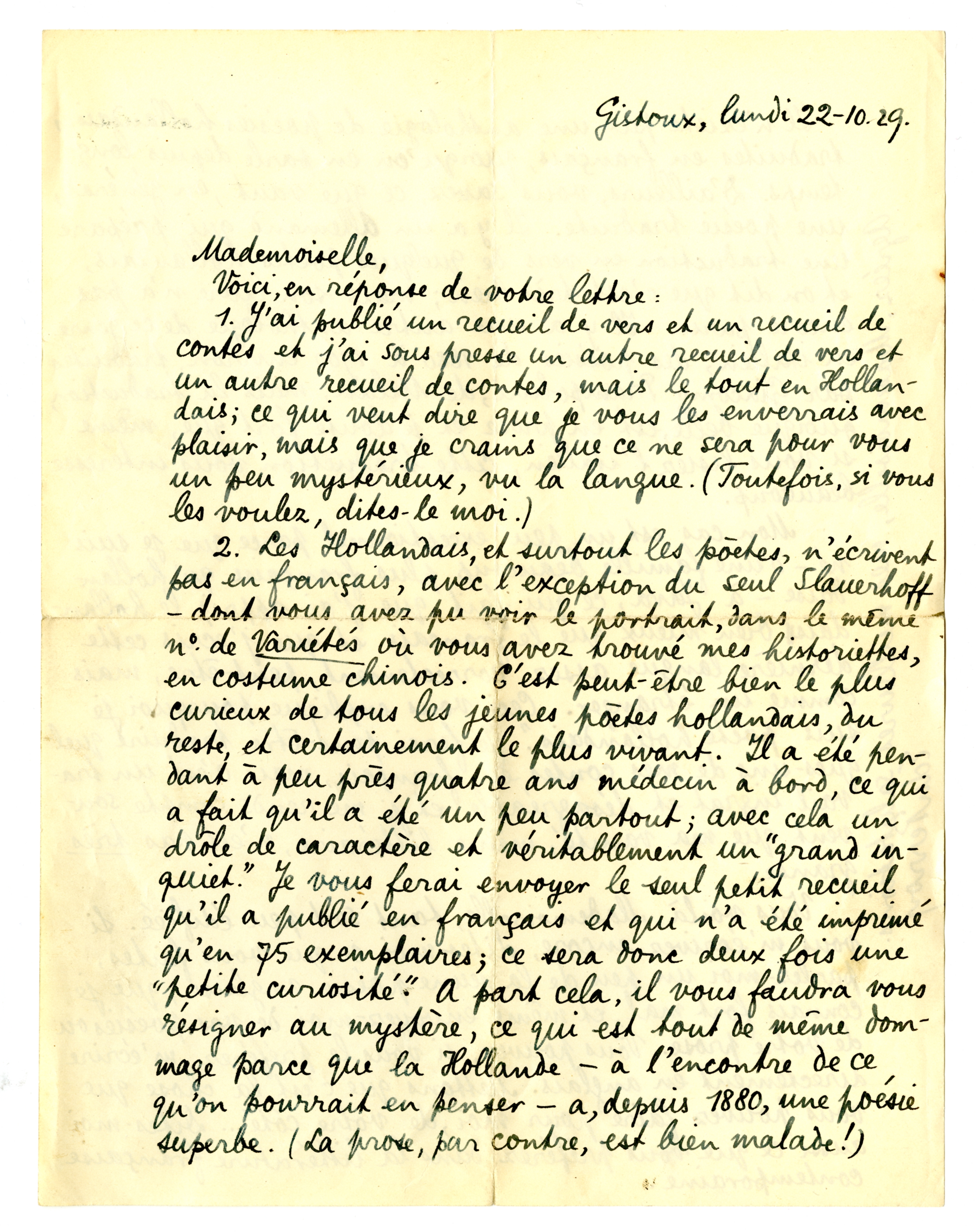 2. Les Hollandais, et surtout les poètes, n'écrivent pas en français, avec l'exception du seul Slauerhoff - dont vous avez pu voir le portrait, dans le même no. de Variétés où vous avez trouvé mes historiettes, en costume chinois. C'est peut-être bien le plus curieux de tous les jeunes poètes hollandais, du reste, et certainement le plus vivant. Il a été pendant à peu près quatre ans médécin à bord, ce qui a fait qu'il a été un peu partout; avec cela un drôle de caractère et véritablement ‘un grand inquiet’. Je vous ferai envoyer le seul petit recueil qu'il a publié en français et qui n'a été imprimé qu'en 75 exemplaires; ce sera donc deux fois une ‘petite curiosité’. A part cela, il vous faudra vous résigner au mystère, ce qui est tout de même dommage parce que la Hollande - à l'encontre de ce qu'on pourrait en penser - a, depuis 1880, une poésie superbe. (La prose, par contre, est bien malade!)