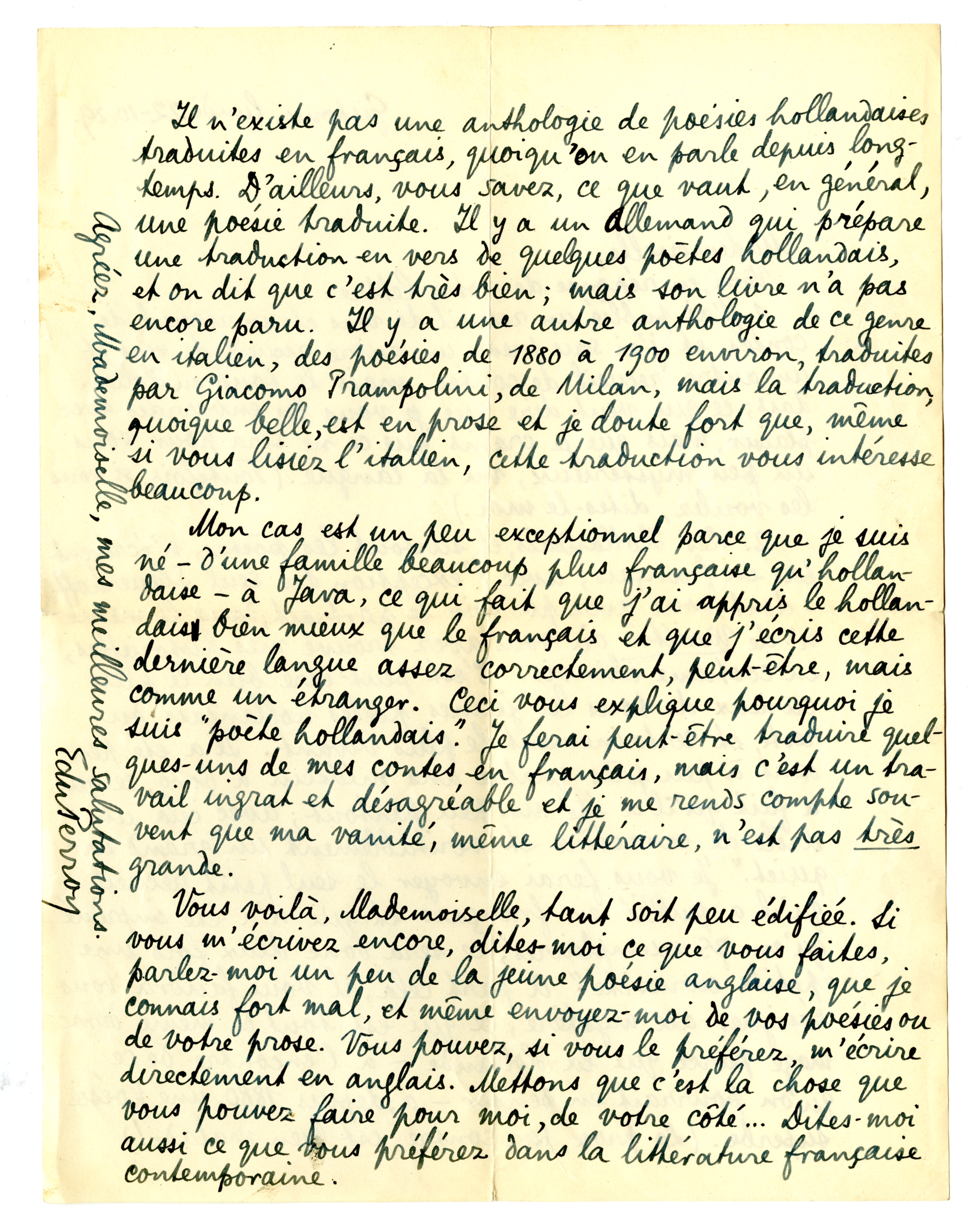 Mon cas est un peu exceptionel parce que je suis né - d'une famille beaucoup plus française que hollandaise - à Java, ce qui fait que j'ai appris le hollandais bien mieux que le français et que j'écris cette dernière langue assez correctement, peut-être, mais comme un étranger. Ceci vous explique pourquoi je suis ‘poète hollandais’. Je ferai peut-être traduire quelques-uns de mes contes en français, mais c'est un travail ingrat et désagréable et je me rends compte souvent que ma vanité, même littéraire, n'est pas très grande.