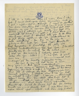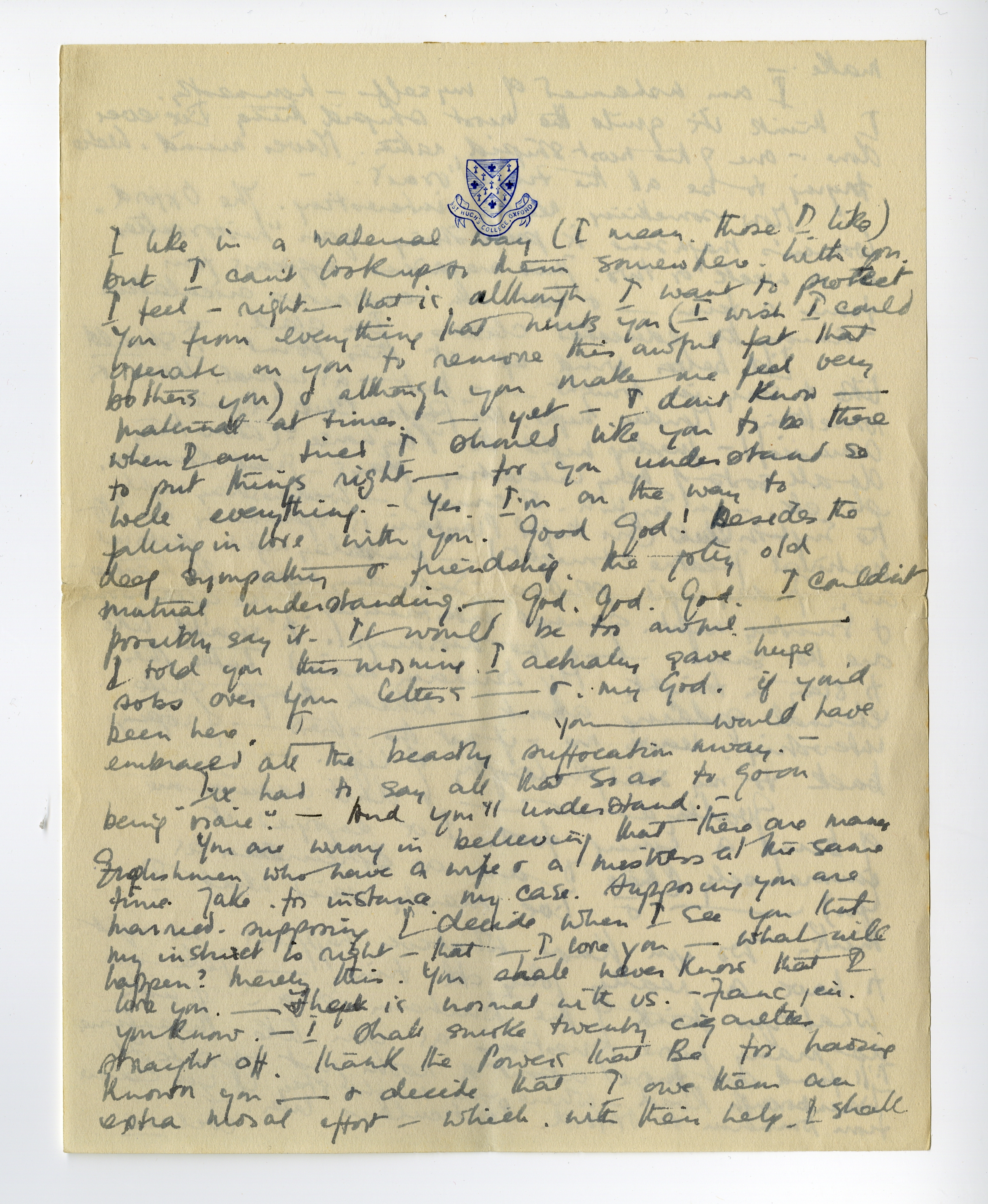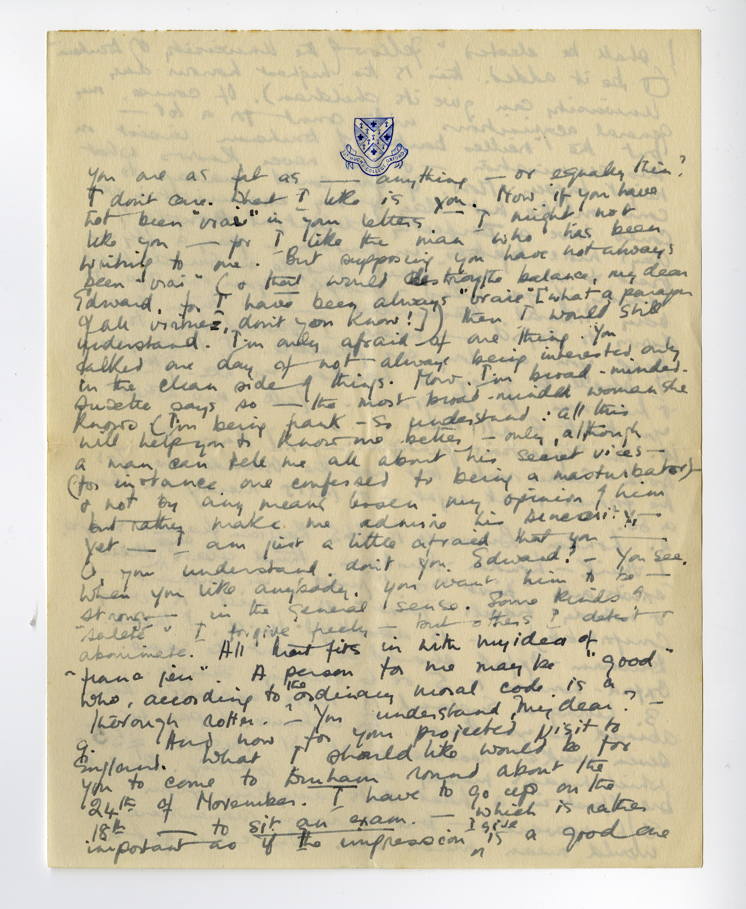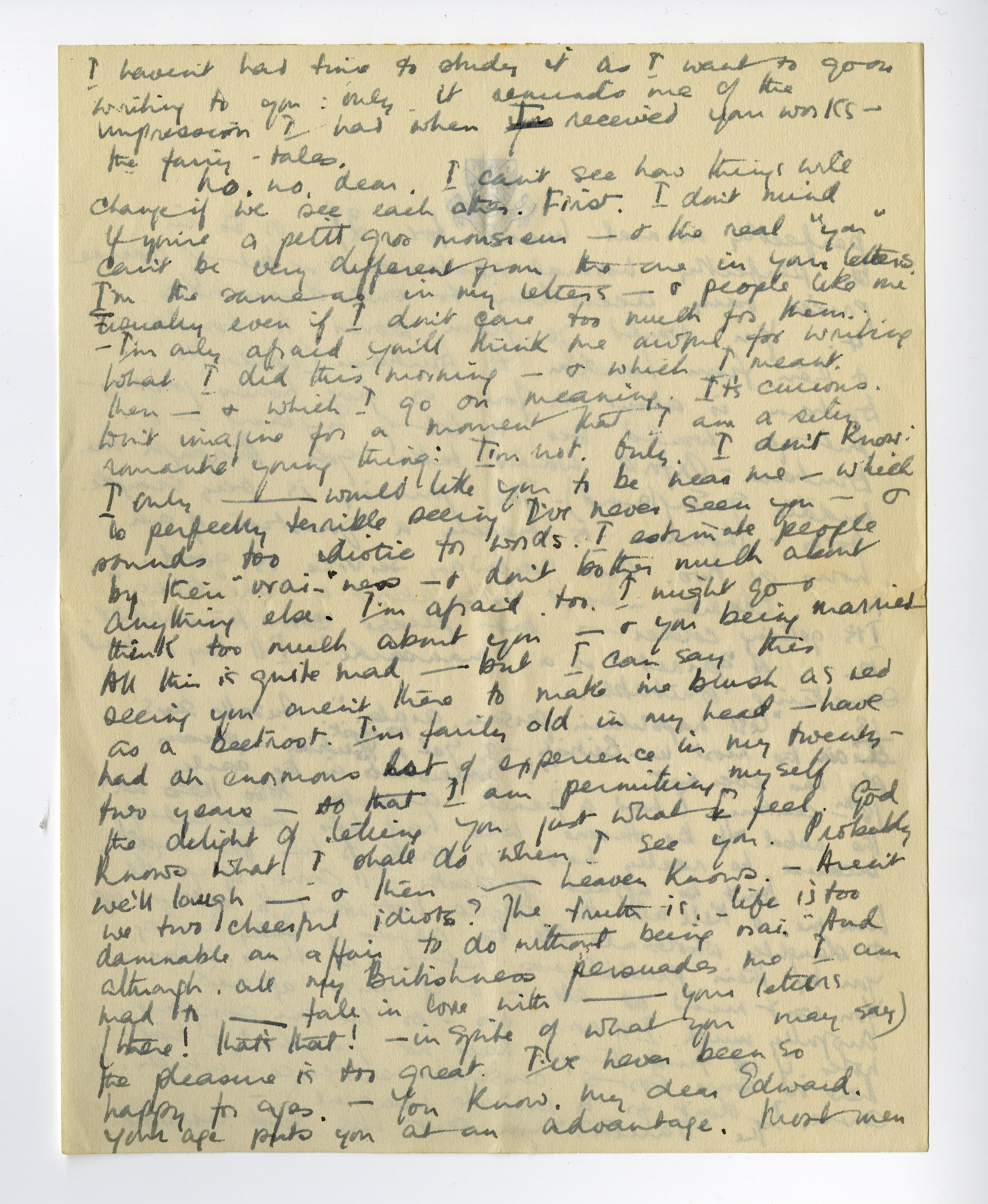 No, no, dear, I can't see how things will change if we see each other. First, I don't mind if you're a petit gros monsieur - & the real ‘you’ can't be very different from the one in your letters. I'm the same as in my letters - & people like me usually even if I don't care too much for them. - I'm only afraid you'll think me awful for writing what I did this morning - & which I meant then - & which I go on meaning. It's curious. Don't imagine for a moment that I am a silly romantic young thing: I'm not. Only, I don't know. I only - would like you to be near me - which is perfectly terrible seeing I've never seen you - & sounds too idiotic for words. I estimate people by their ‘vrai'-ness - & don't bother much about anything else. I'm afraid, too, I might go & think too much about you - & you being married. All this is quite mad - but I can say this seeing you aren't there to make me blush as red as a beetroot. I'm fairly old in my head - have had an enormous lot of experience in my twenty-two years - so that I am permitting myself the delight of telling you just what I feel. God knows what I shall do when I see you. Probably we'll laugh - & then - heaven knows. - Aren't we two cheerful idiots? The truth is, - life is too damnable an affair to do without being ‘vrai’. And although all my Britishness persuades me I am mad to - fall in love with - your letters (there! That's that! - in spite of what you may say) the pleasure is too great. I've never been so happy for ages. - You know, my dear Edward, your age puts you at an advantage. Most men I like in a maternal way (I mean, those I like) but I can't look up to them somewhere. With you, I feel - right - that is, although I want to protect you from everything that hurts you (I wish I could operate on you to remove this awful fat that bothers you) & although you make me feel very maternal at times, - yet - I don't know - when I am tired I should like you to be there to put things right - for you understand so well everything. - Yes, I'm on the way to falling in love with you. Good God! Besides the deep sympathy & friendship, the jolly old mutual understanding. - God. God. God. I couldn't possibly say it. It would be too awful. - I told you this morning I actually gave huge sobs over your letters - &, my God, if you'd been here. I - you - would have embraced all the beastly suffocation away. -