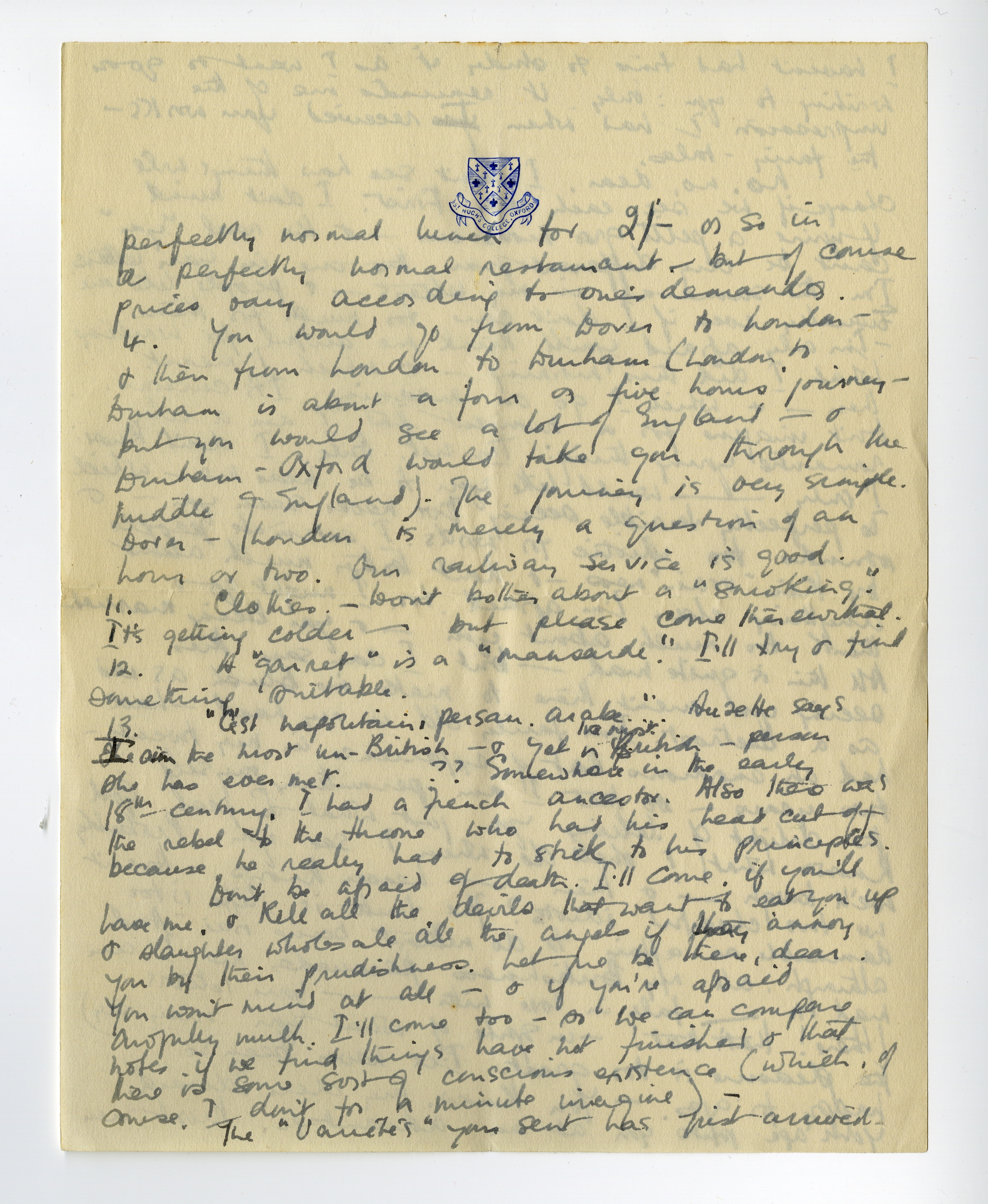 9. And now for your projected visit to England. What I should like would be for you to come to Durham round about the 24th of November. I have to go up on the 18th - to sit an exam, - which is rather important as if the impression I give is a good one I shall be elected ‘Fellow of the University of Durham’ (be it added, this is the highest honour any University can give its children). Of course, my general acquisitions will count for a lot - but the ‘vieilles barbes’ of Durham insist on this examination - & one never knows what might happen. Now, if you could manage to come on the last day of my examination we could have a perfectly delightful couple of days more together in Durham - pay a flying visit to some very ‘vrais’ people in Sunderland nearby, if you liked - people of your own age & very liberal, therewithal - & then come down to Oxford - where I should hope to keep you as long as possible. I told you I shall be going to London on Dec. 7th - & then over to Belgium. Tell me what you think of all this.