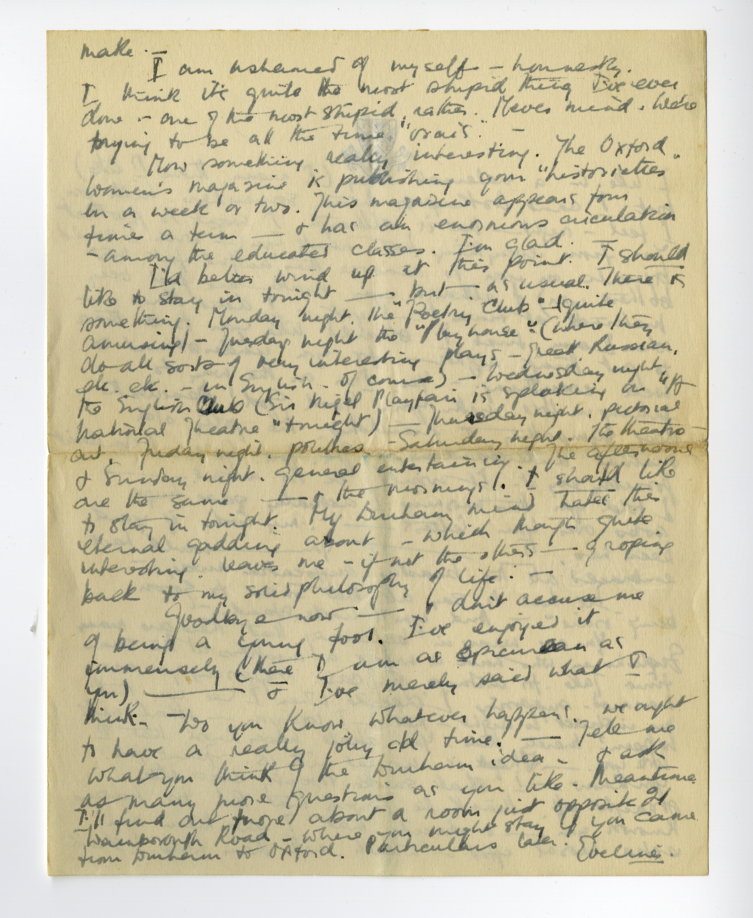 Goodbye now - & don't accuse me of being a young fool. I've enjoyed it immensely (there I am as Epicurean as you) - & I've merely said what I think. - Do you know, whatever happens, we ought to have a really jolly old time!! - Tell me what you think of the Durham idea - & ask as many more questions as you like. Meantime I'll find out more about a room just opposite 21 Warnborough Road - where you might stay if you come from Durham to Oxford. Particulars later.
