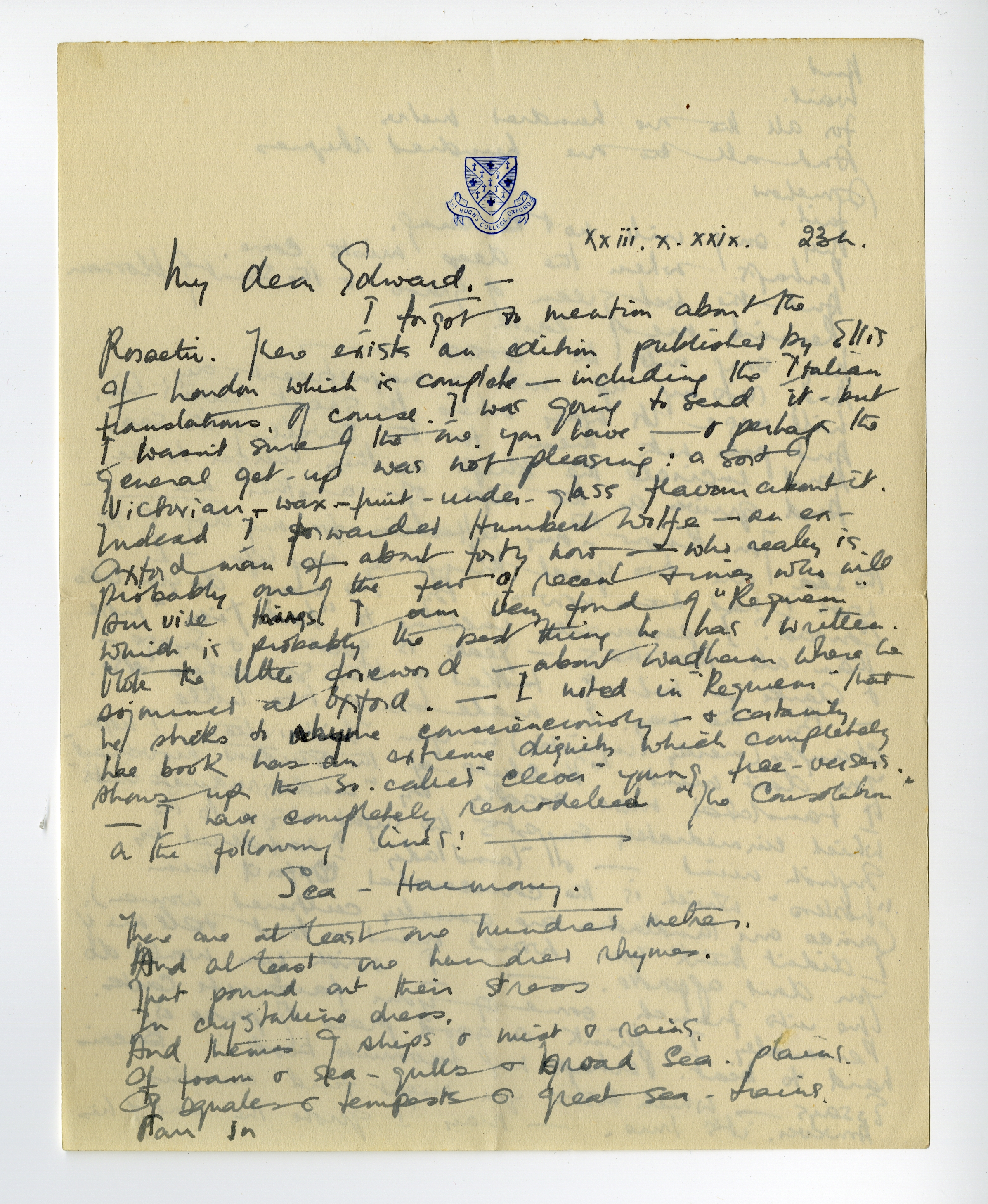 I forgot to mention about the Rossetti. There exists an edition published by Ellis of London which is complete - including the Italian translations, of course. I was going to send it - but I wasn't sure of the one you have - & perhaps the general get-up was not pleasing: a sort of Victorian-wax-fruit-under-glass flavour about it. Instead I forwarded Humbert Wolfe - an ex-Oxford man of about forty now - who really is probably one of the few of recent times who will survive things. I am very fond of Requiem which is probably the best thing he has written. Note the little foreword - about Wadham where he sojourned at Oxford. - I noted in Requiem that he sticks to rhyme conscientiously - & certainly the book has an extreme dignity which completely shows up the so-called ‘clever’ young free-versers. - I have completely remodelled ‘The Consolation’ on the following lines! -