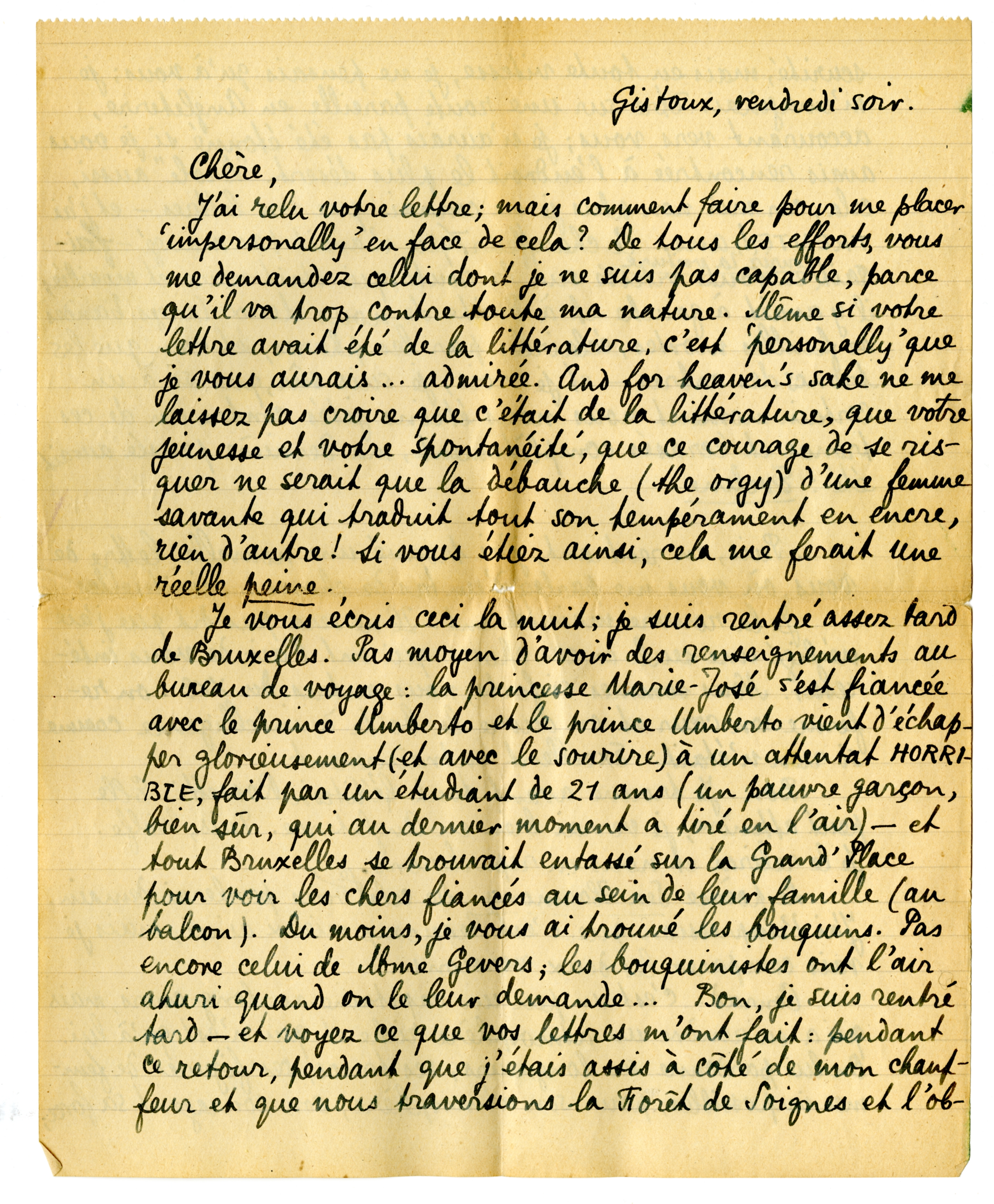 Je vous écris ceci dans la nuit: je suis rentré asssez tard de Bruxelles. Pas moyen d'avoir des renseignements au bureau de voyage: la princesse Marie-José s'est fiancée avec le prince Umberto et le prince Umberto vient d'échapper glorieusement (et avec le sourire) à un attentat HORRIBLE, fait par un étudiant de 21 ans (un pauvre garçon, bien sûr, qui au dernier moment a tiré en l'air) - et tout Bruxelles se trouvait entassé sur la Grand'Place pour voir les chers fiancés au sein de leur famille (au balcon). Du moins, je vous ai trouvé les bouquins. Pas encore celui de Mme Gevers, les bouquinistes ont l'air ahuri quand on le leur demande .... Bon, je suis rentré tard - et voyez ce que vos lettres m'ont fait: pendant ce retour, pendant que j'étais assis à côté de mon chauffeur et que nous traversions la Forêt de Soignes et l'obscurité, mais en toute vitesse, je ne pensais qu'à vous; je m'imaginais être sur une route pareille en Angleterre, accourant vers vous; je n'aurais pas été étonné si je vous avais rencontrée à l'endroit le plus désert. ‘Drôle’ aussi, cela, car moi non plus je ne connais que vos lettres - et j'ai TRENTE(!) ans. Ce chauffeur - qui n'avait pas mangé - faisait courir la voiture en toute vitesse sur la route qui était noire et mouillée; il y avait à gauche et à droite de nous deux larges bandes de feuilles mortes, éclairées par les phares, et rien que les troncs des arbres - et je crois, je suis sûr, que si à un certain moment nous nous étions jetés contre un de ces troncs et écrasés complètement, ma dernière pensée aurait été: Eveline.