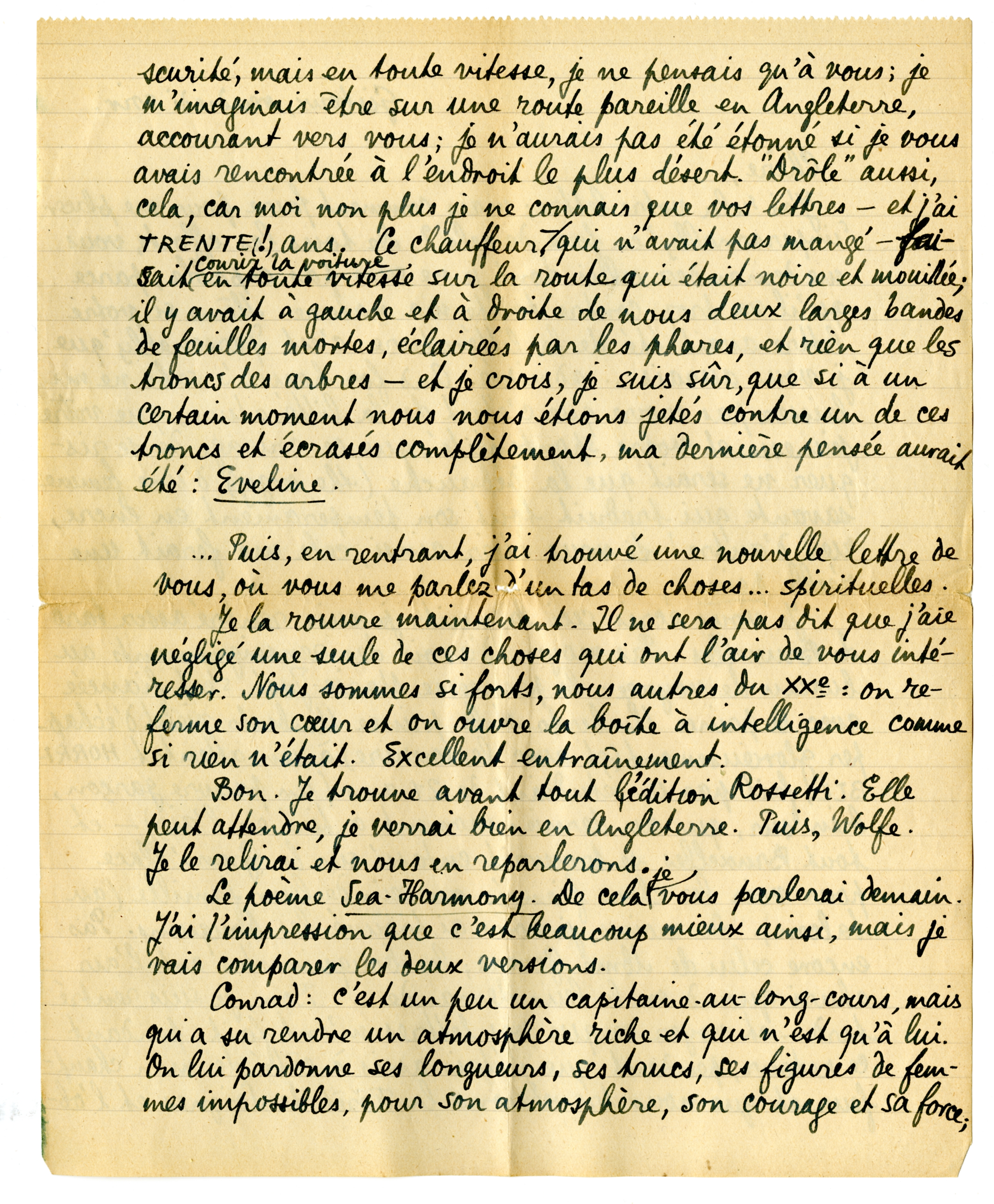 Ce soir je me sens seul à mon tour - parce que vous n'êtes pas là. Vous m'avez gâté, c'est de votre faute peut-être. J'ai l'impression que ce serait terrible si vous deviez me manquer, si vous pouviez ne pas être là à l'heure de ma mort. (C'est pourtant probable!) Dites que, quoi qu'il arrive, pour longtemps à venir vous serez mon amie, que vous resterez dans une certaine mesure la grande Amie Inconnue qu'on appelle à l'heure de la mort. Si on m'avait dit, il y a 6 mois, que cette Amie-là prendrait la figure d'une jeune fille d'Oxford, j'aurais pouffé de rire. En ce moment j'admets - j'ai la folie de croire que c'est ainsi, que cette Amie est anglaise (with a good streak of Celtish blood in her veins), qu'elle a 22 ans, qu'elle s'appelle Eveline.