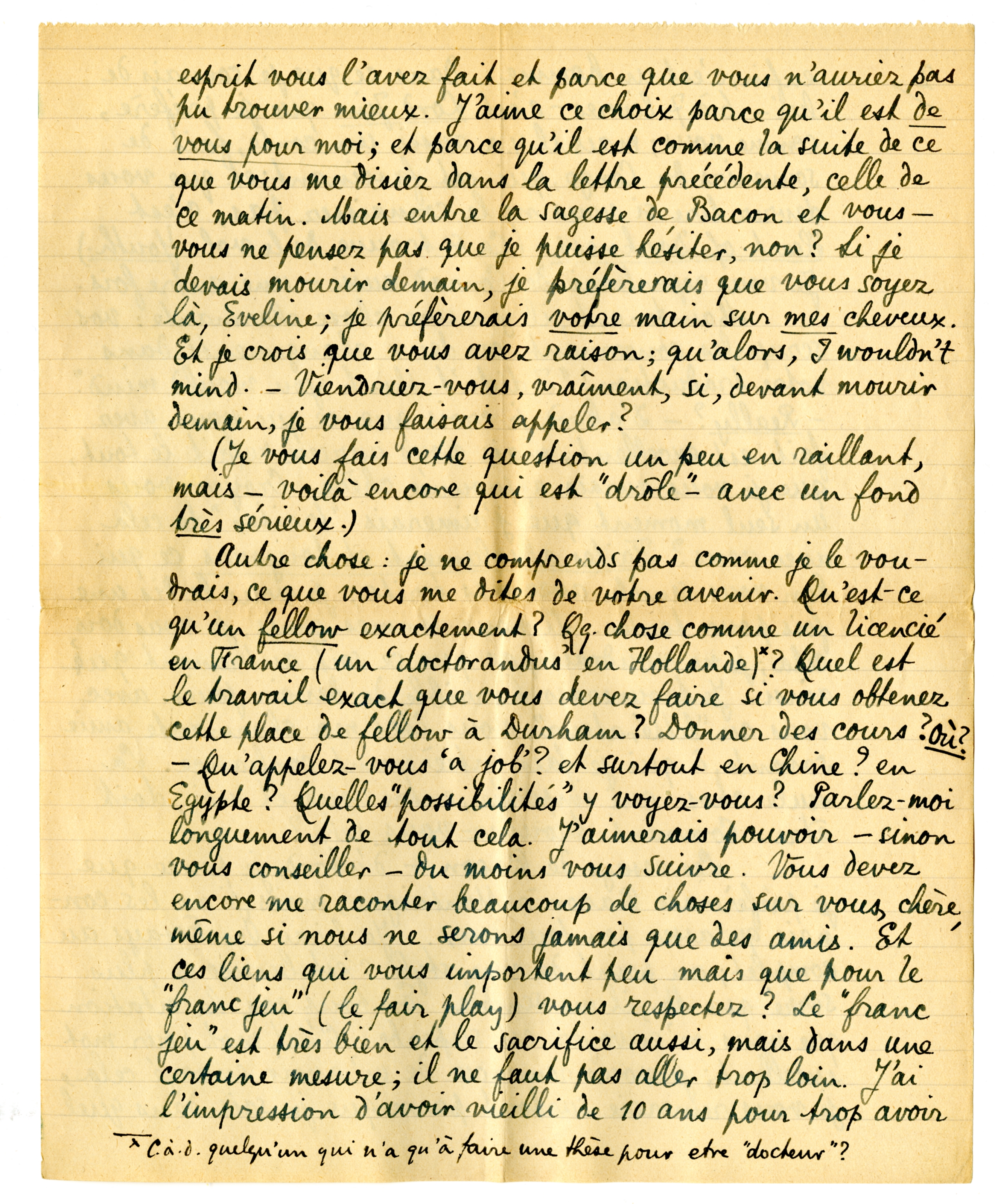 Autre chose: je ne comprends pas comme je le voudrais, ce que vous me dites sur votre avenir. Qu'est-ce qu'un fellow exactement? Qq. chose comme un licencié en France (un ‘doctorandus’ en Hollande)*? Quel est le travail exact que vous devez faire si vous obtenez cette place de fellow à Durham? Donner des cours? Où? - Qu'appelez-vous ‘a job’? et surtout en Chine? en Egypte? Quelles ‘possibilités’ y voyez-vous? Parlez-moi longuement de tout cela. J'aimerais pouvoir - sinon vous conseiller - du moins vous suivre. Vous devez encore me raconter beaucoup de choses sur vous, chère, même si nous ne serons jamais que des amis. Et ces liens qui vous importent peu mais que pour le ‘franc jeu’ (le fair play) vous respectez? le ‘franc jeu’ est très bien et le sacrifice aussi, mais dans une certaine mesure; il ne faut pas aller trop loin. J'ai l'impression d'avoir vieilli de 10 ans pour trop avoir compté avec ce genre de ‘franc jeu’ dont vous parlez. Il n'y a peut-être rien de si difficile que de distinguer où l'on n'a été qu'un bas-égoïste, et où l'on se devait de ne tenir compte qu'avec soi. Cette mort de mon père a pour moi embrouillé plusieurs choses; - je ne puis juger de votre situation, mais je voudrais vous dire qu'il ne faut jamais se laisser gâter la vie par une pitié déplacée pour quelques ‘autres’; on ne vit qu'une fois (comme le disaient si bien tous ces vieux bonshommes), on devient vieux avant de le savoir. Je vous parle comme si vouis étiez moi(!) C'est peut-être ridicule. Si vous le trouvez ainsi, il faut pardonner à mon amitié, chère, il faut vous dire: ‘Il raisonne un peu lâchement, il est un peu British aussi, mais enfin, il me veut du bien à sa façon.’