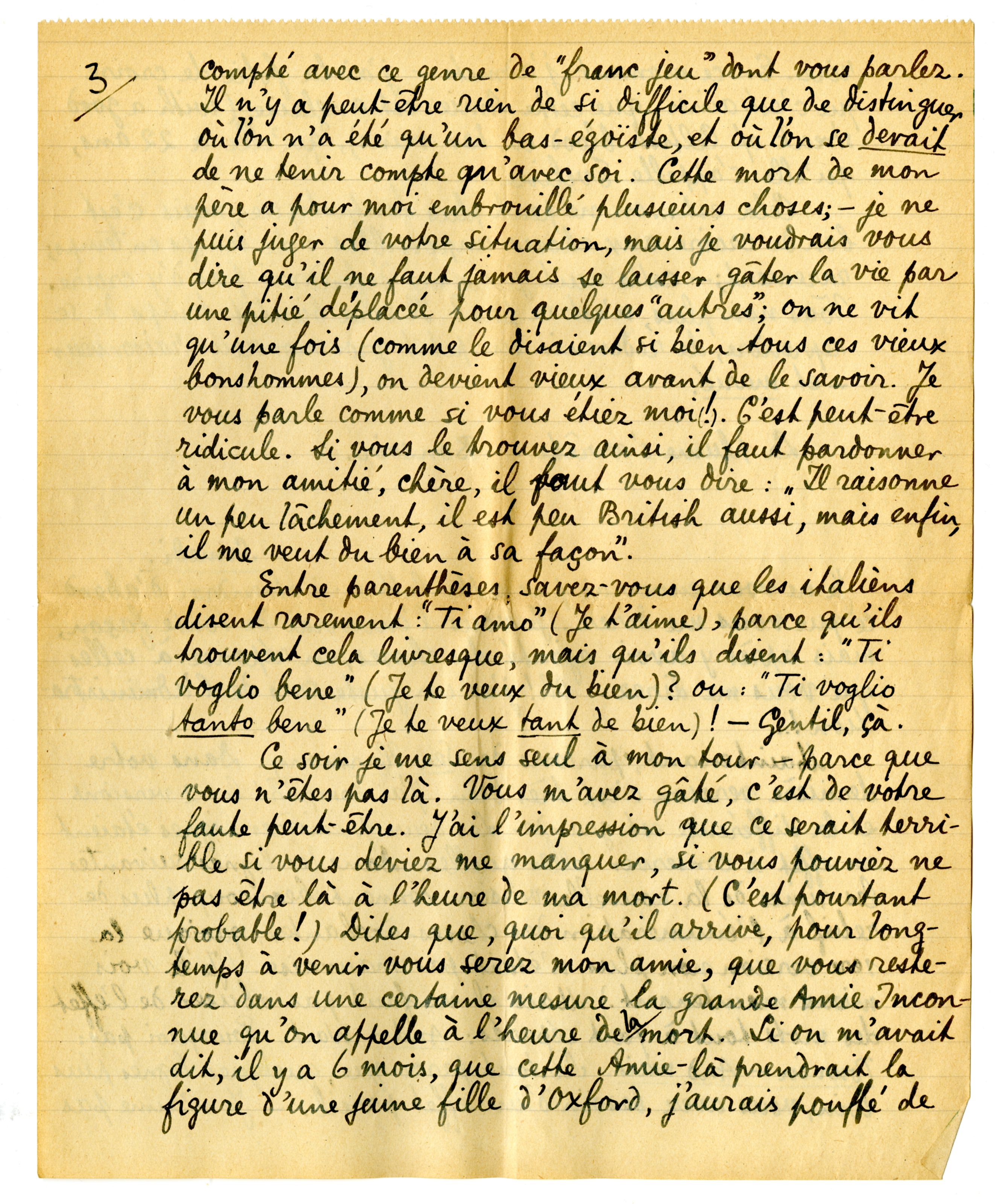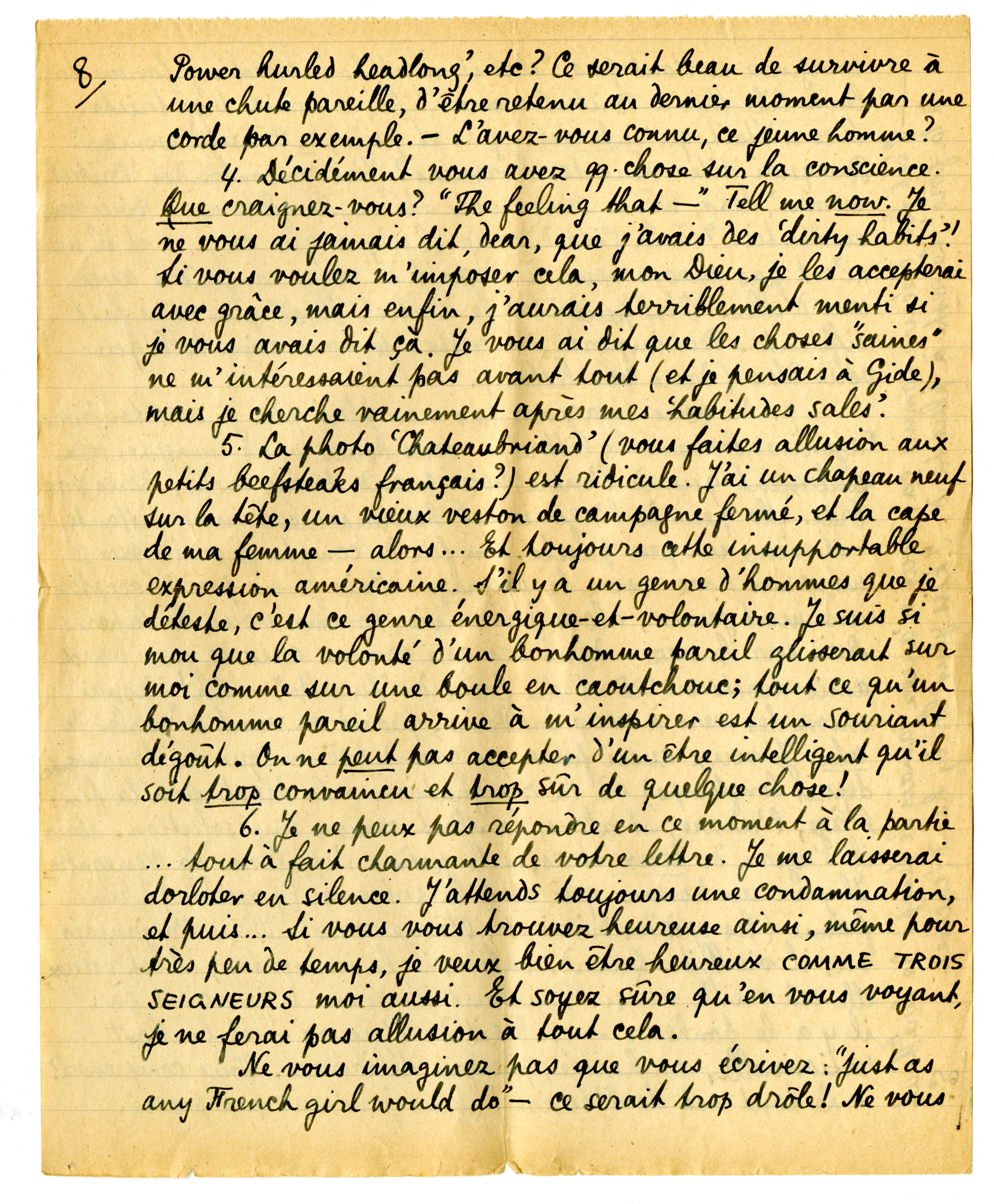 J'ai relu votre lettre; mais comment faire pour me placer ‘impersonally’ en face de cela? De tous les efforts, vous me demandez celui dont je ne suis pas capable, parce qu'il va trop contre toute ma nature. Même si votre lettre avait été de la littérature, c'est ‘personally’ que je vous aurais... admirée. And for heaven's sake ne me laissez pas croire que c'était de la littérature, que votre jeunesse et votre spontanéité, que ce courage de se risquer ne serait que la débauche (the orgy) d'une femme savante qui traduit tout son tempérament en encre, rien d'autre! Si vous étiez ainsi, cela me ferait une réelle peine