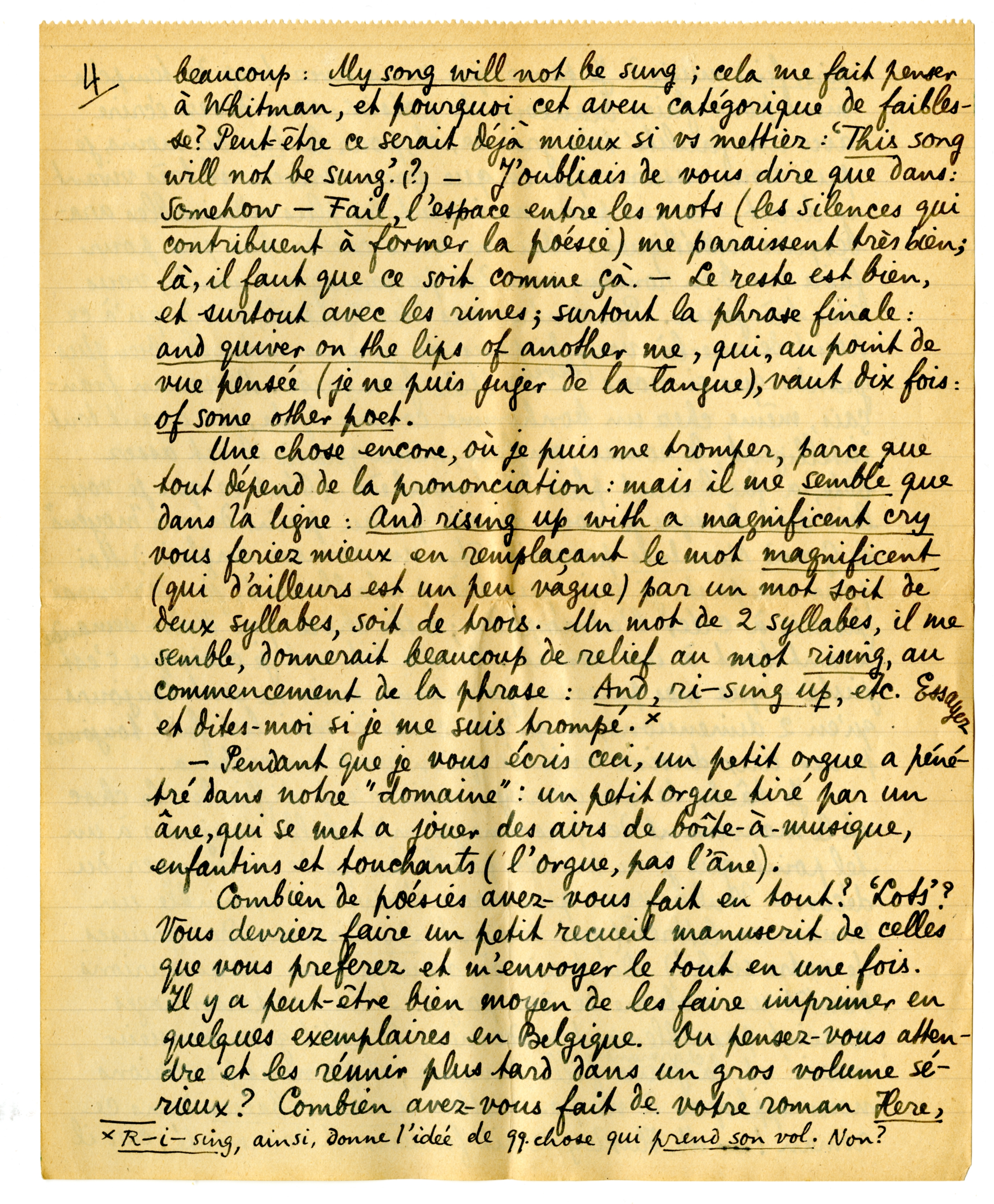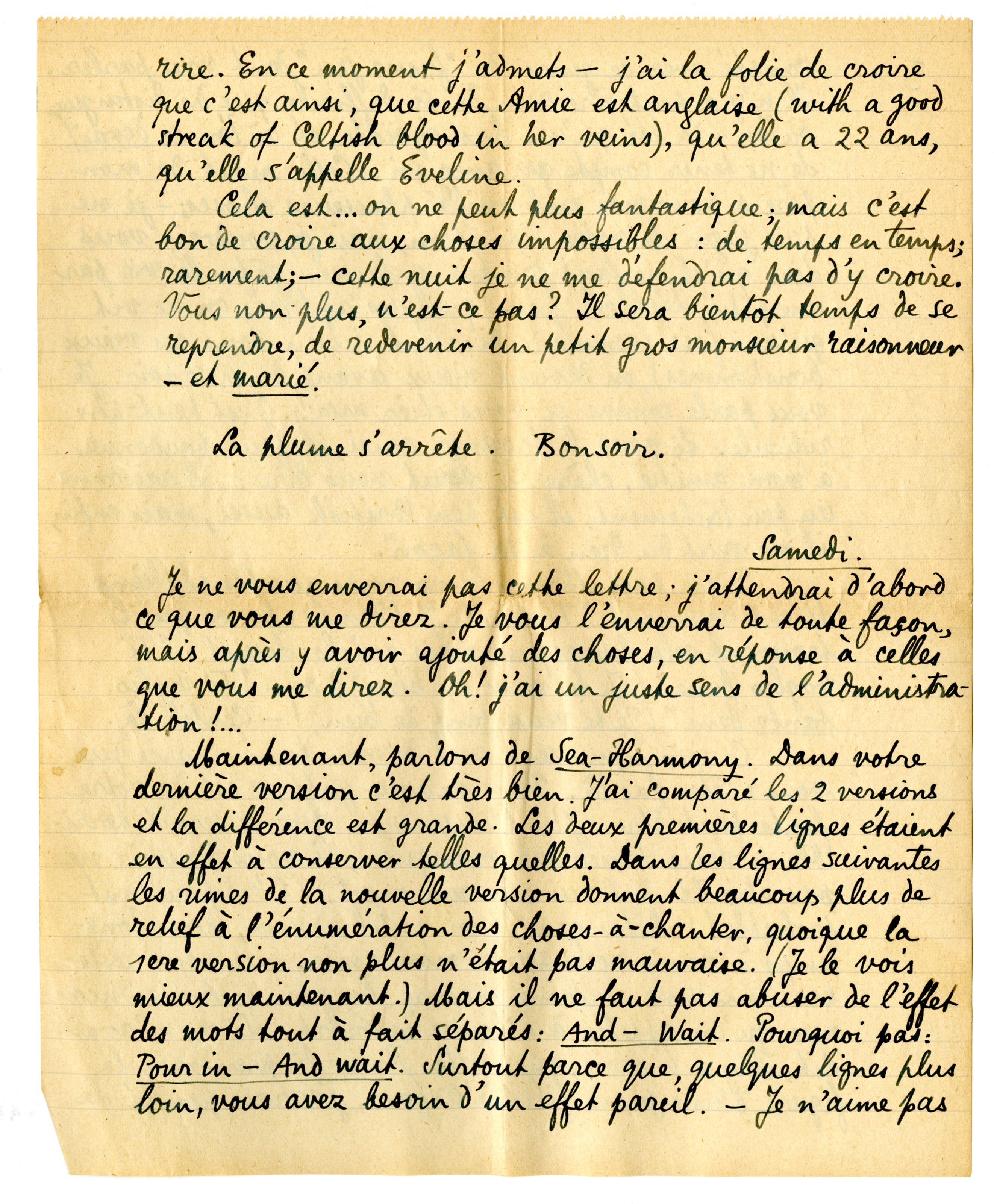 Maintenant, parlons de Sea-Harmony. Dans votre dernière version c'est très bien. J'ai comparé les 2 versions et la différence est grande. Les deux premières lignes étaient en effet à conserver telle quelles. Dans les lignes suivantes les rimes de la nouvelle version donnent beaucoup plus de relief à l'énumération des choses-à-chanter, quoique la lere version non plus n'était pas mauvaise. (Je le vois mieux maintenant.) Mais il ne faut pas abuser de l'effet des mots tout à fait séparés: And - Wait. Pourquoi pas: Pour in - And wait. Surtout parce que, quelques lignes plus loin, vous avez besoin d'un effet pareil. - Je n'aime pas beaucoup: My song will not be sung; cela me fait penser à Whitman, et pourquoi cet aveu catégorique de faiblesse? Peut-être ce serait déjà mieux si vs mettiez: ‘This song will not be sung’. (?) - J'oubliais de vous dire que dans: Somehow - Fail, l'espace entre les mots (les silences qui contribuent à former la poésie) me paraissent très bien; là, il faut que ce soit comme çà. - Le reste est bien, et surtout avec les rimes; surtout la phrase finale: and quiver on the lips of another me, qui, au point de vue pensée (je ne puis juger de la langue), vaut dix fois: of some other poet.