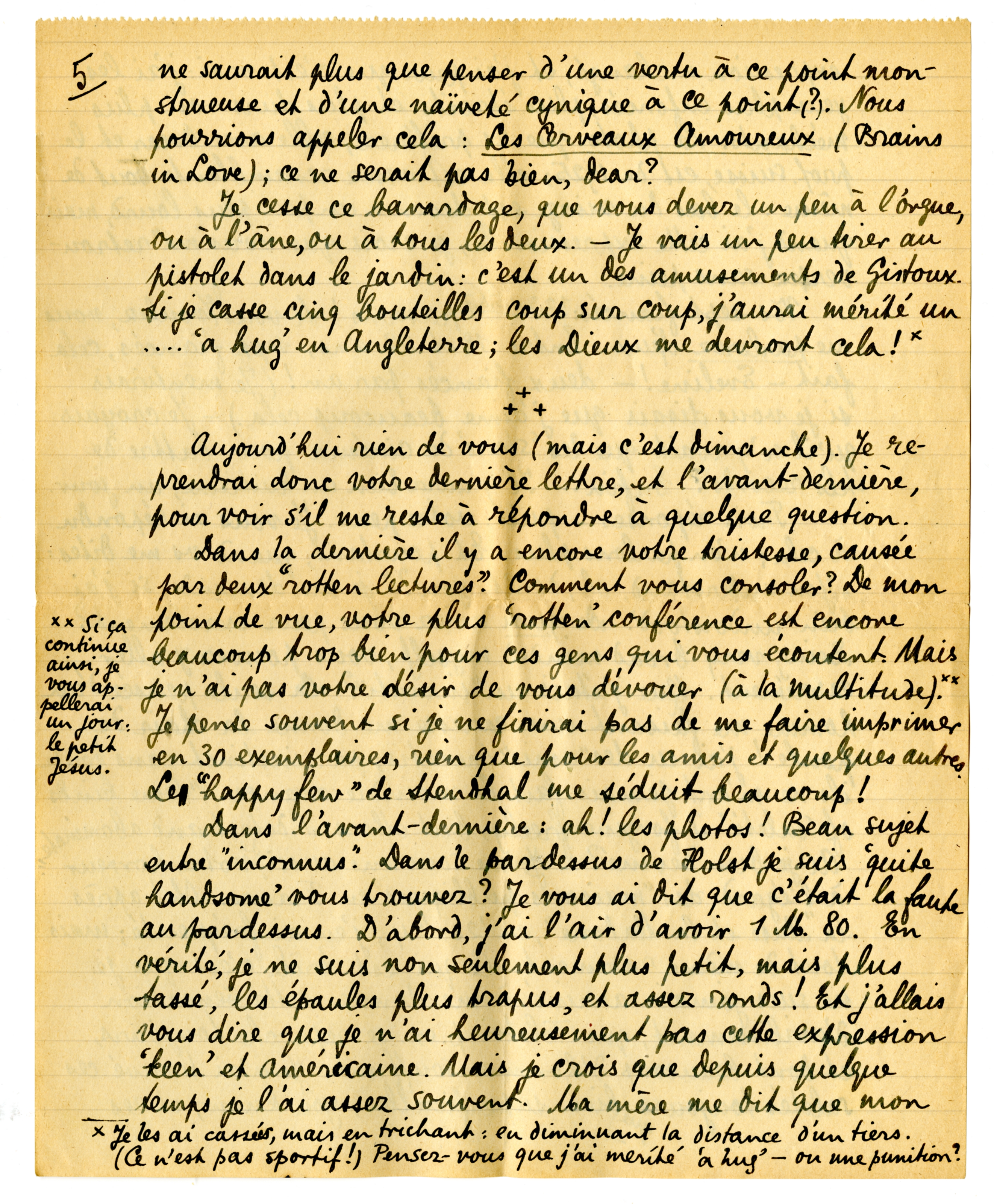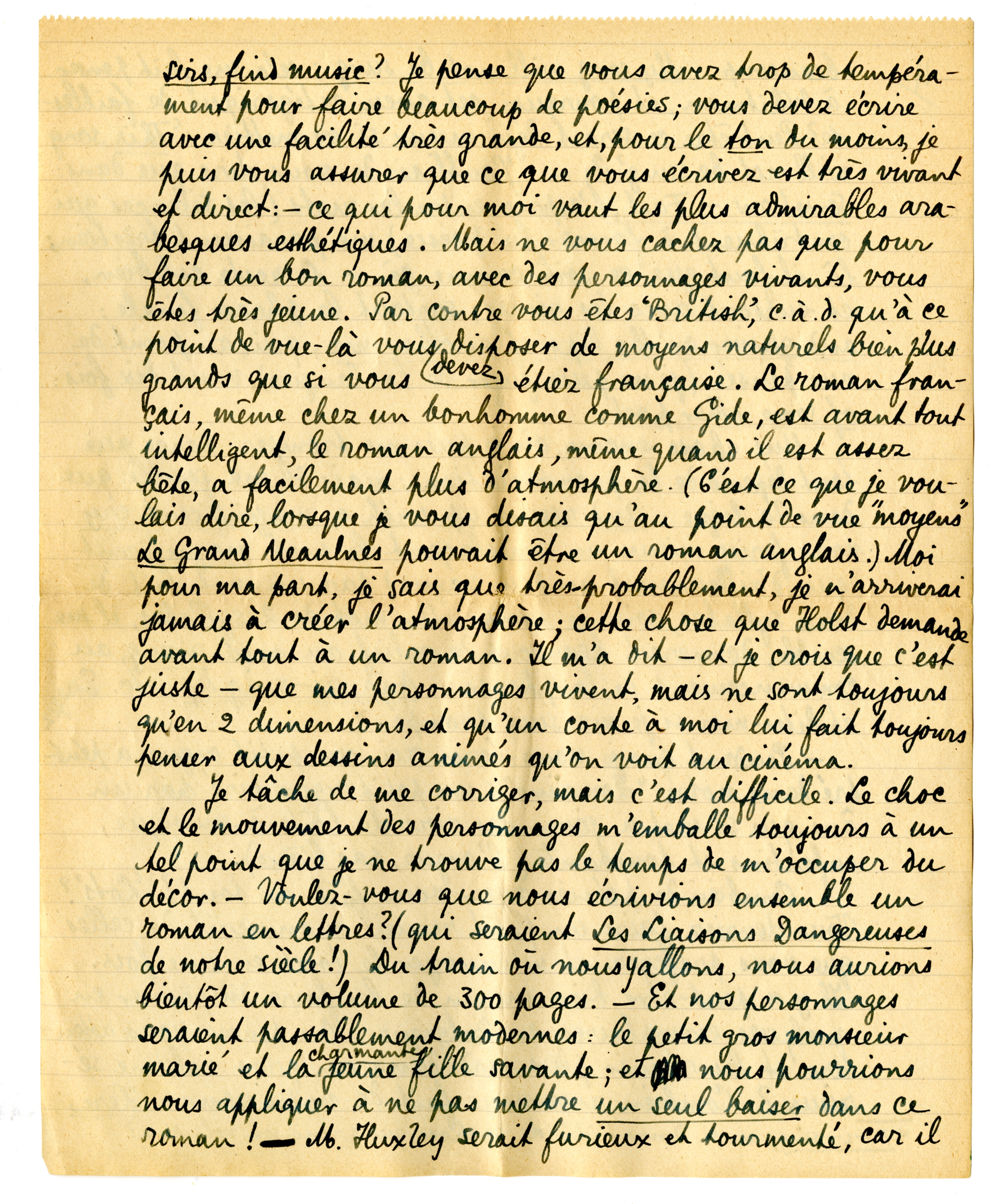 Je tâche de me corriger, mais c'est difficile. Le choix et le mouvement des personnages m'emballe toujours à un tel point que je ne trouve pas le temps de m'occuper du décor. - Voulez‘vous que nous écrivions ensemble un roman en lettres? (qui seraient Les Liaisons Dangereuses de notre siècle!) Du train où nous y allons, nous aurions bientôt un volume de 300 pages. - Et nos personnages seraient passablement modernes: le petit gros monsieur marié et la charmante jeune fille savante; et nous pourrions nous appliquer à ne pas mettre un seul baiser dans ce roman! - M. Huxley serait furieux et tourmenté, car il ne saurait plus que penser d'une vertu à ce point monstrueuse et d'une naïveté cynique à ce point (?). Nous pourrions appeler cela: Les Cerveaux Amoureux (Brains in Love); ce ne serait pas bien, dear?