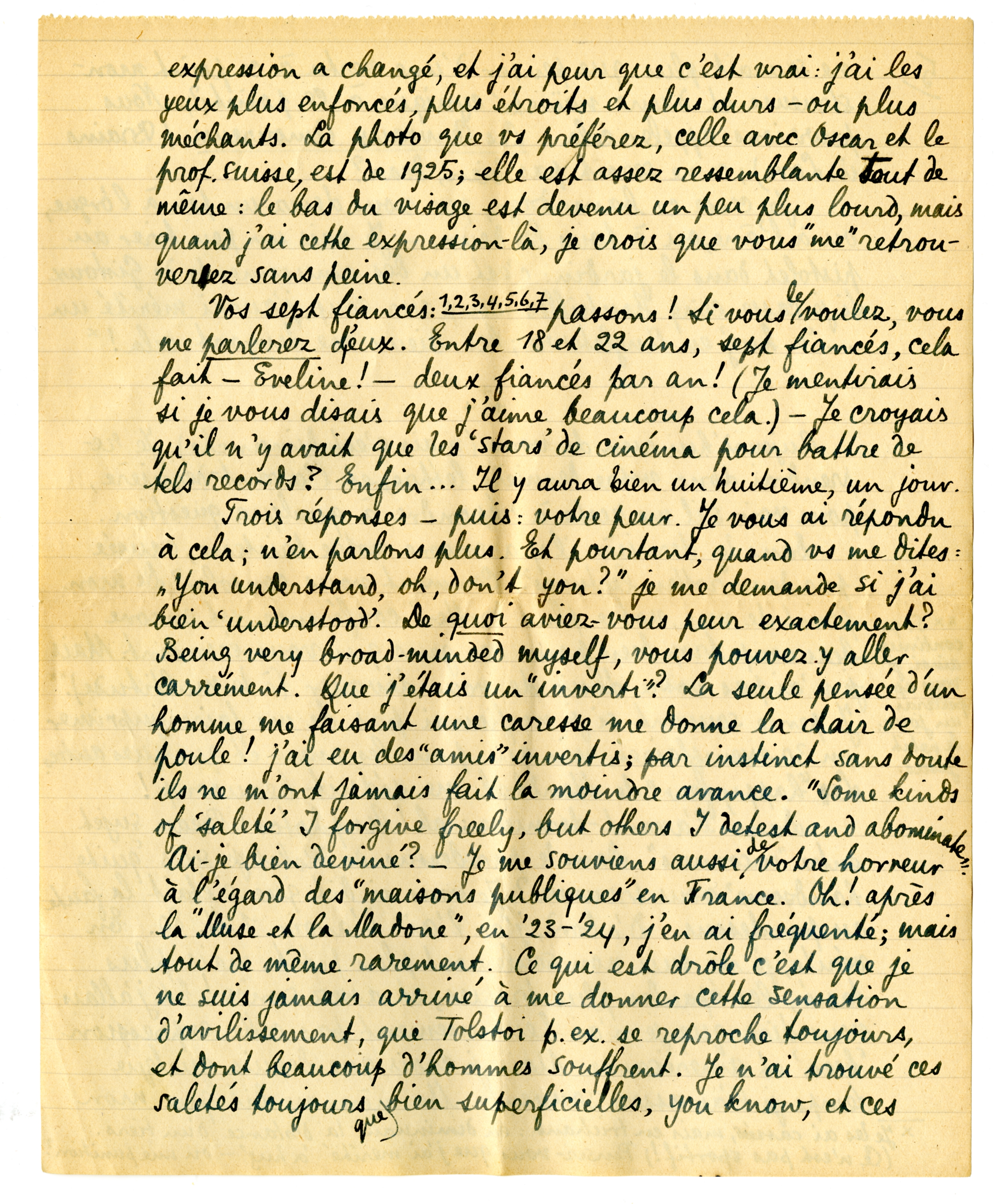 Trois réponses - puis: votre peur. Je vous ai répondu à cela; n'en parlons plus. Et pourtant, quand vs me dites: ‘You understand, oh, don't you?’ je me demande si j'ai bien ‘understood’. De quoi aviez-vous peur exactement? Being very broad-minded myself, vous pouvez y aller carrément. Que j'étais un ‘inverti’? La seule pensée d'un homme me faisant une caresse me donne la chair de poule! j'ai eu des ‘amis’ invertis; par instinct sans doute ils ne m'ont jamais fait la moindre avance. 'Some kinds of ‘saleté’ I forgive freely, but others I detest and abominate. Ai-je bien deviné? - Je me souviens aussi de votre horreur à l'égard des ‘maisons publiques’ en France. Oh! après la ‘Muse et la Madone’, en '23- '24, j'en ai fréquenté; mais tout de même rarement. Ce qui est drôle c'est que je ne suis jamais arrivé à me donner cette sensation d'avilissement, que Tolstoi p. ex. se reproche toujours, et dont beaucoup d'hommes souffrent. Je n'ai trouvé ces saletés toujours que bien superficelles, you know, et ces femmes surtout pitoyables. Elles sont bêtes, elles sont le plus souvent laides, elles ont si peu d'âme! Quand on leur parle, c'est comme si on parlait avec des petites filles qui auraient le sens des affaires. ‘Le bisnèze, quoi’? - c'est comme çà qu'elles disent, depuis les américains. Au point de vue érotique, pour quelqu'un qui se distingue un peu de l'animal, elles n'existent pas: la première chose en érotisme (je vous parle ‘scientifiquement’) étant le plaisir qu'on procure en échange de celui qu'on obtient. Pour un homme un peu fin, il me semble, une femme immunisée au plaisir cesse d'être une femme. C'est pourquoi les ‘maisons publiques’, dont vous avez l'horreur, seraient - même si les femmes y étaient fraîches et belles - une chose bien piteuse, au point de vue érotique; et quant au ‘vices sécrets’, ce sont des vices bien bon-marché qu'on pourrait trouver là.*****