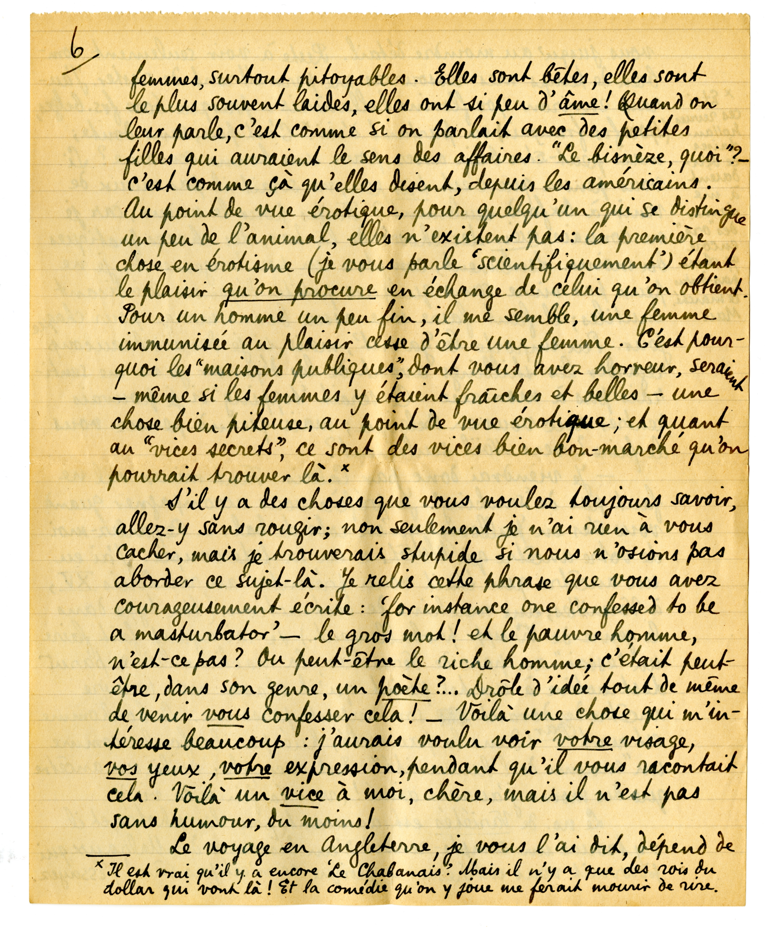 S'il y a des choses que vous voulez toujours savoir, allez-y sans rougir; non seulement je n'ai rien à vous cacher, mais je trouverais stupide si nous n'osions pas aborder ce sujet‘là. Je relis cette phrase que vous avez couragement écrite: ‘for instance one confessed to be a masturbator’ - le gros mot! et le pauvre homme. n'est-ce pas? Ou peut-être le riche homme; c'était peut-être, dans son genre, un poète?... Drôle d'idée tout de même de venir vous confesser cela! - Voilâ une chose qui m'intéresse beaucoup: j'aurais voulu voir votre visage, vos yeux, votre expression, pendant qu'il vous racontait cela. Voilà un vice à moi, chère, mais il n'est pas sans humour, du moins!