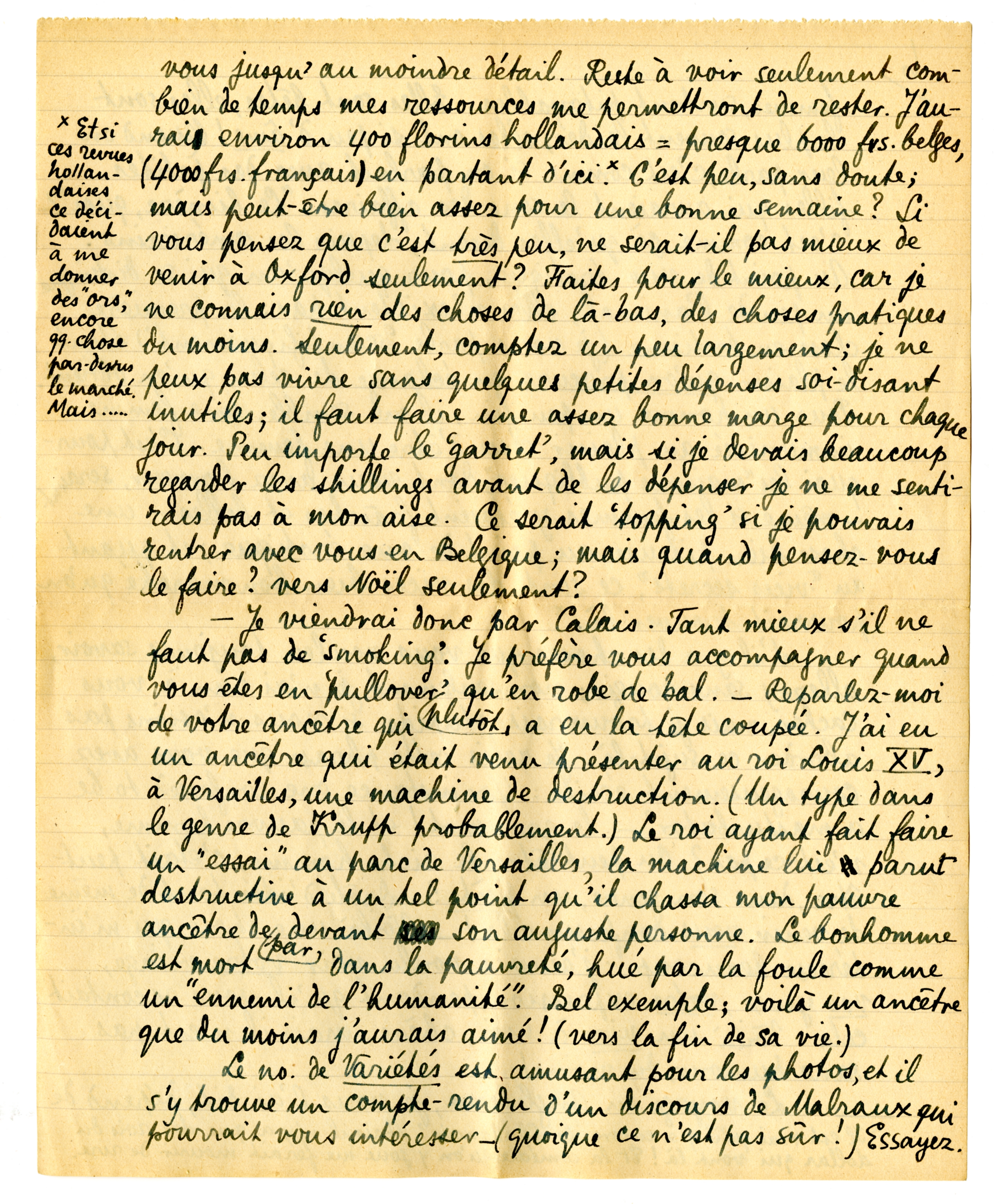- Je viendrai donc par Calais. Tant mieux s'il ne faut pas de ‘smoking’. Je préfère vous accompagner quand vous êtes en ‘pullover’ plutôt qu'en robe de bal. - Reparlez-moi de votre ancêtre, qui a eu la tête coupée. J'ai eu un ancêtre qui était venu présenter au roi Louis XV, à Versailles, une machine de destruction. (Un type dans le genre de Krupp probablement.) Le roi ayant fait faire un ‘essai’ au parc de Versailles, la machine lui parut destructive à un tel point qu'il chassa mon pauvre ancêtre de par-devant son auguste personne. Le bonhomme est mort dans la pauvreté, hué par la foule comme un ‘ennemi de l'humanité’. Bel exemple; voilà un ancêtre que du moins j'aurais aimé! (vers la fin de sa vie.)
