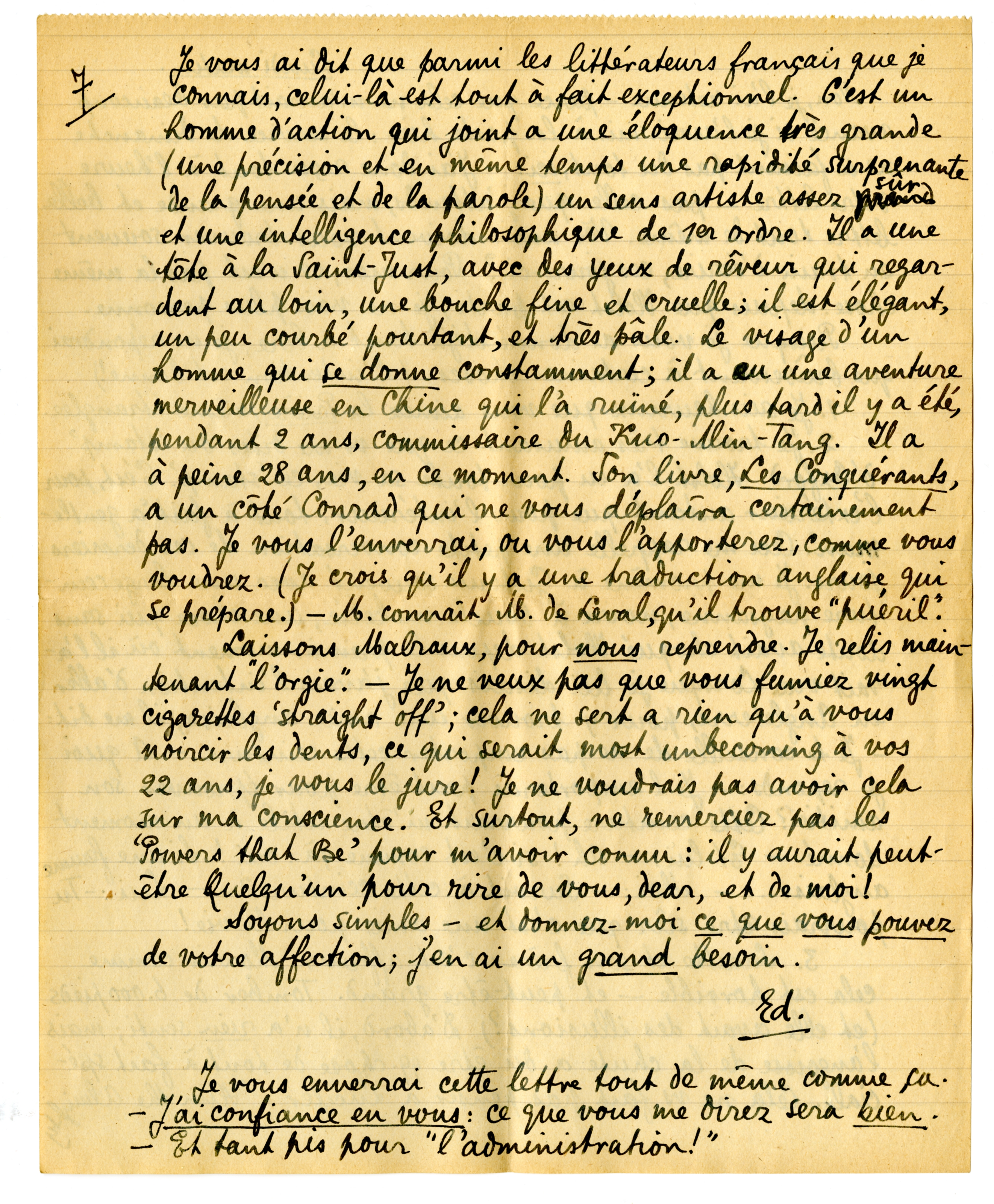 Laissons Malraux, pour nous reprendre. Je relis maintenant ‘l'orgie’. - Je ne veux pas que vous fumiez vingt cigarettes ‘straight off’; cela ne sert à rien qu'à vous noircir les dents, ce qui serait most unbecoming à vos 22 ans, je vous le jure! Je ne voudrais pas avoir cela sur ma conscience. Et surtout, ne remerciez pas les ‘Powers that Be’ pour m'avoir connu: il y aurait peut-être Quelqu'un pour rire de vous, dear, et de moi!