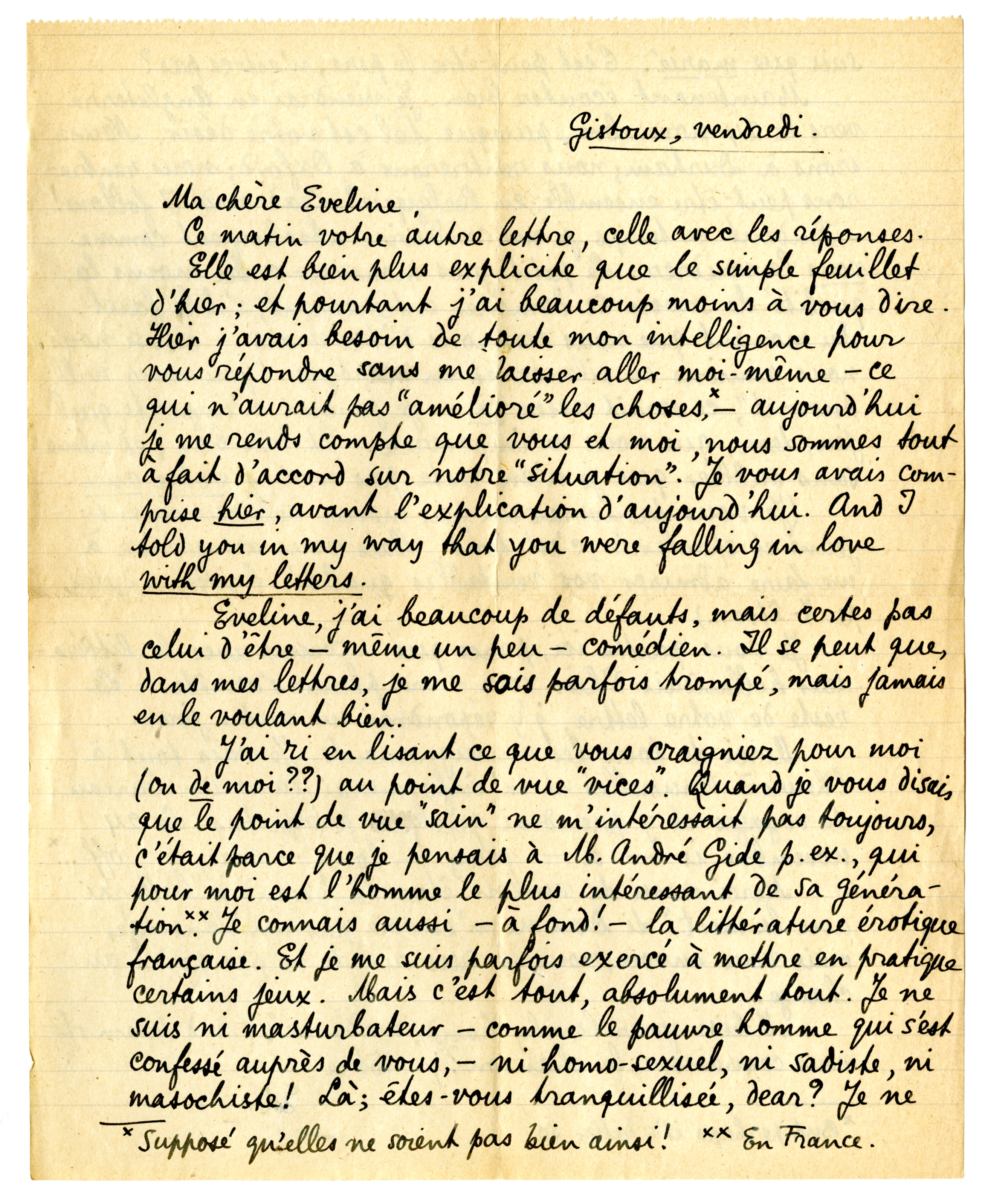 J'ai ri en lisant ce que vous craigniez pour moi (ou de moi??) au point de vue ‘vices’. Quand je vous disais que le point de vue ‘sain’ ne m'intéressait pas toujours, c'était parce que je pensais à M. André Gide p. ex., qui pour moi est l'homme le plus intéressant de sa génération**. Je connais aussi à fond! - la littérature érotique française. Et je me suis parfois exercé à mettre en pratique certains jeux. Mais c'est tout, absolument tout. Je ne suis ni masturbateur - comme le pauvre homme qui s'est confessé auprès de vous, - ni homo-sexuel, ni sadiste, ni masochiste! Là; êtes-vous tranquillisée, dear? Je ne suis que marié. C'est peut-être le pire n'est-ce pas?