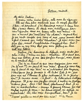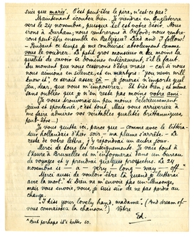 Elle est bien plus explicite que le simple feuillet d'hier; et pourtant j'ai beaucoup moins à vous dire. Hier j'avais besoin de toute mon intelligence pour vous répondre sans rue laisser aller moi-même - ce qui n'aurait pas ‘amélioré’ les choses*, - aujourd'hui je me rends compte que vous et moi, nous sommes tout à fait d'accord sur notre ‘situation’. Je vous avais comprise hier, avant l'explication d'aujourd'hui. And I told you in my way that you were falling in love with my letters.